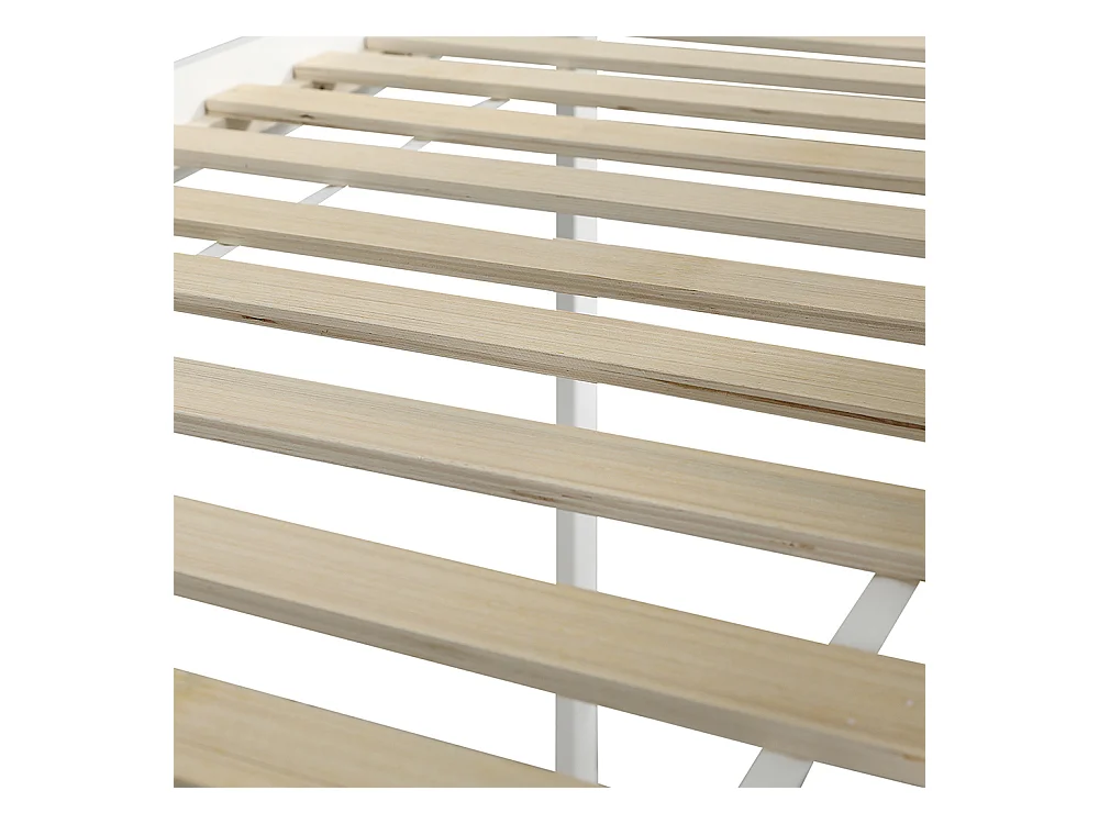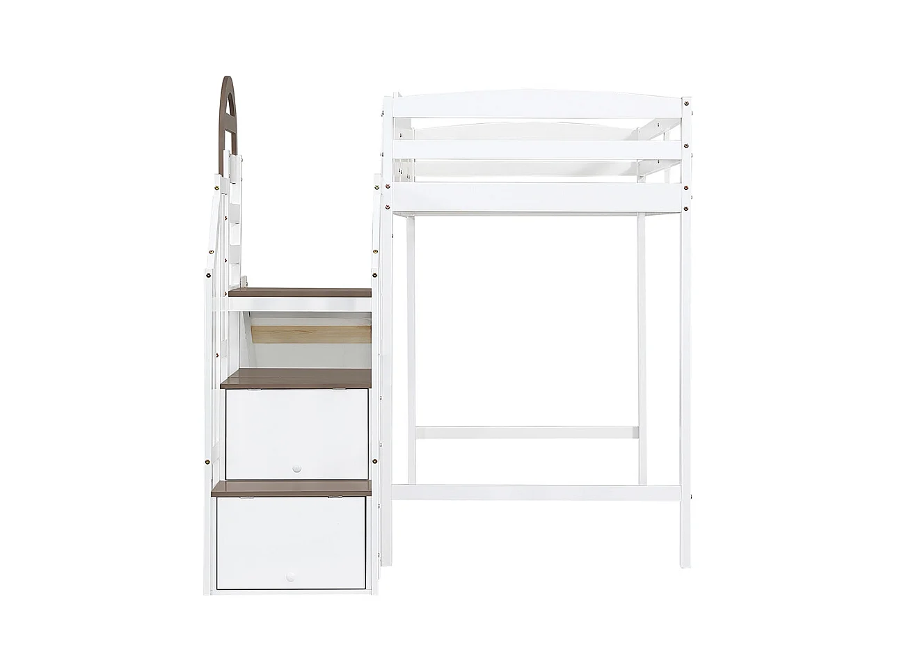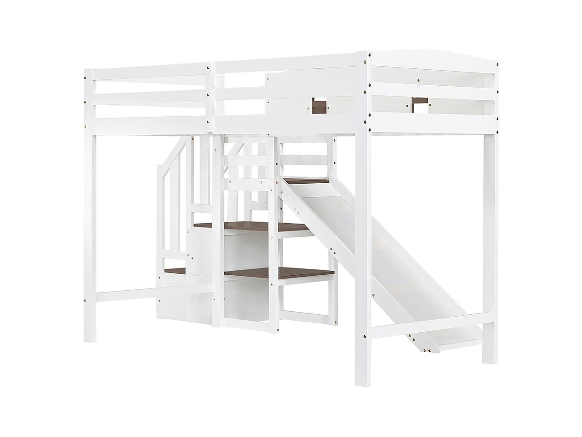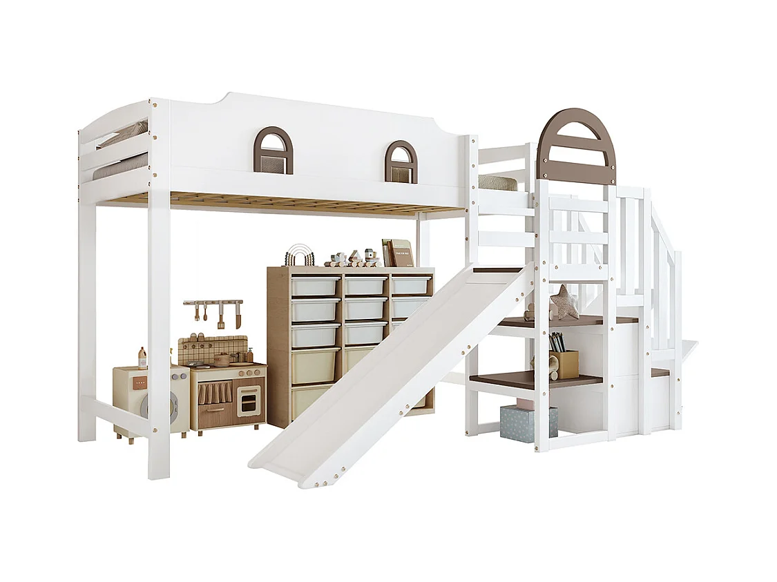 Lit superposé 90x200cm, lit d'enfant avec fenêtre et toboggan pour enfants, escalier avec main courante, avec 2 casiers dans l'escalier, pin+mdf, blanc+marron
