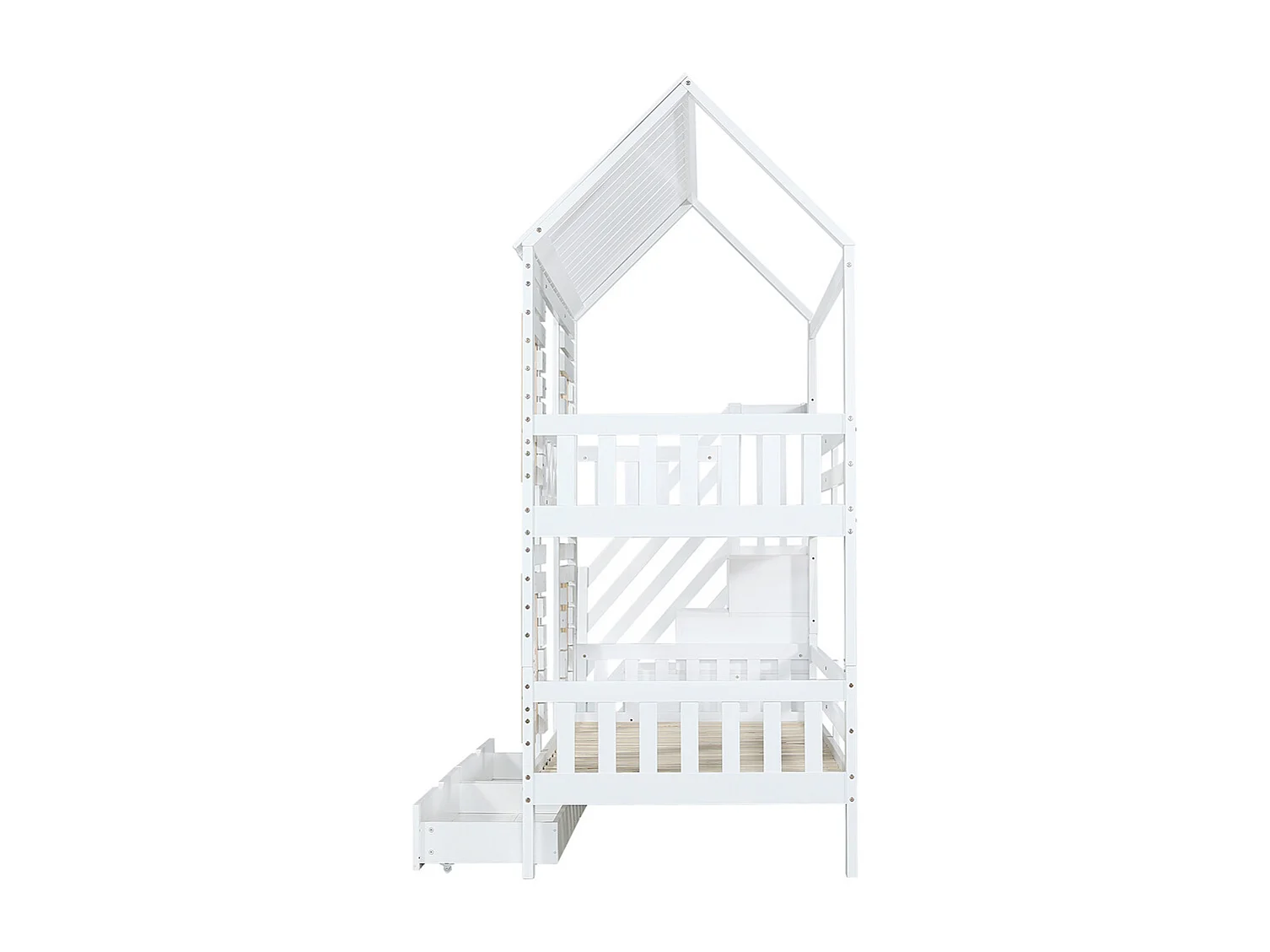 Lit superposé 90x200cm, lit enfant avec barrière de sécurité, fenêtre et deux tiroirs, escalier avec 4 compartiments de rangement, pin+MDF, blanc+naturel