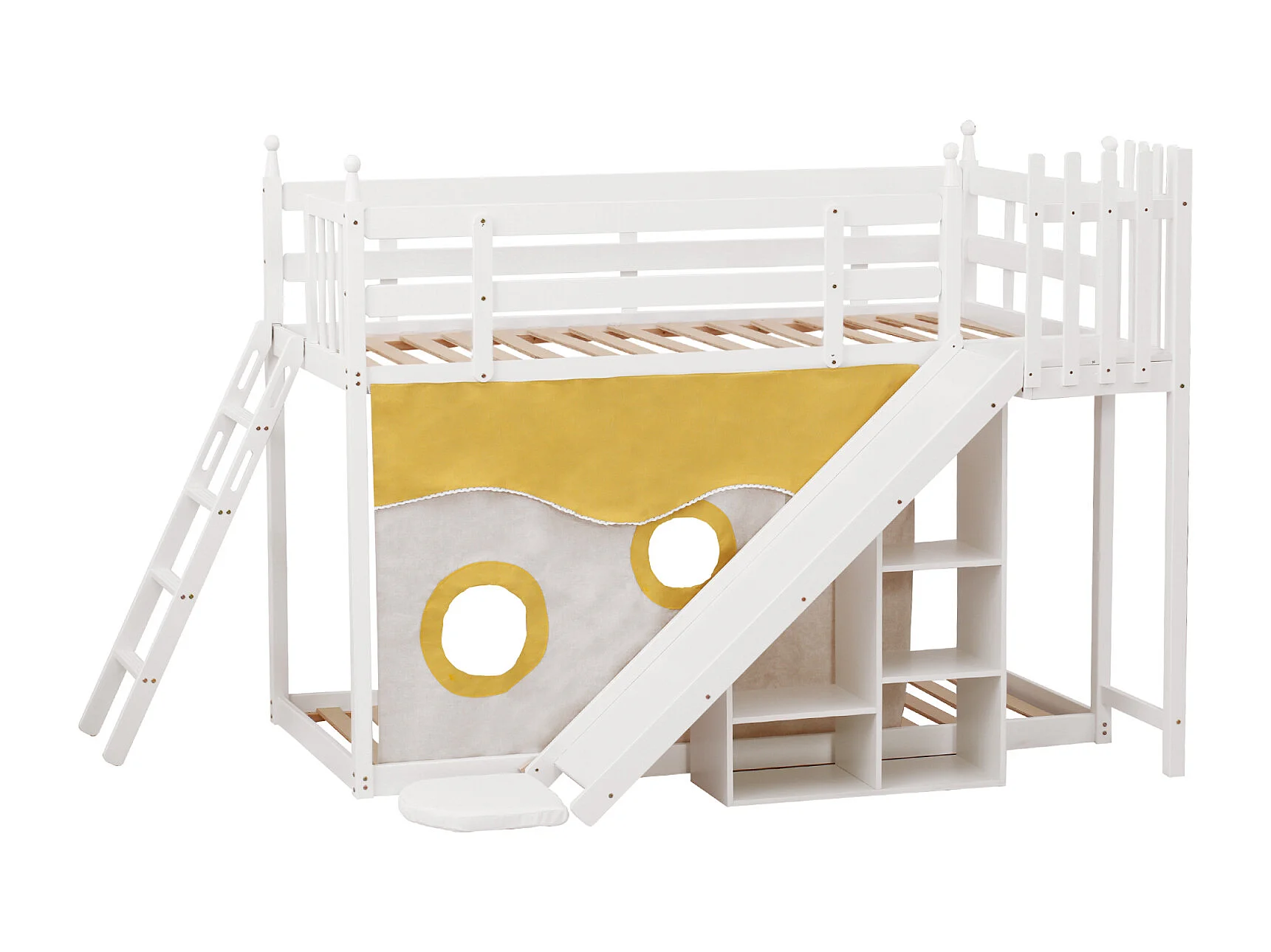 Lit superposé 90x200cm - Lit enfant en bois avec échelle, clôtures, rideau de lit, toboggan et étagère de rangement - Blanc