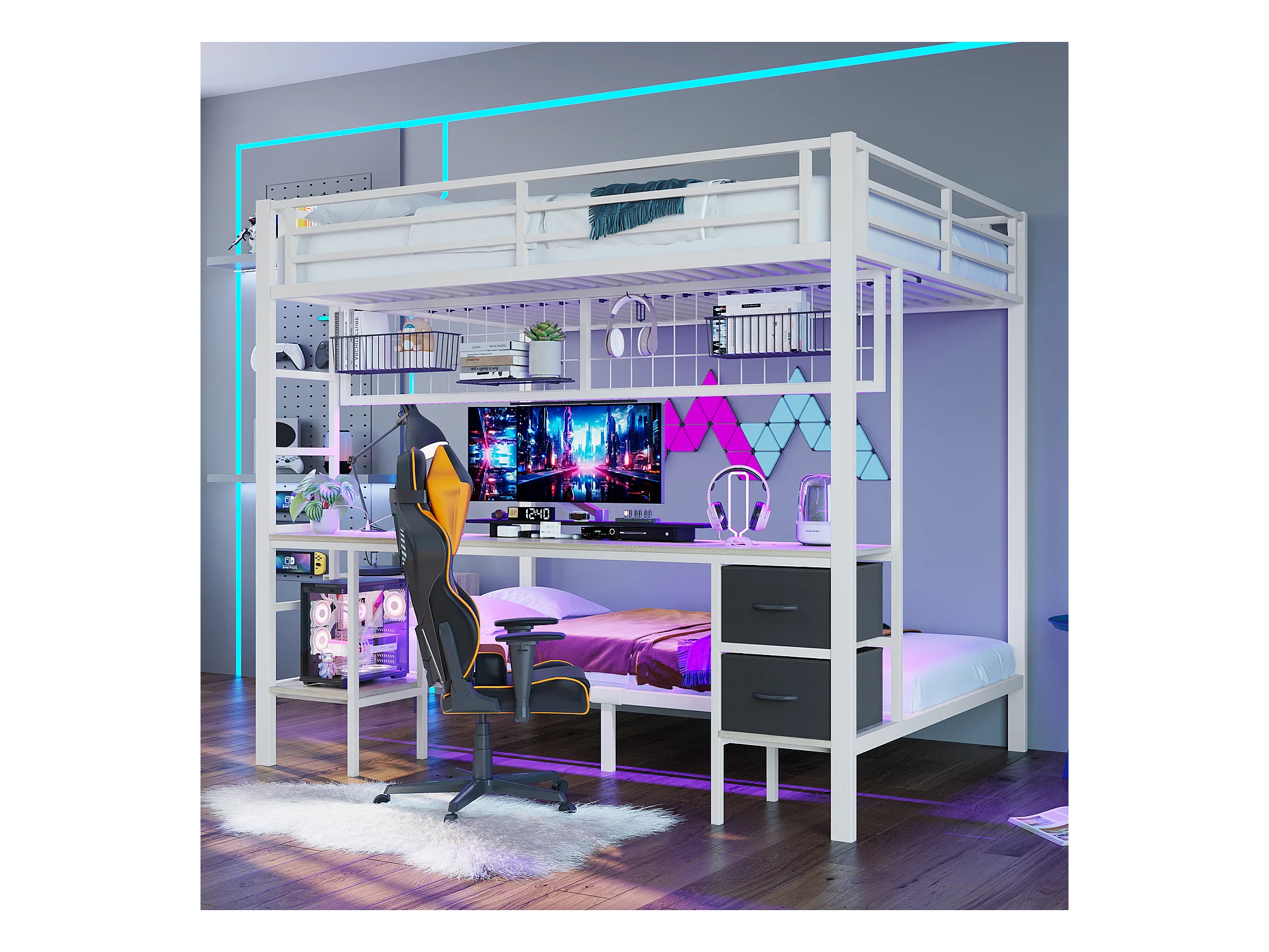 Lit superposé avec bureau, tiroirs, étagères, porteur d'objets, cadre en métal, avec LED 7 couleurs, USB, blanc (204x145x180 cm)