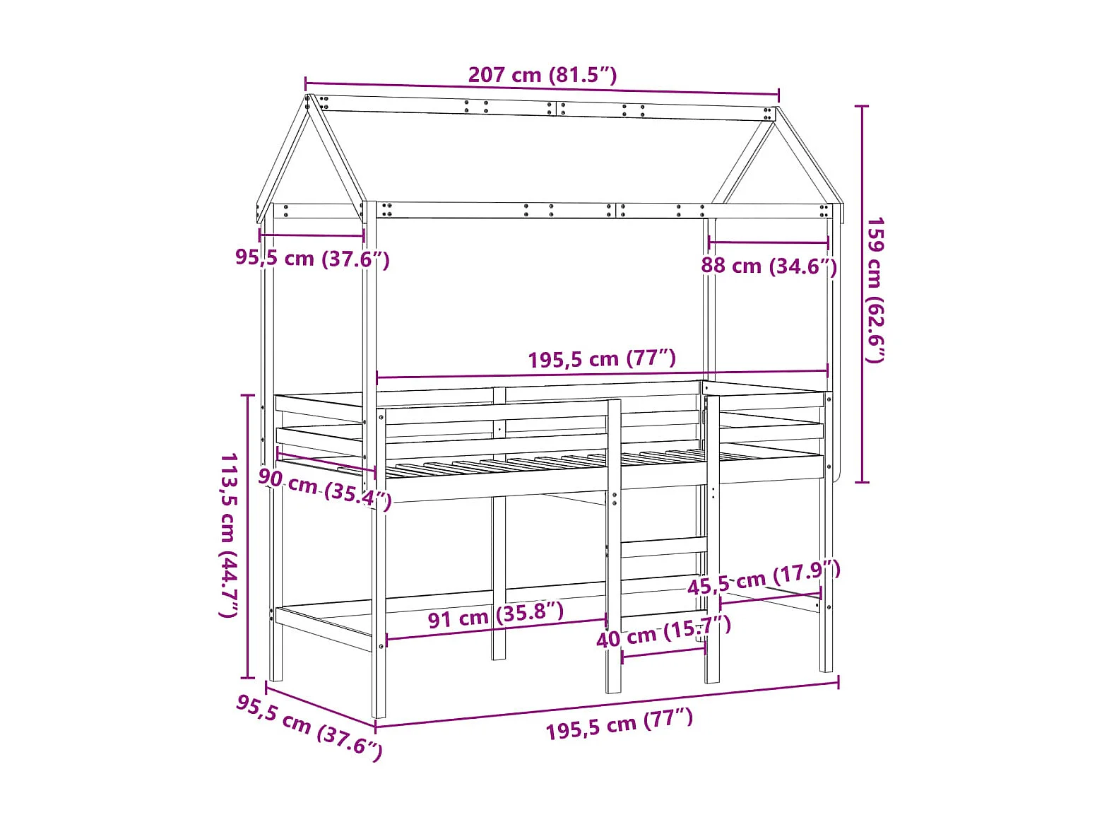 Lit superposé avec échelle et toit sans matelas 90x190 cm