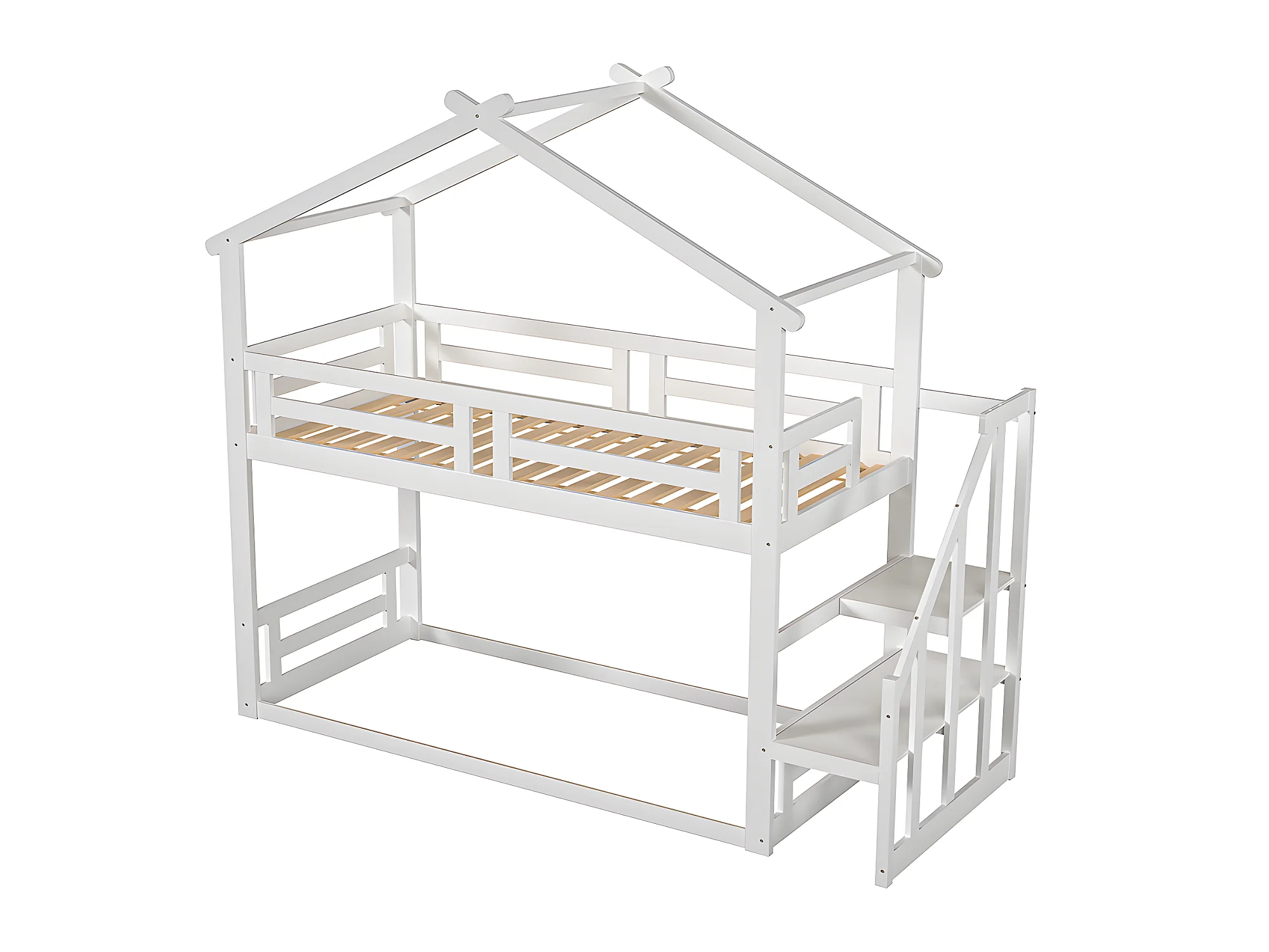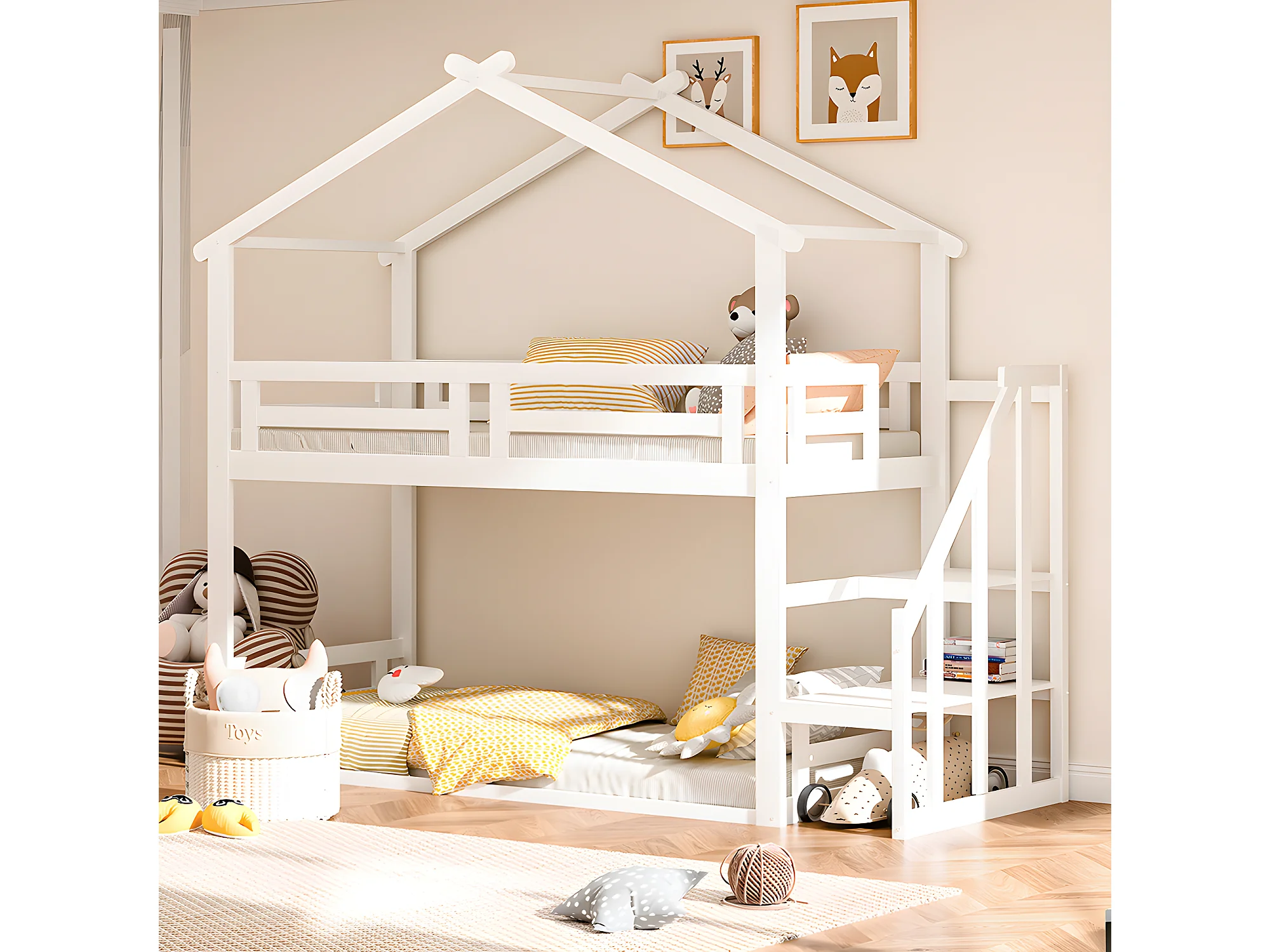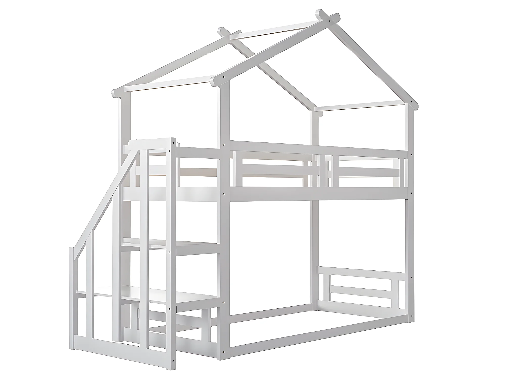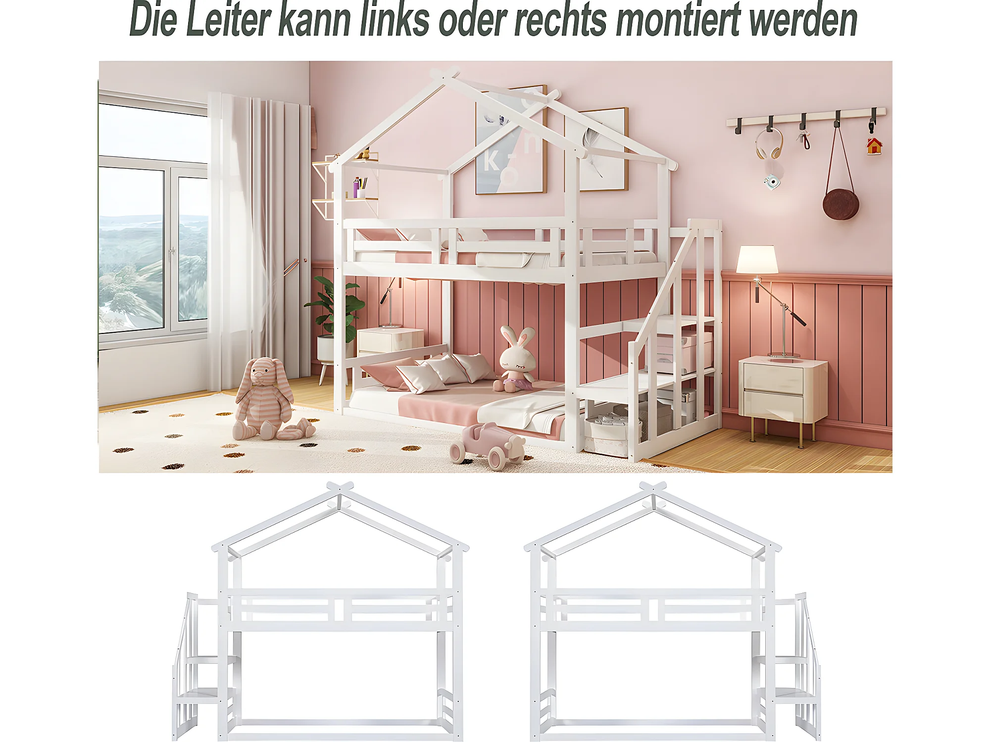 Lit superposé avec escalier - sommier à lattes - 90x200cm - blanc - Sweiko