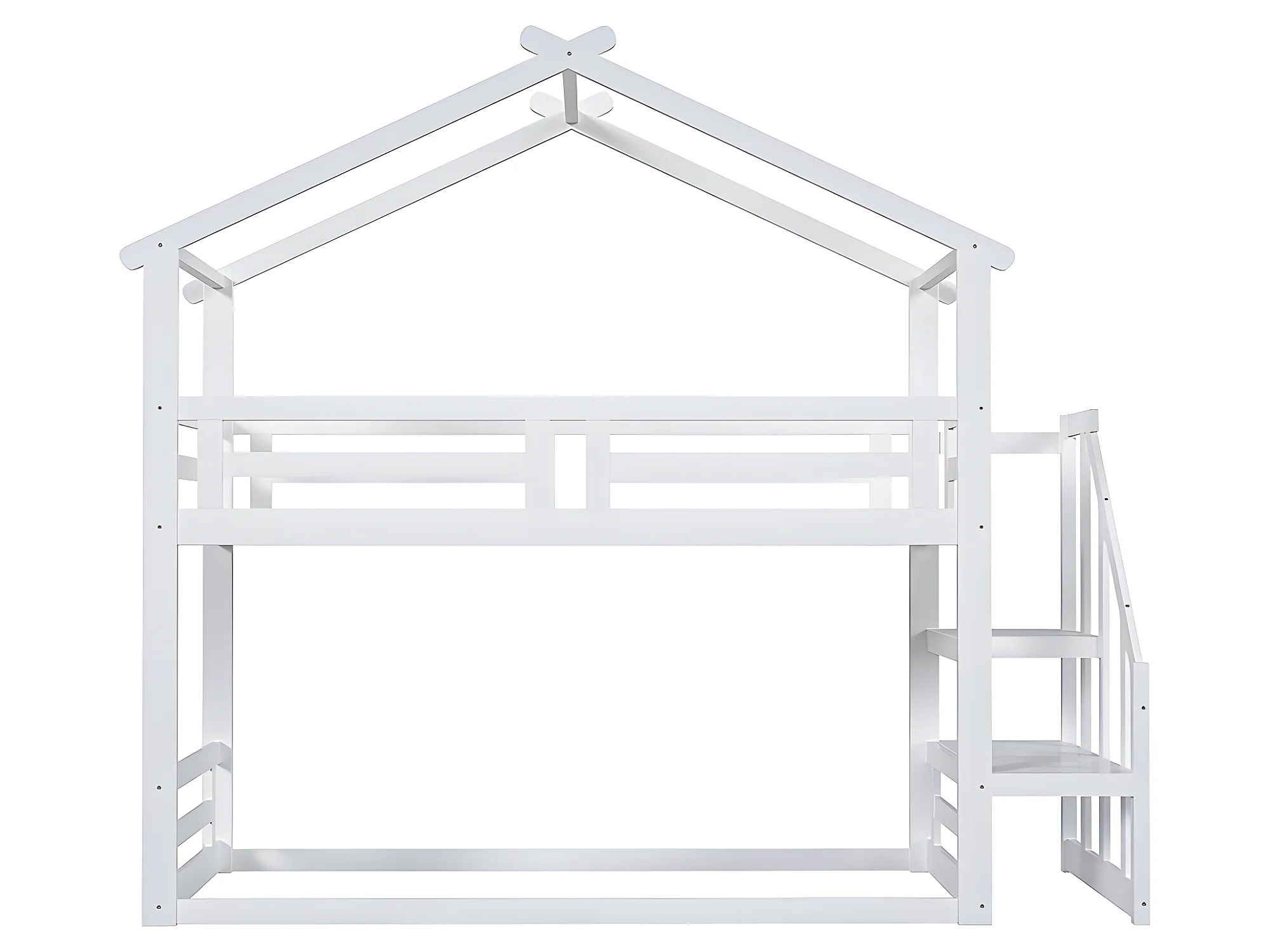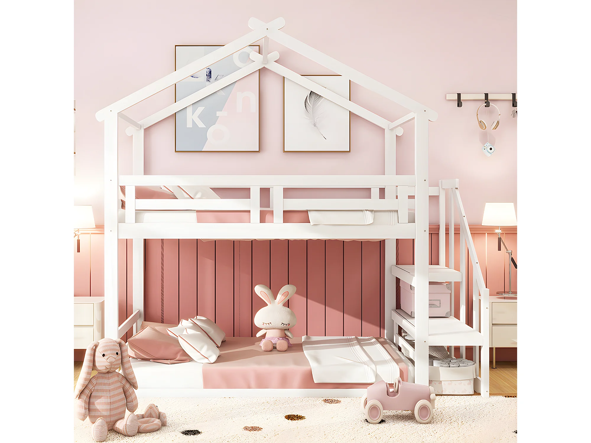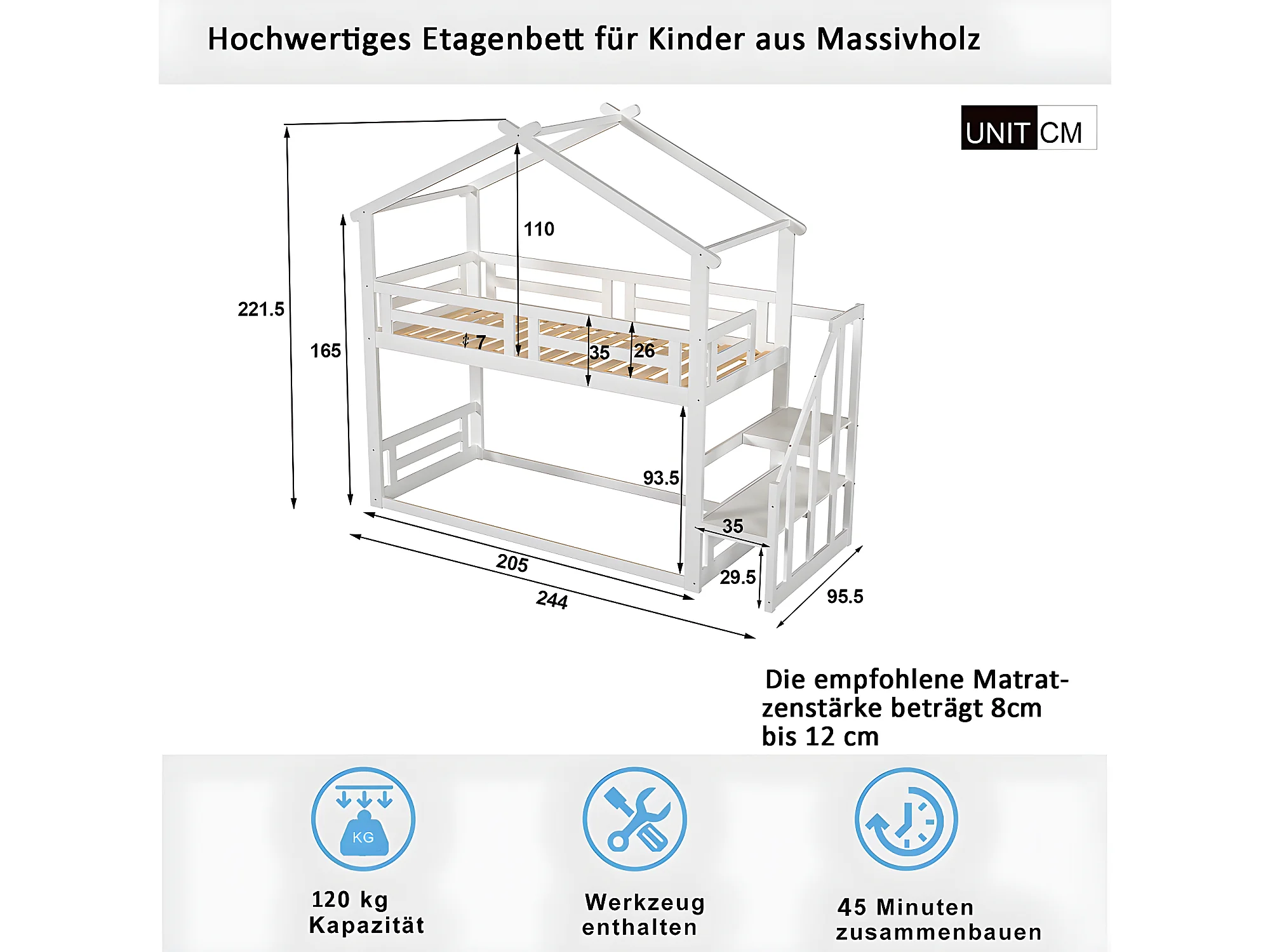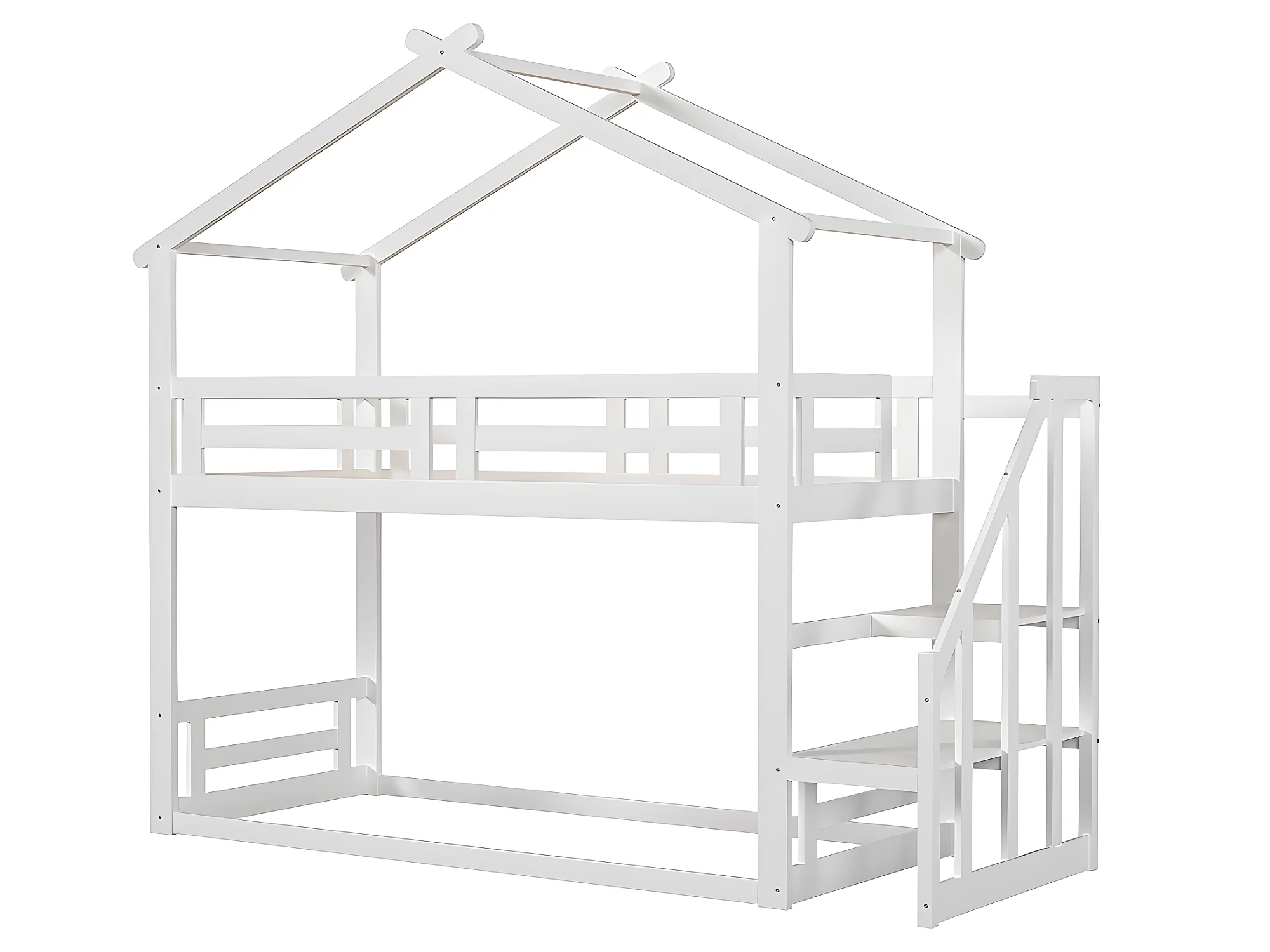 Lit superposé avec escalier - sommier à lattes - 90x200cm - blanc - Sweiko