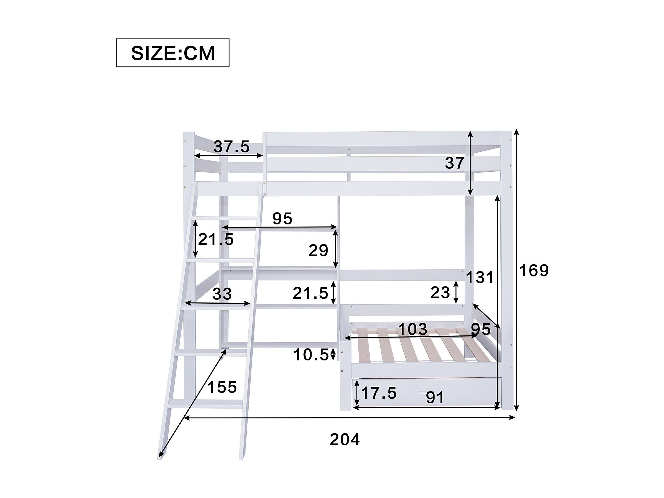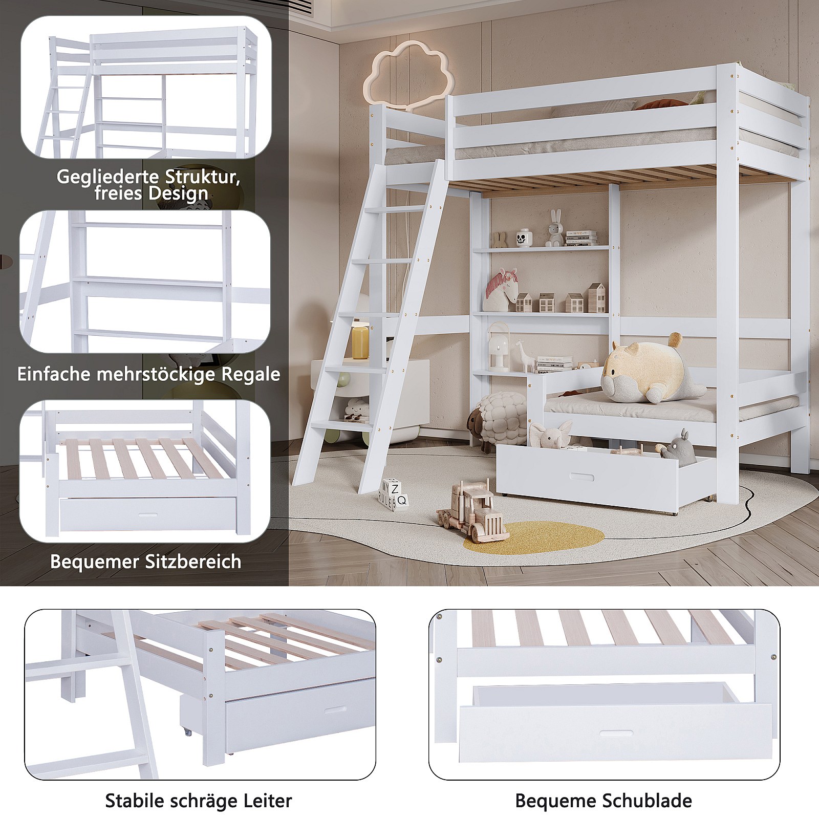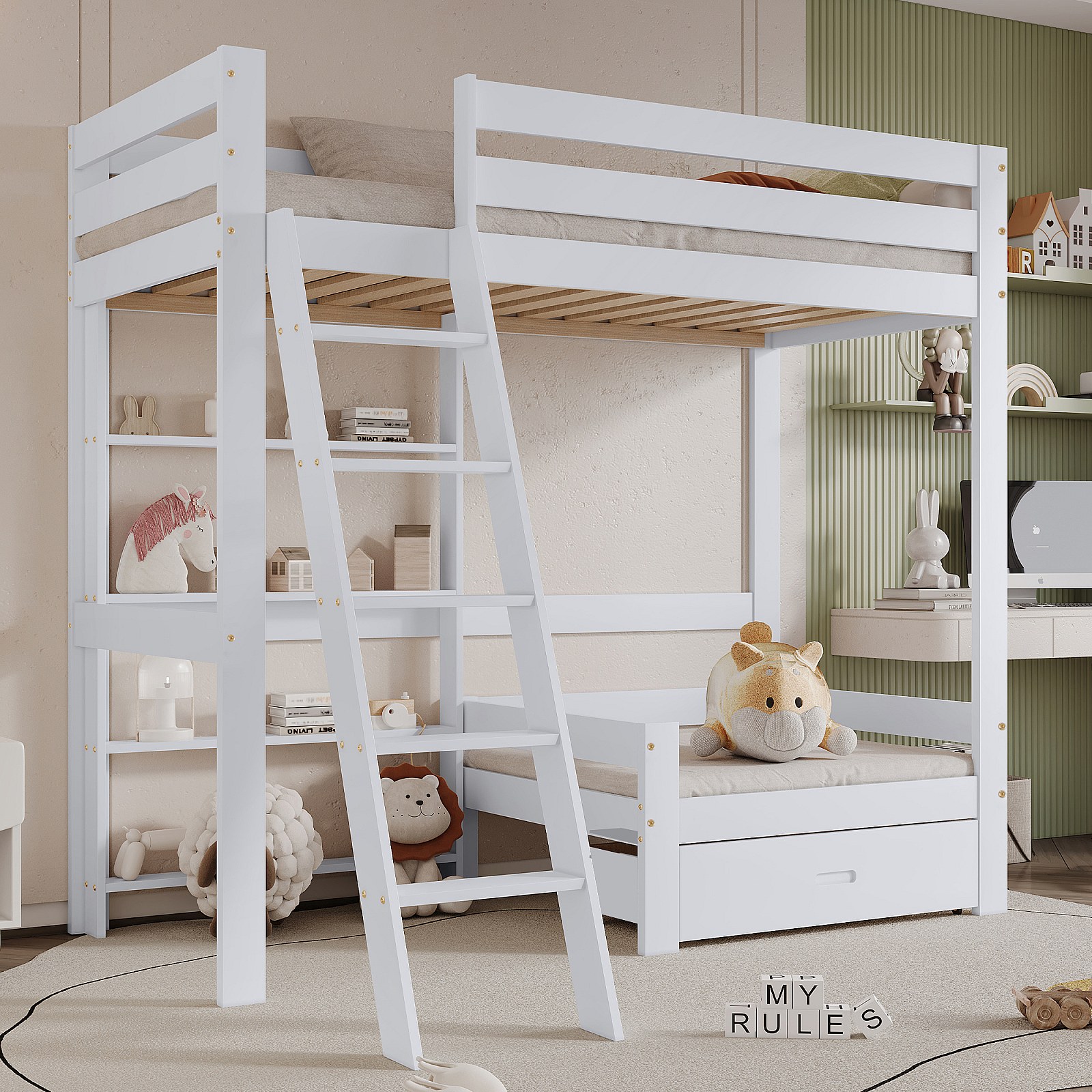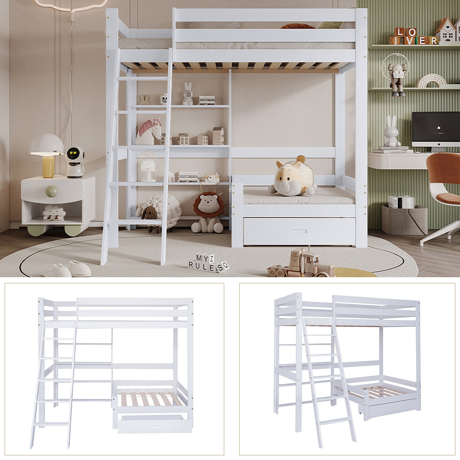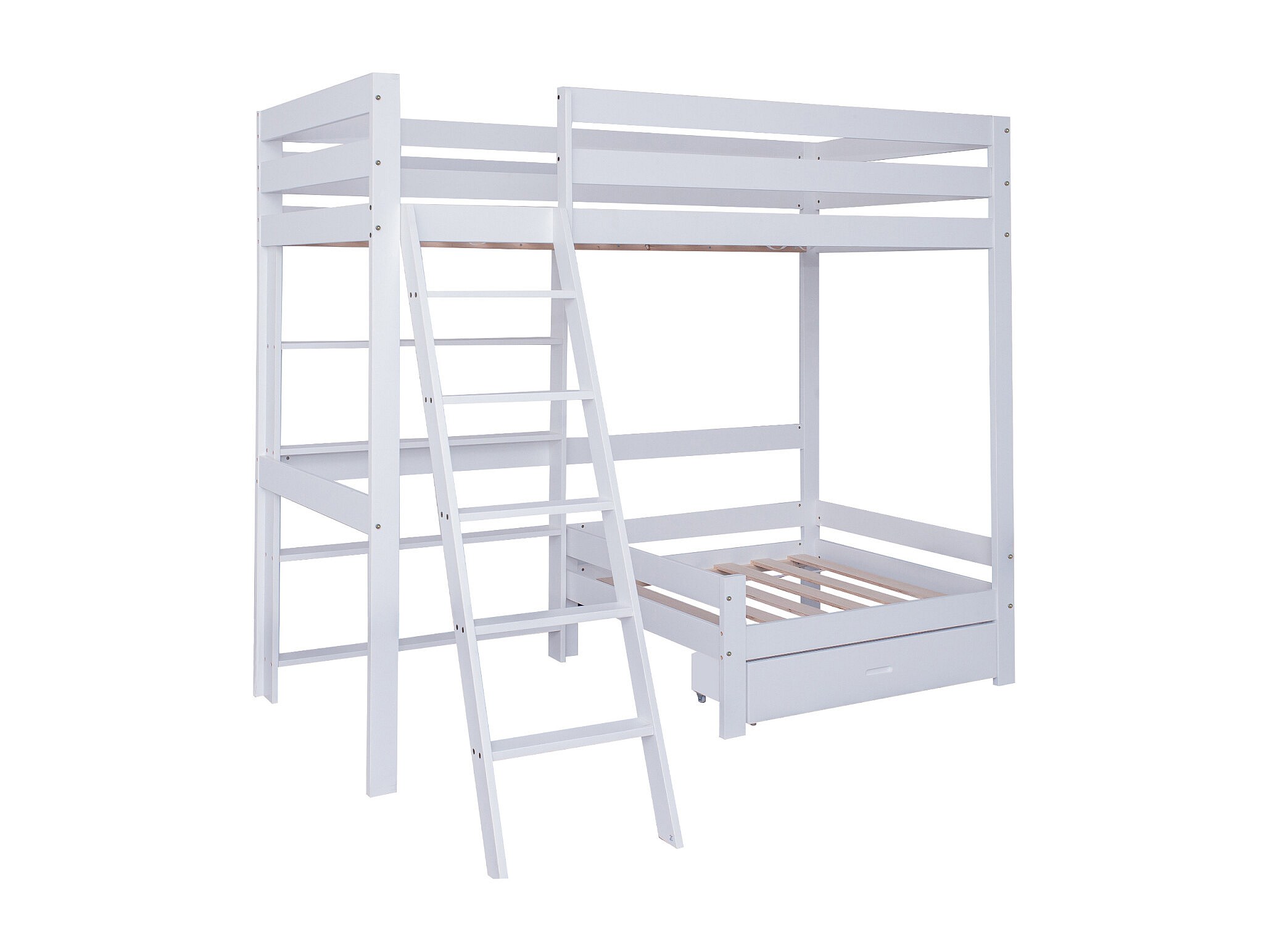 Lit superposé avec étagères et canapé, lit bois avec tiroir, échelle inclinée, cadre massif, blanc.