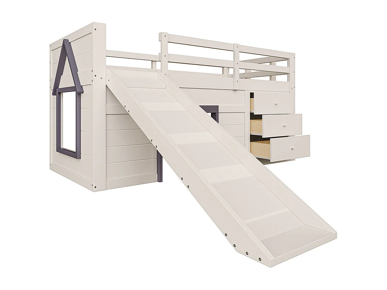 Lit superposé bas mezzanine 90x200 toboggan trois tiroirs deux portes crème