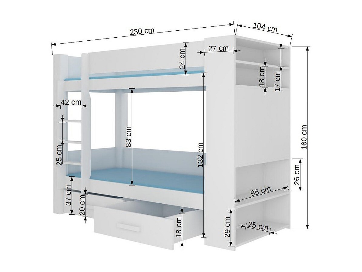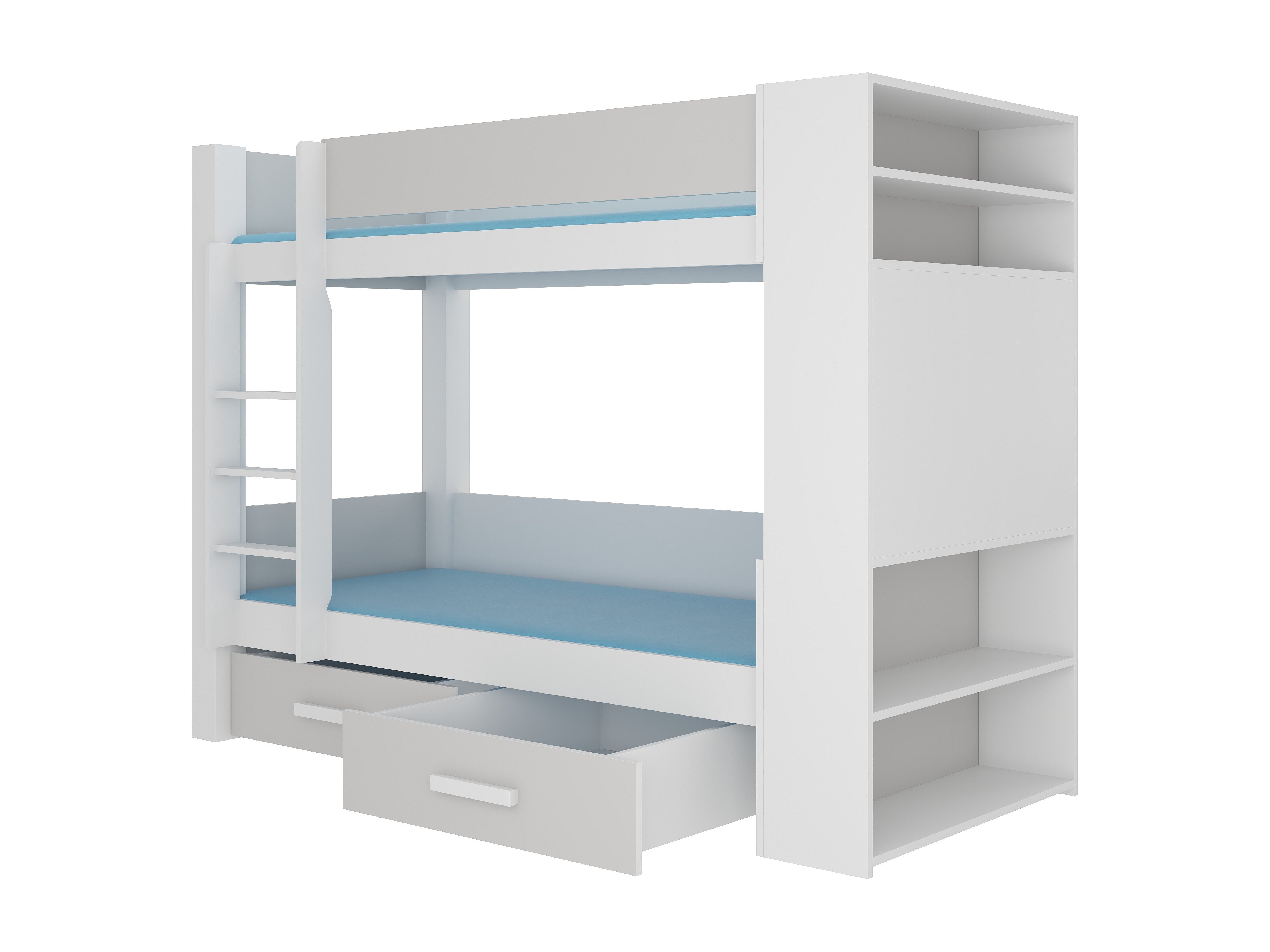 Lit superposé blanc et gris clair 2 couchages 90x200 avec rangement Mila