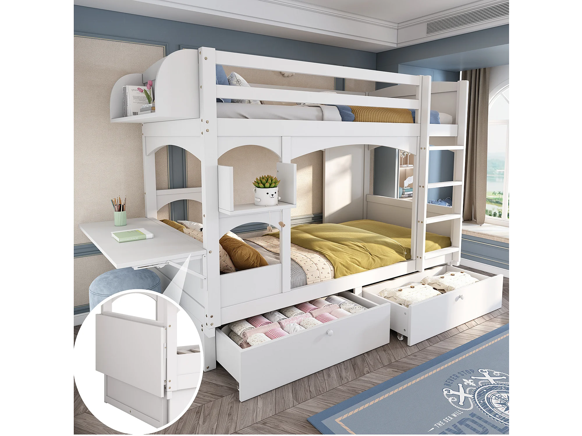 Lit superposé blanc pour enfants 90*200, en bois massif, avec table pliante et étagère, avec échelle et 2 tiroirs, sans matelas