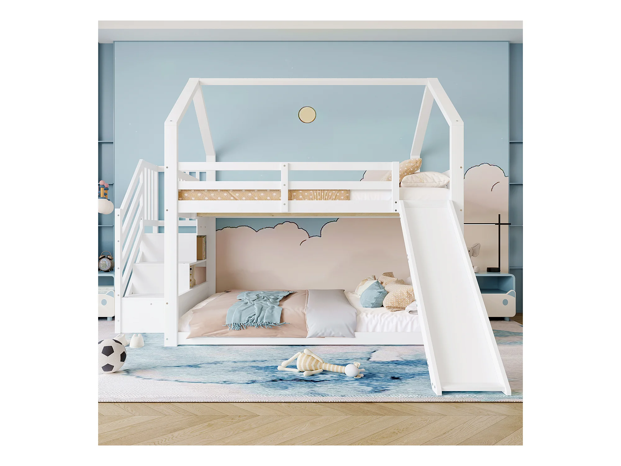Lit superposé cabane 140x200 cm blanc avec toboggan et escalier de rangement, lit enfant ou ado sécurisé