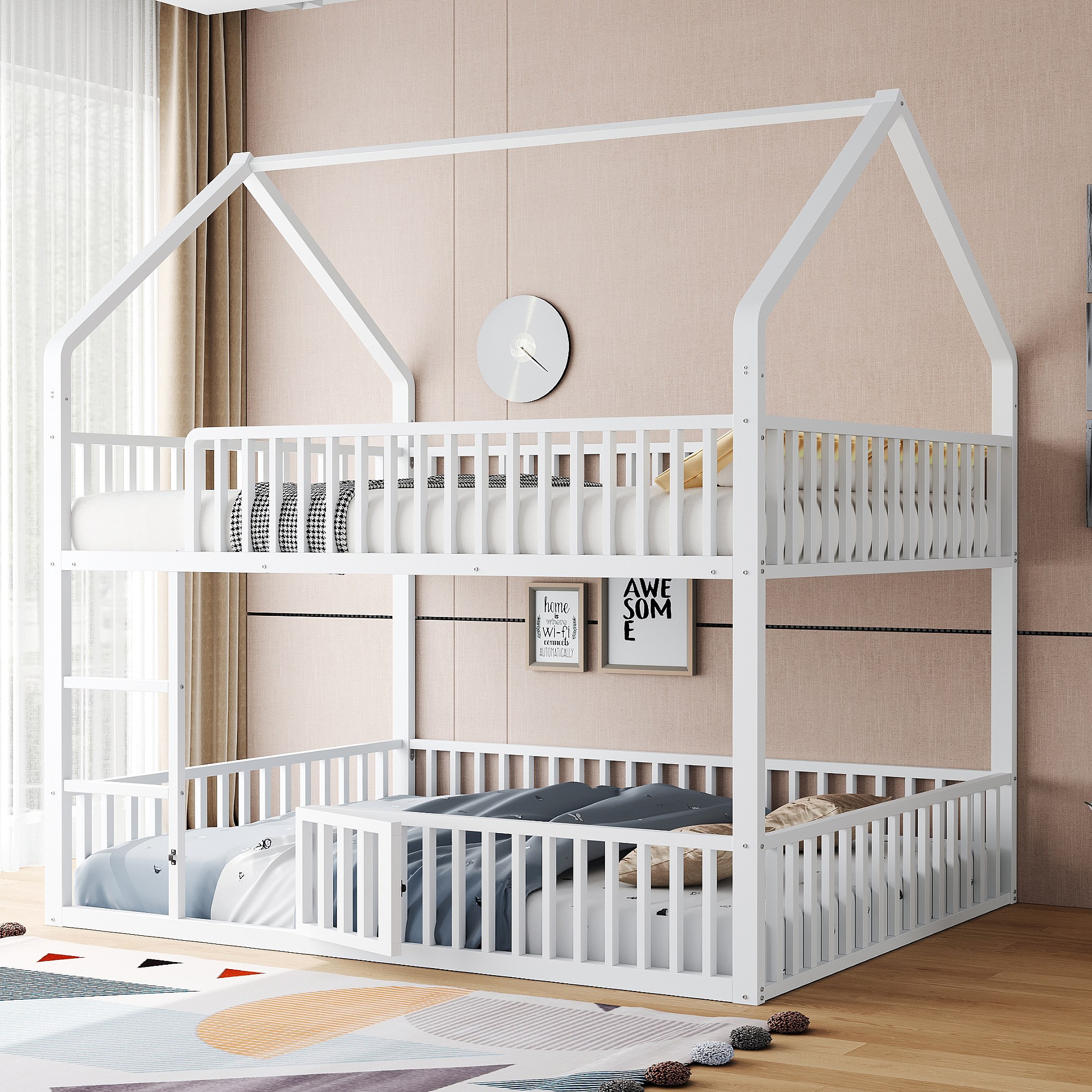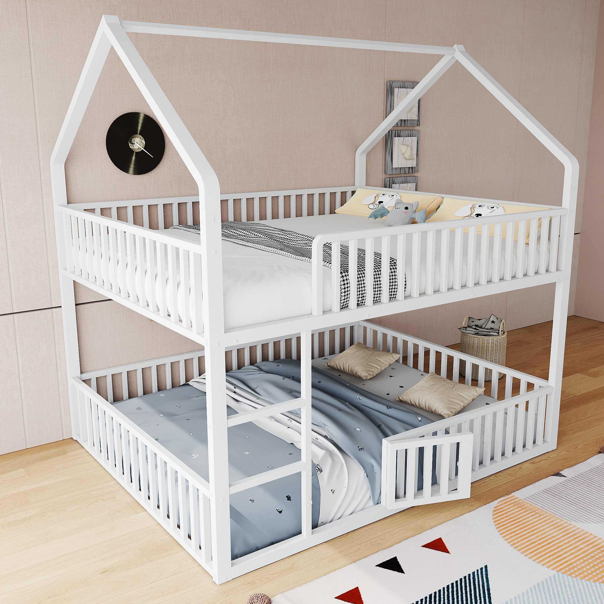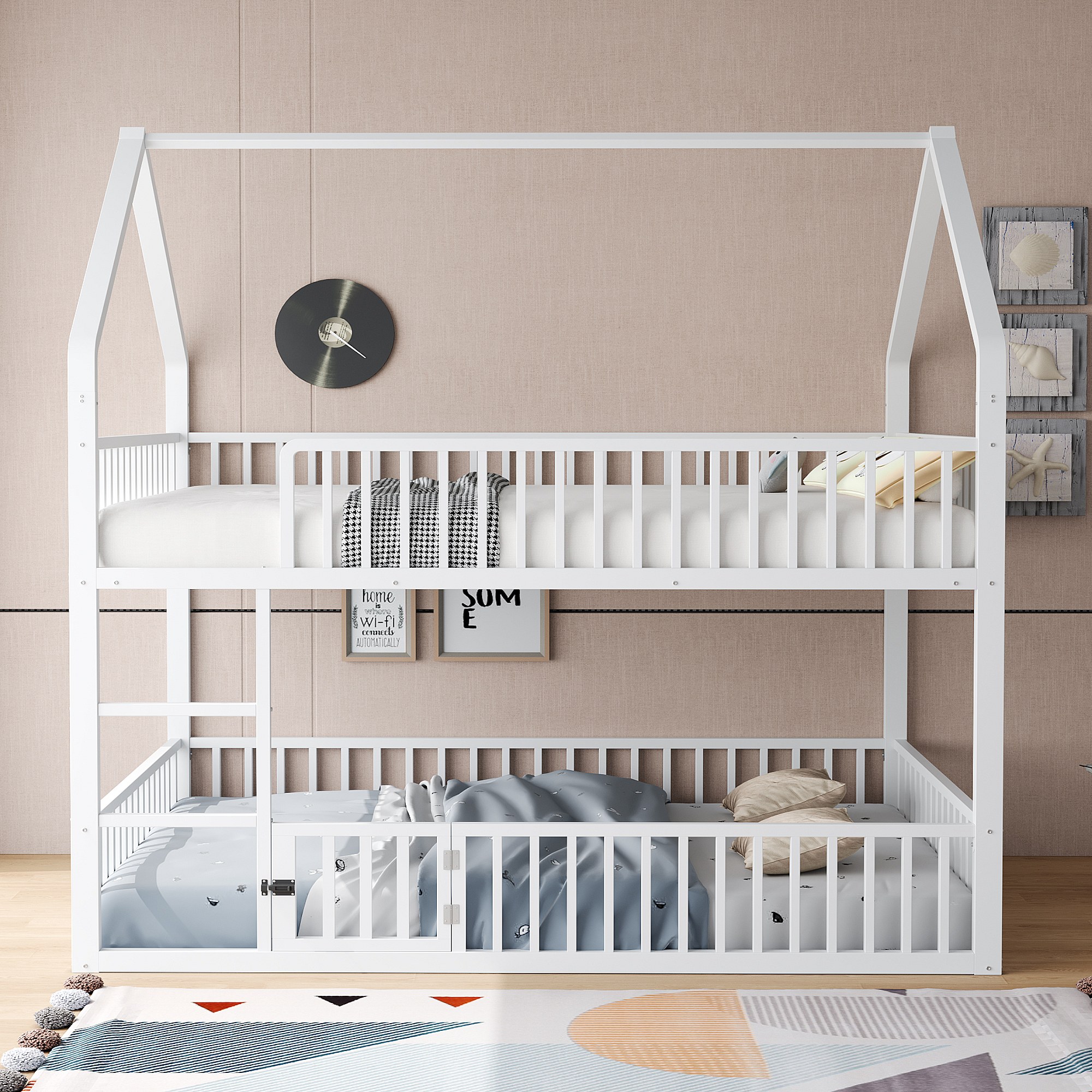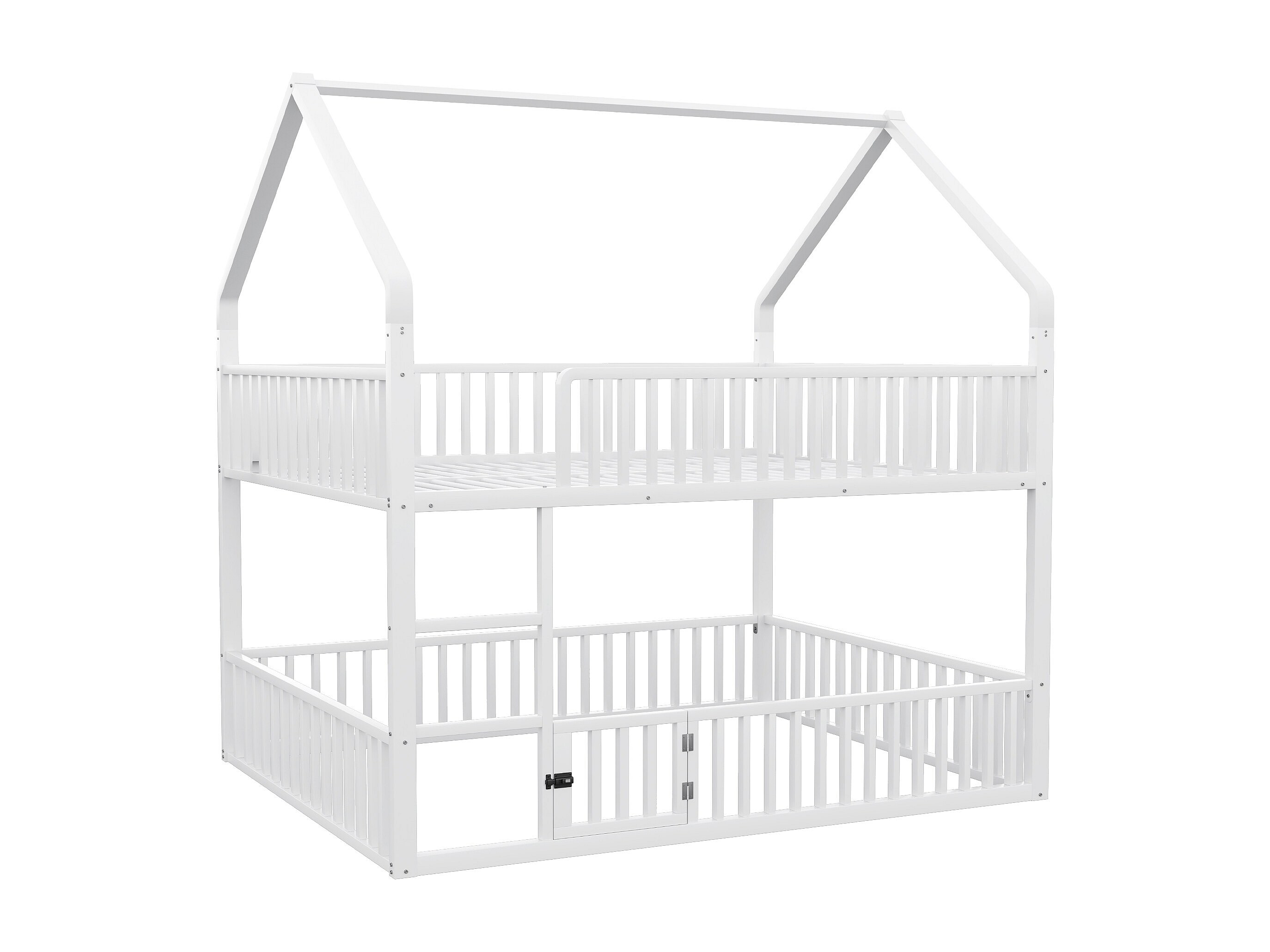 Lit superposé cabane enfant blanc 140x200cm avec échelle, structure en métal, sans matelas