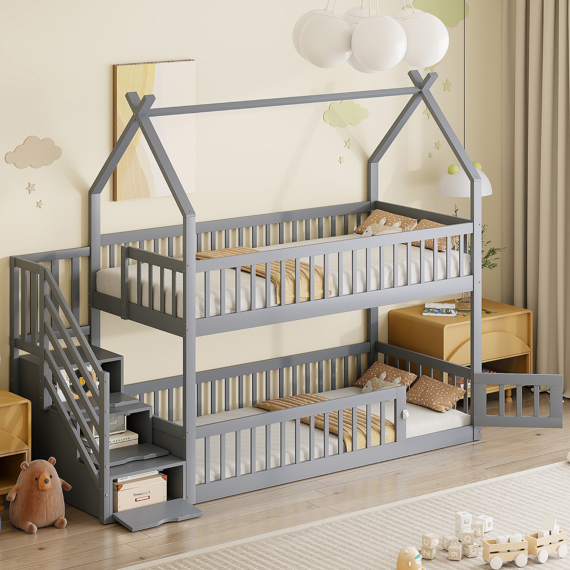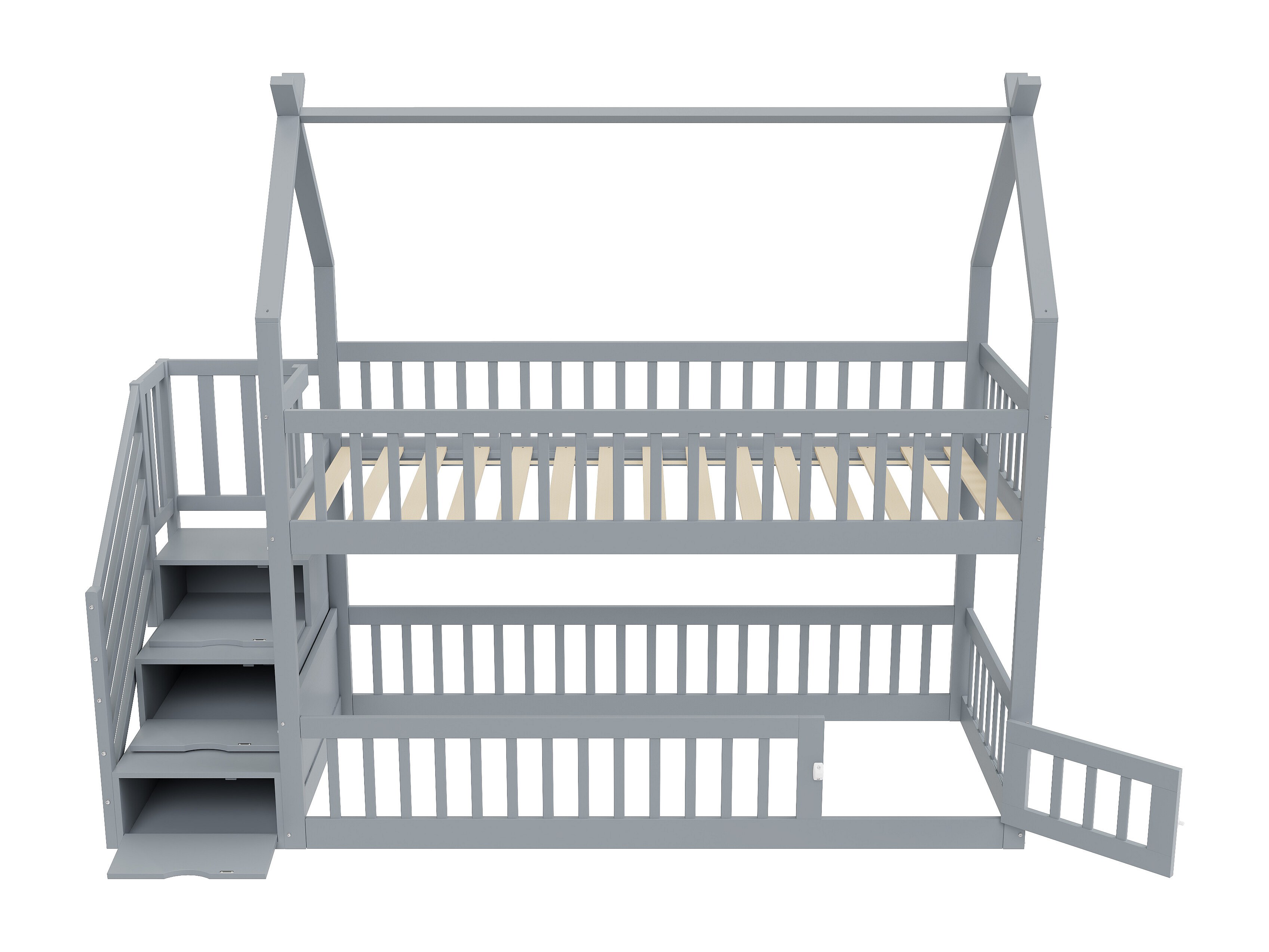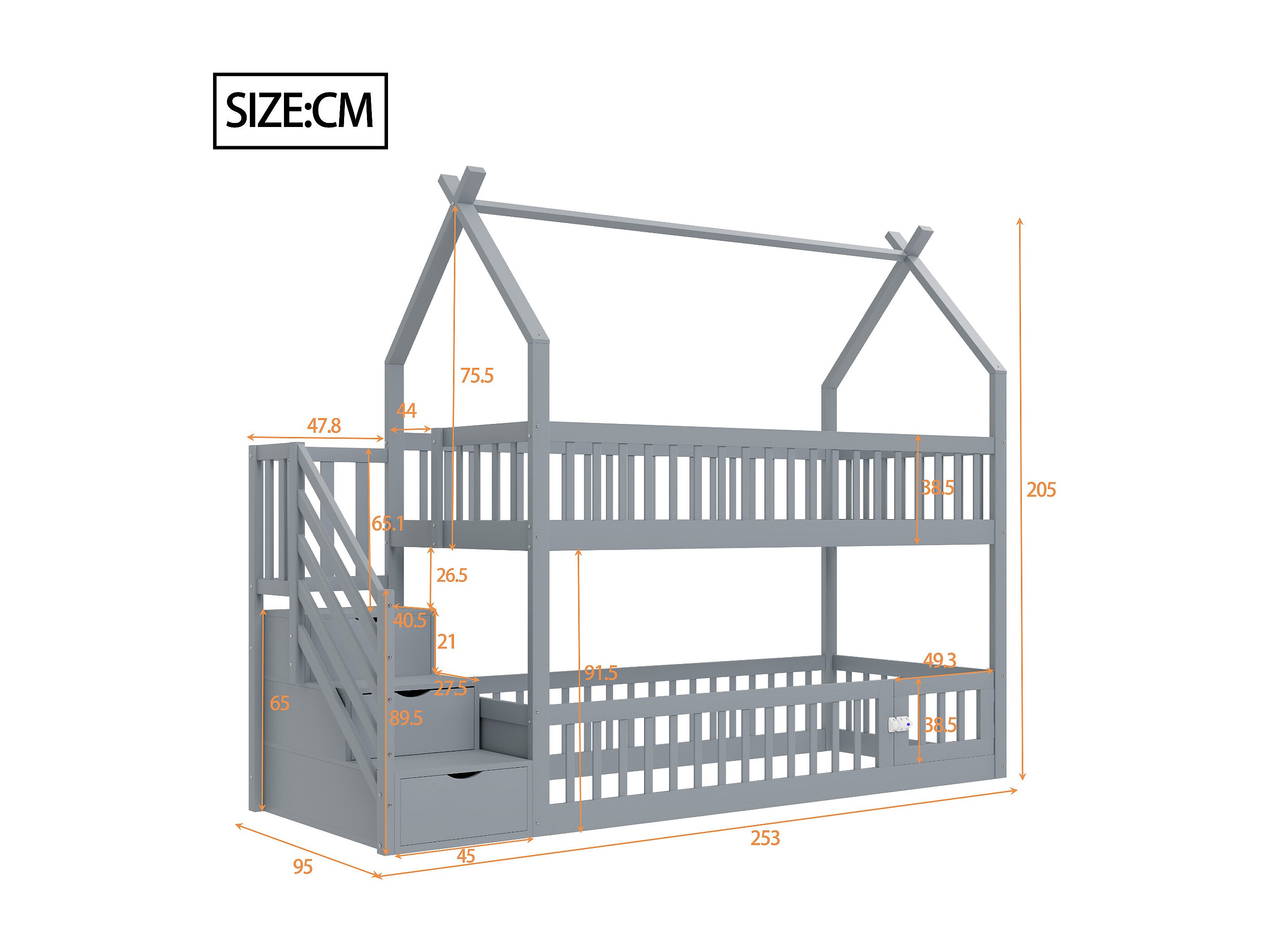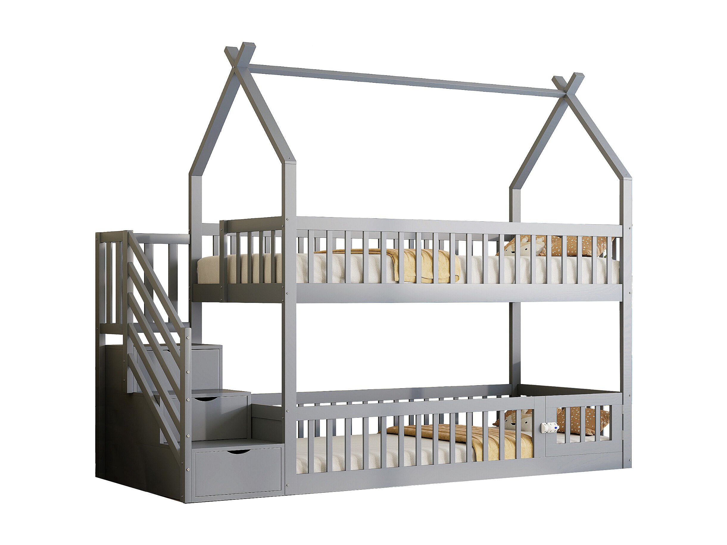 Lit superposé cabane enfant gris 90x200cm avec escalier de rangement, sans matelas