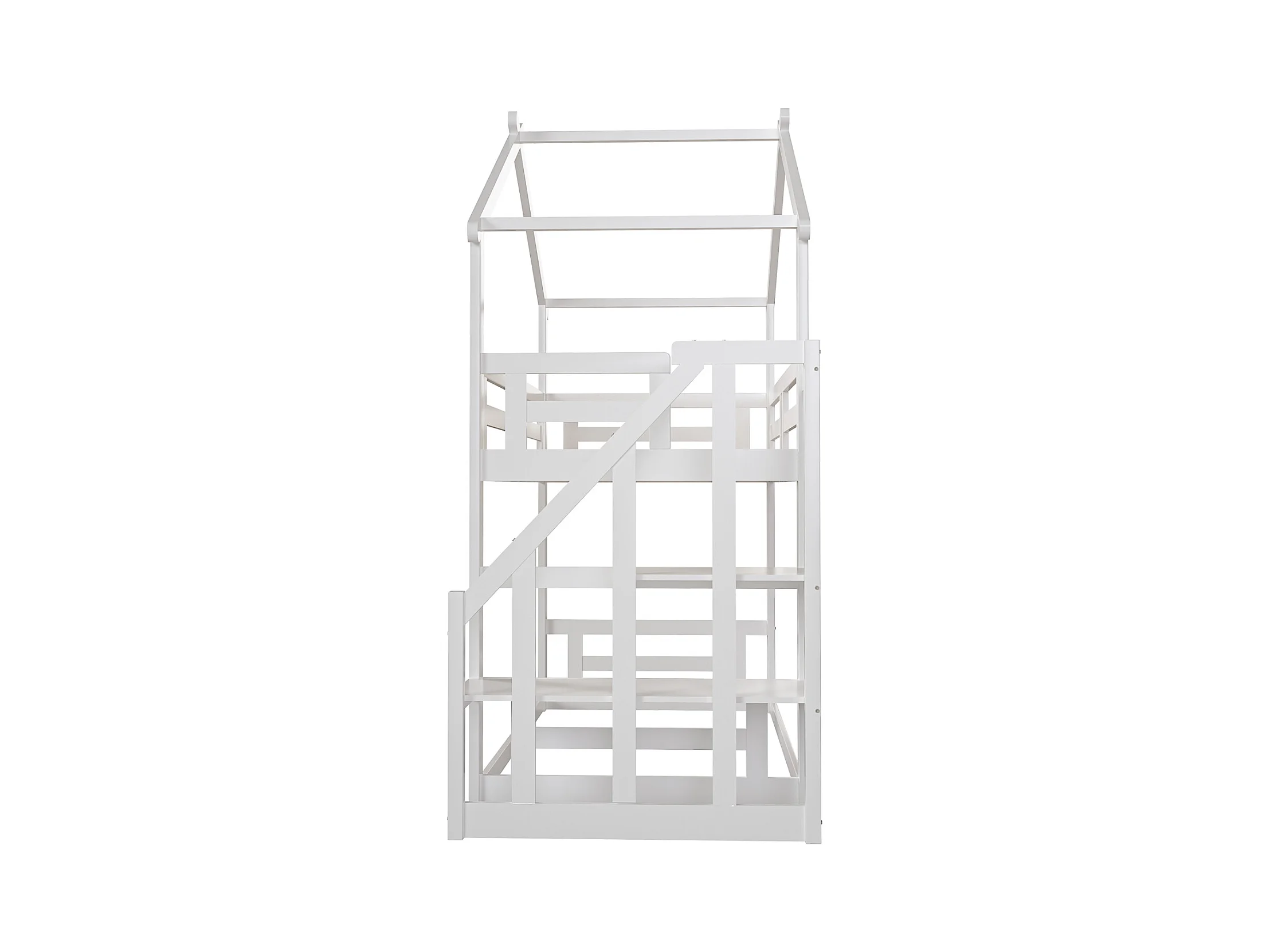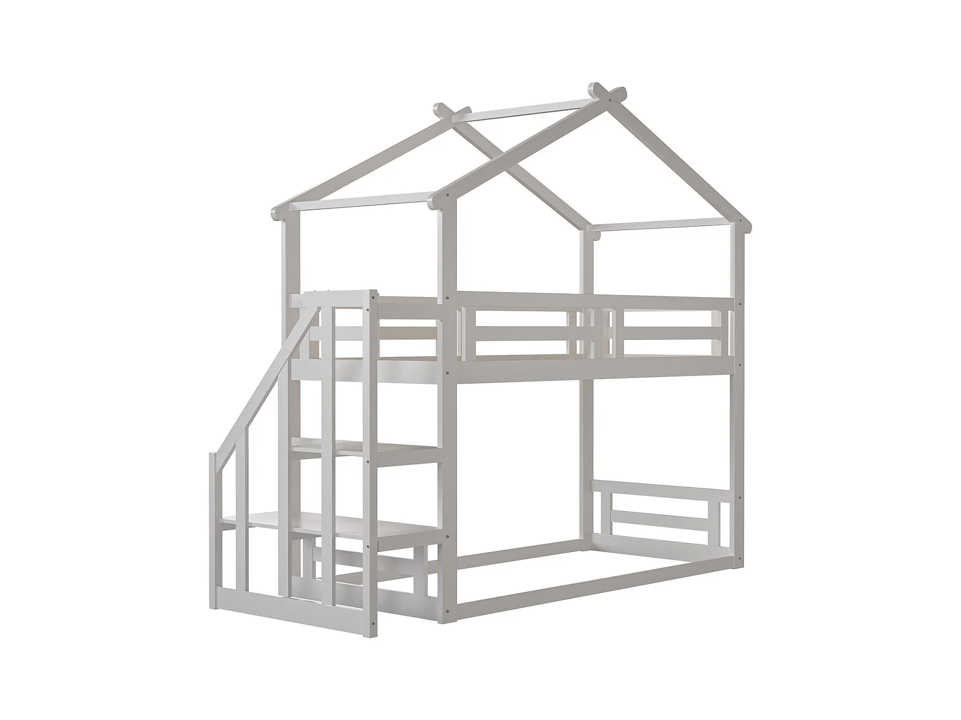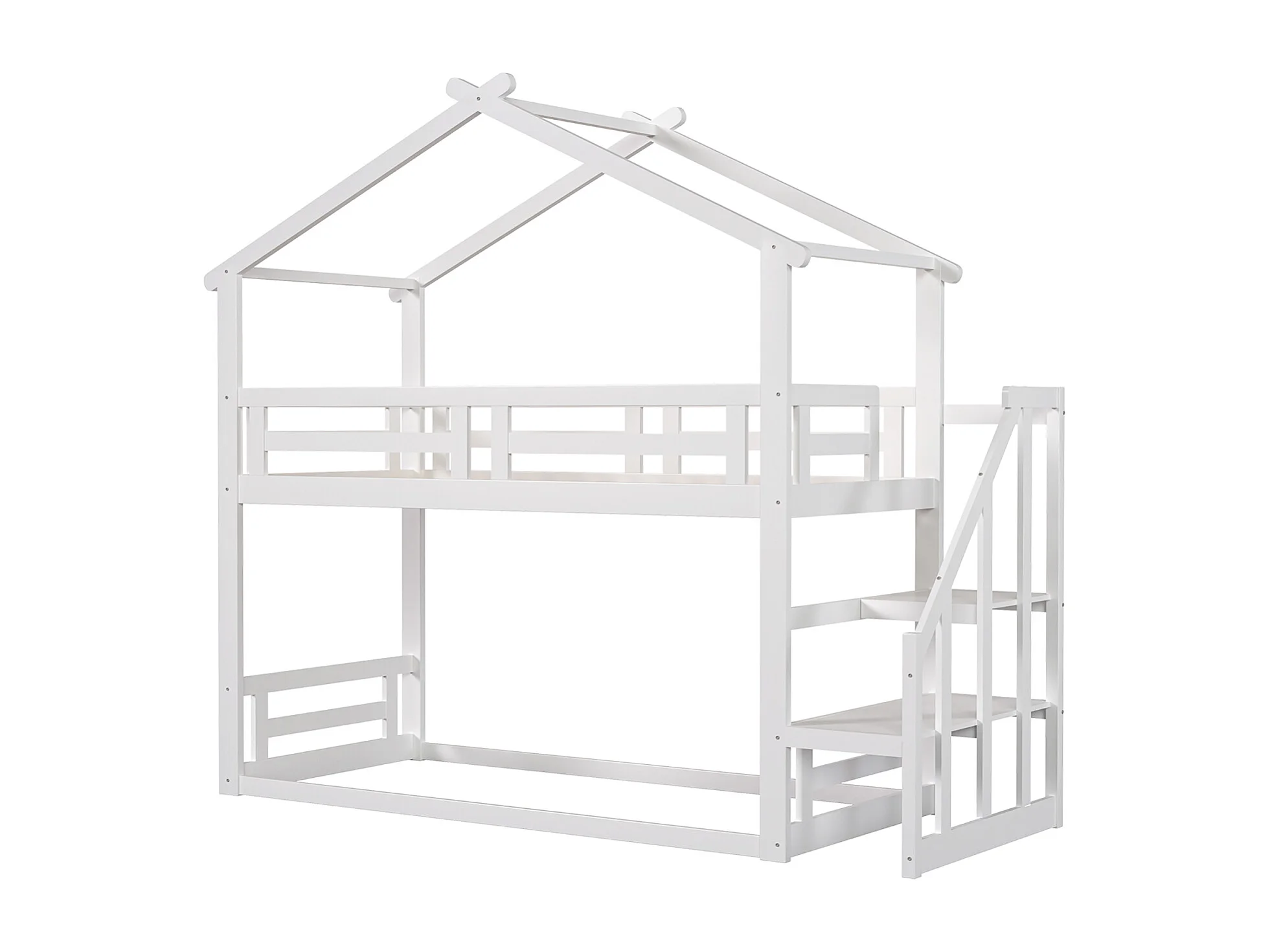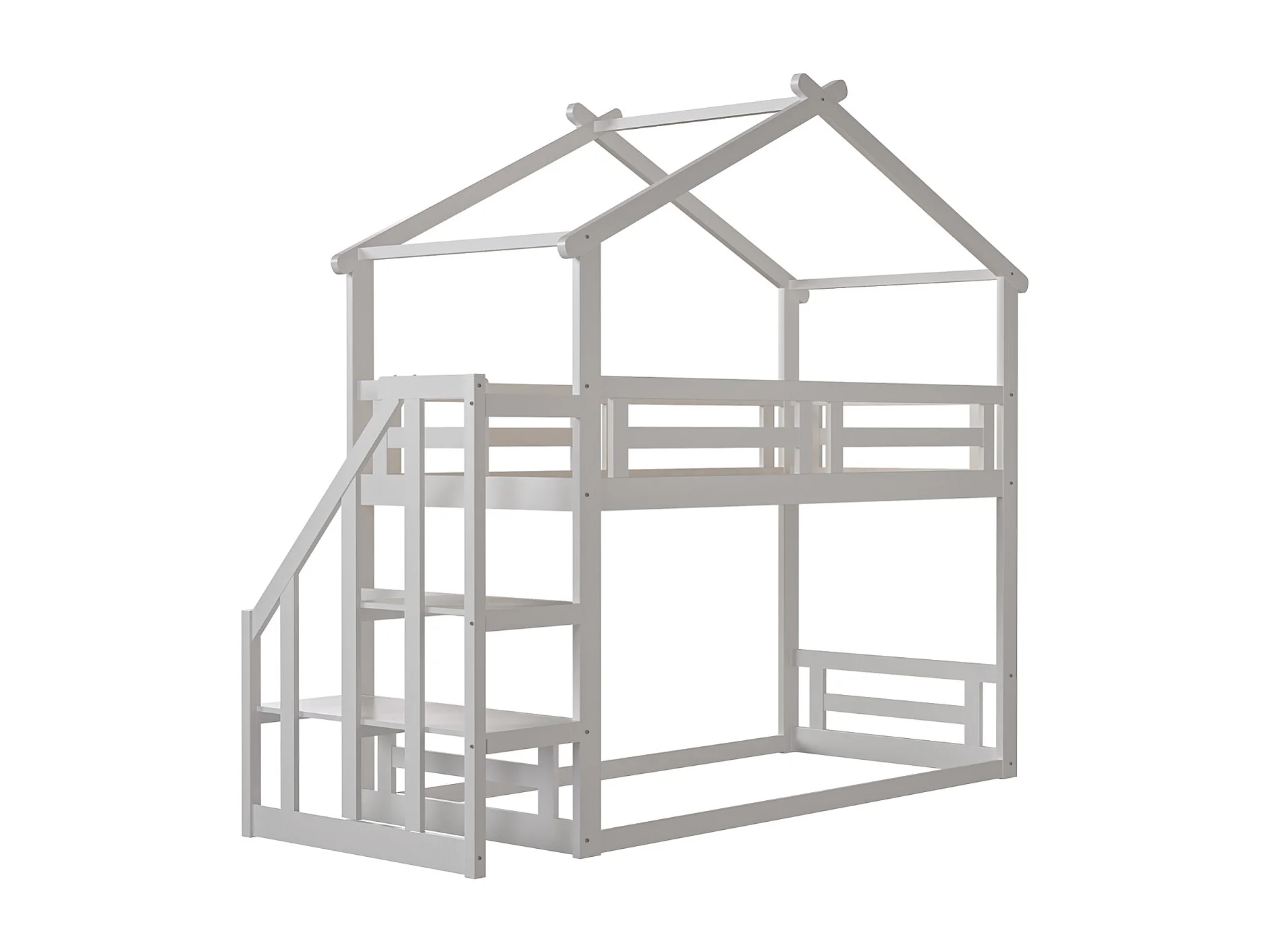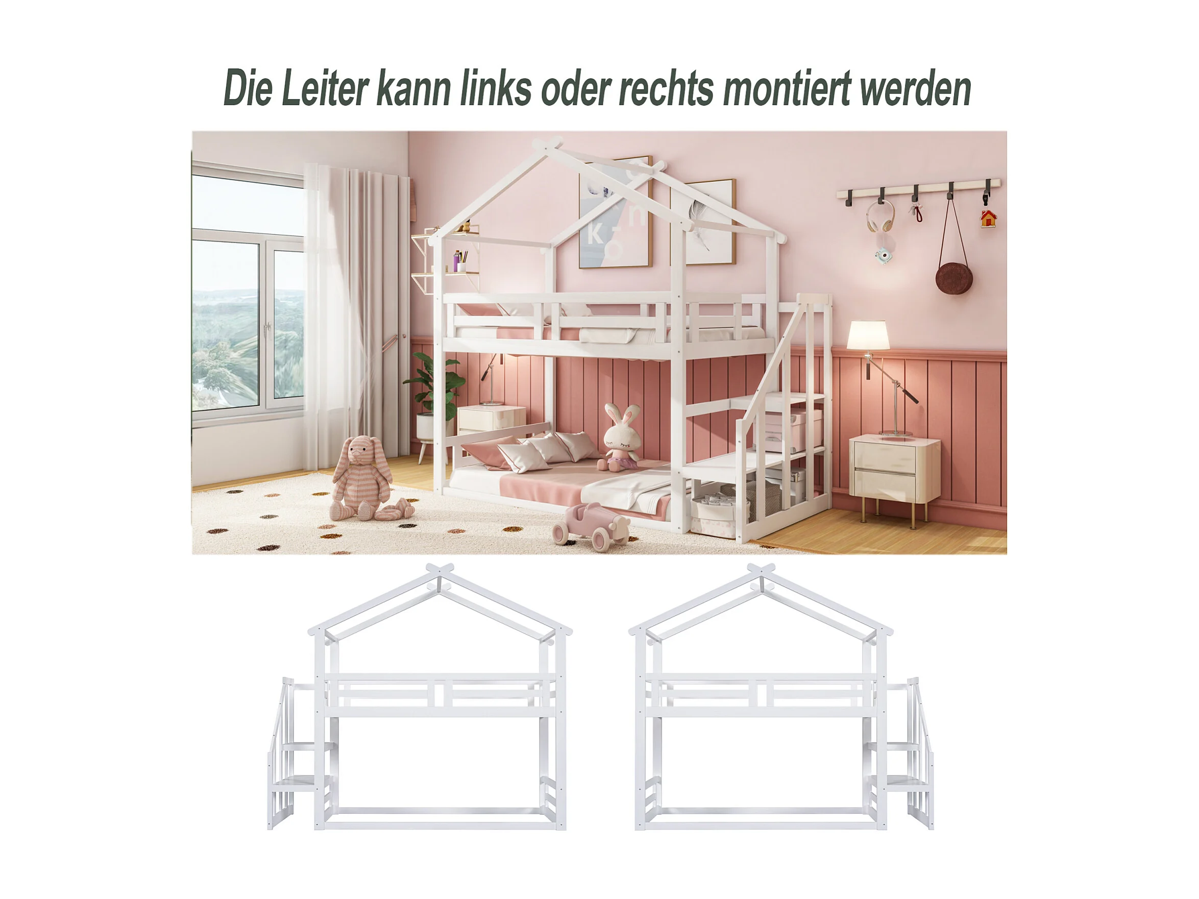 Lit superposé d'enfant 90x200cm - lit cabane avec escalier de sécurité, cadre de lit en bois massif avec sommier à lattes - blanc