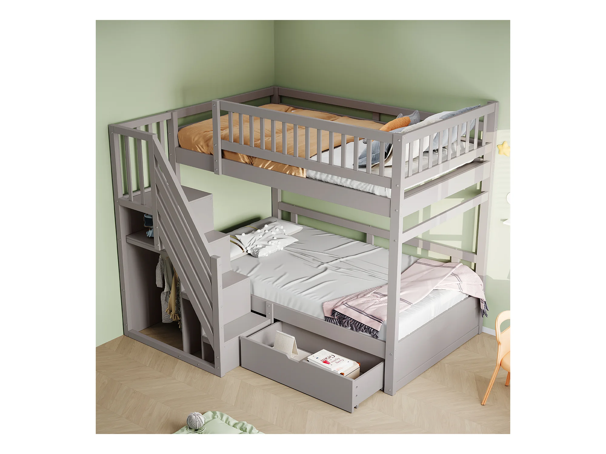 Lit superposé en bois massif 90x200 cm avec échelle de rangement, garde-corps de sécurité et tiroirs de rangement, gris (205x95x173 cm)