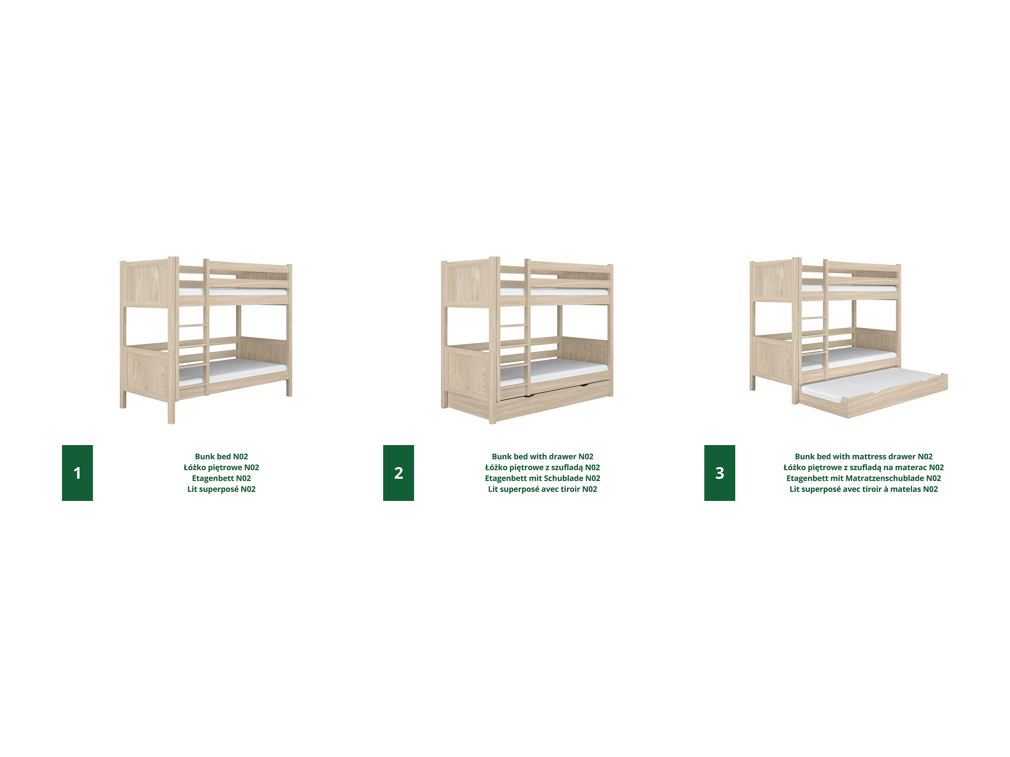 Lit superposé en chêne - avec tiroir pour matelas N02 Chêne Blanchi 100x180