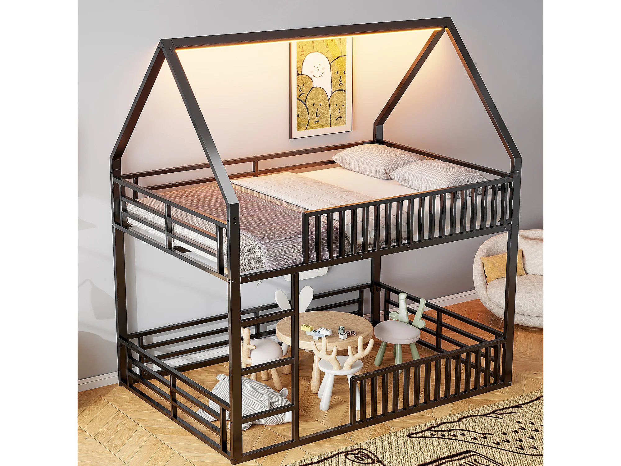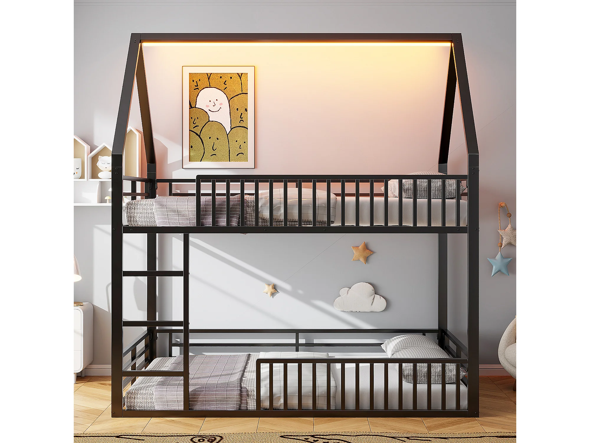 Lit superposé en forme de maison 140x200cm, avec barrière et lumière LED, métal, noir, sans matelas