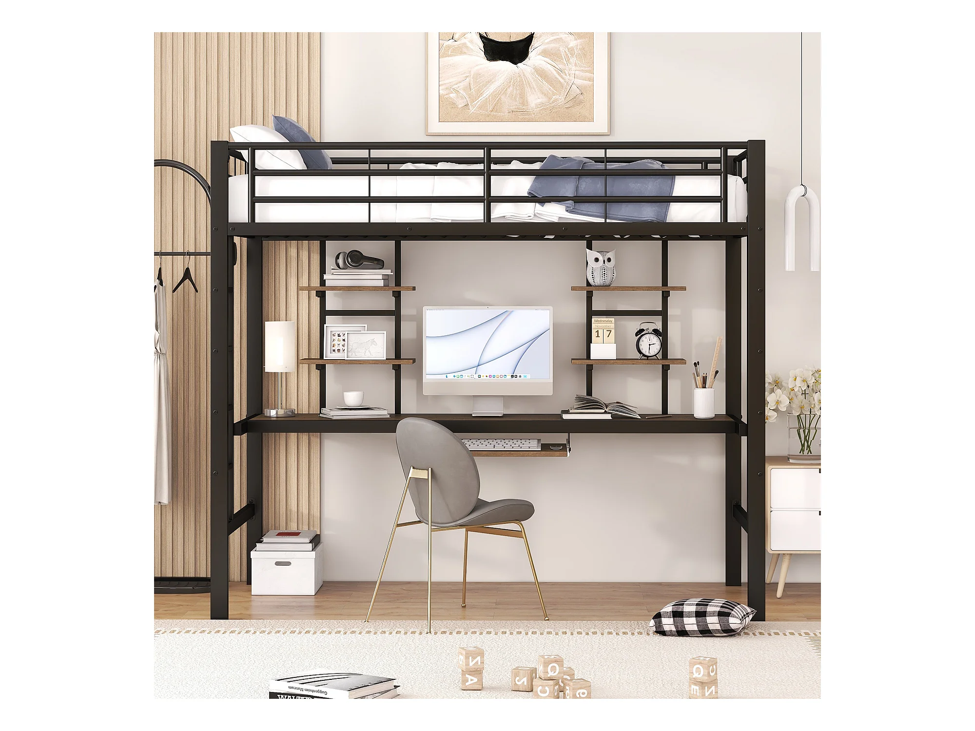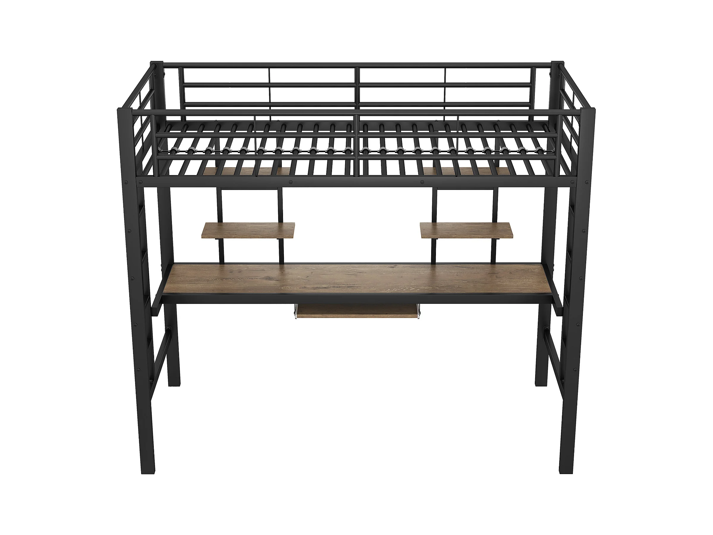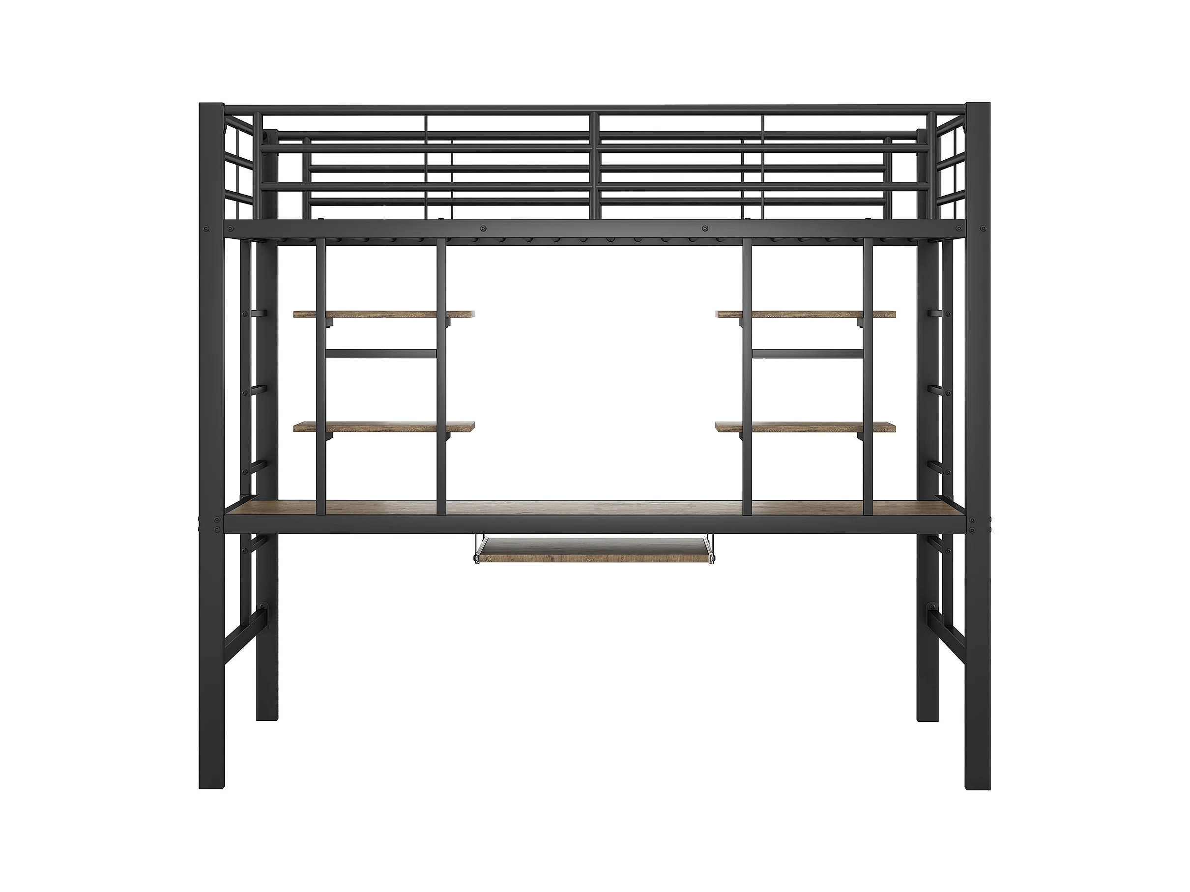 Lit superposé en métal avec bureau et étagères, 90x200 cm, noir (204x95x180 cm)