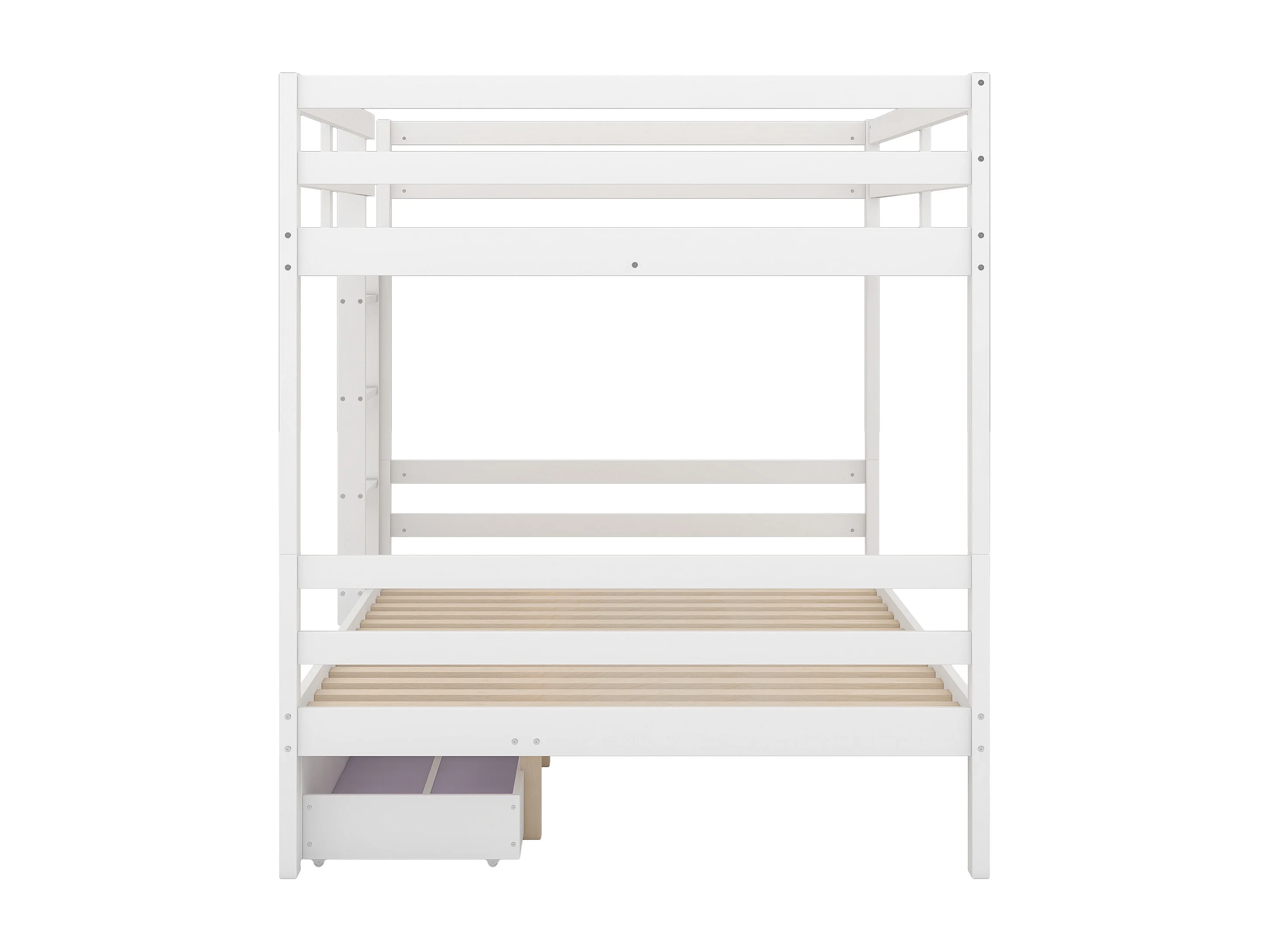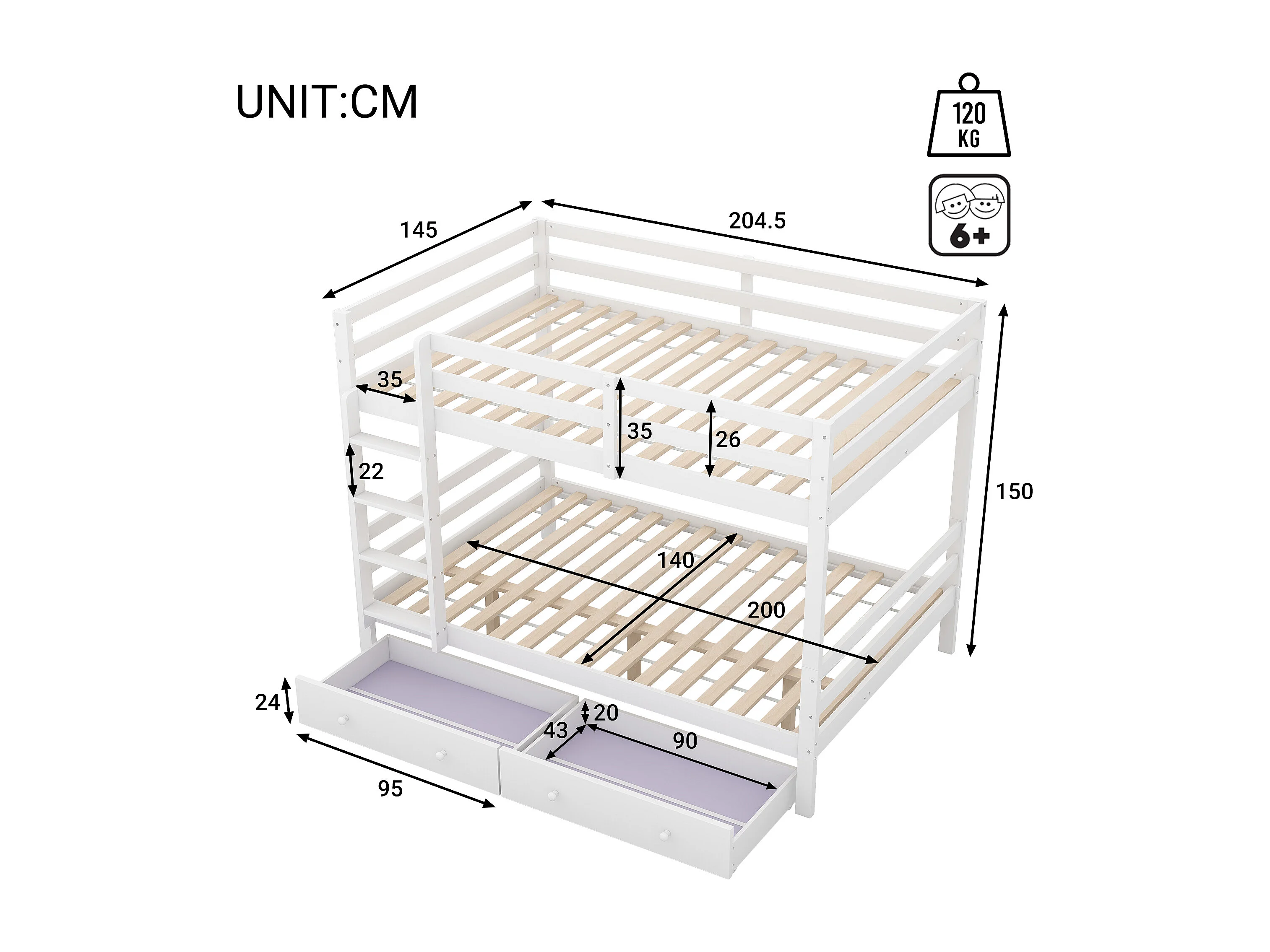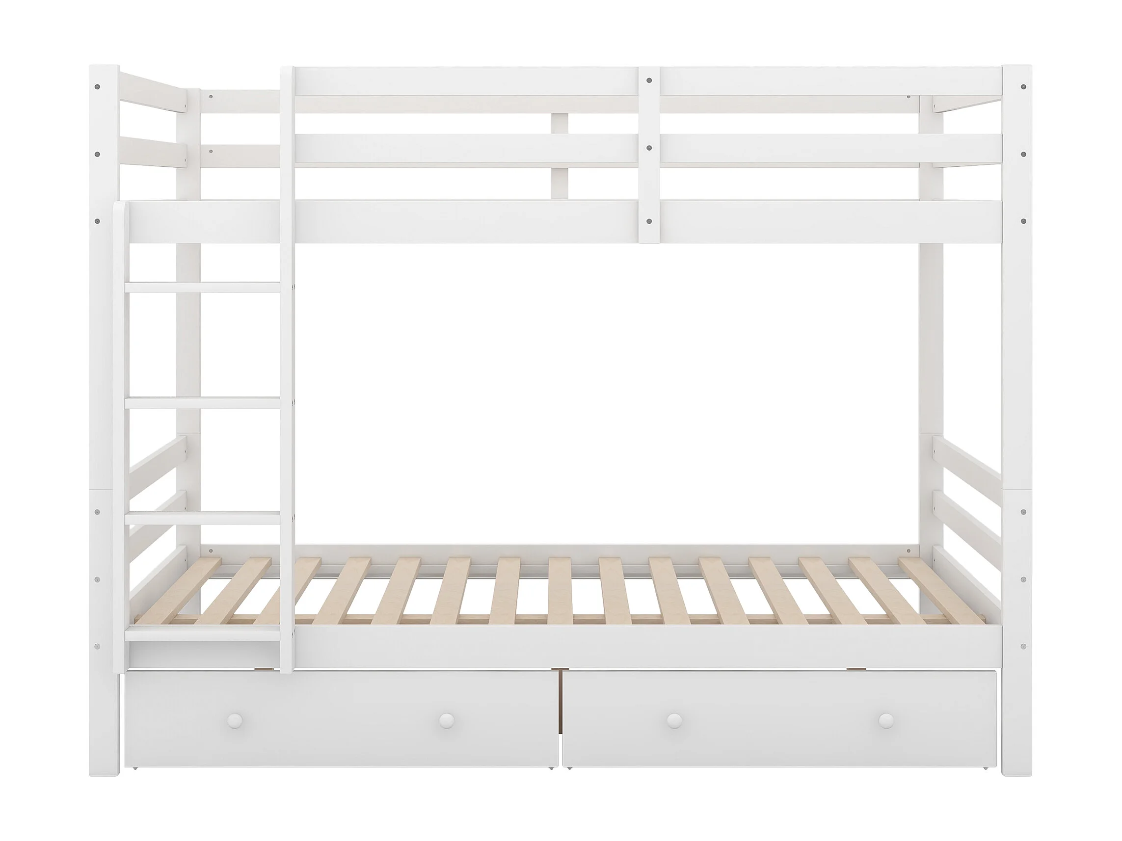 Lit superposé enfant 140x200 cm avec rangements, 2 sommiers, 2 tiroirs, Pin et MDF, blanc, sans matelas