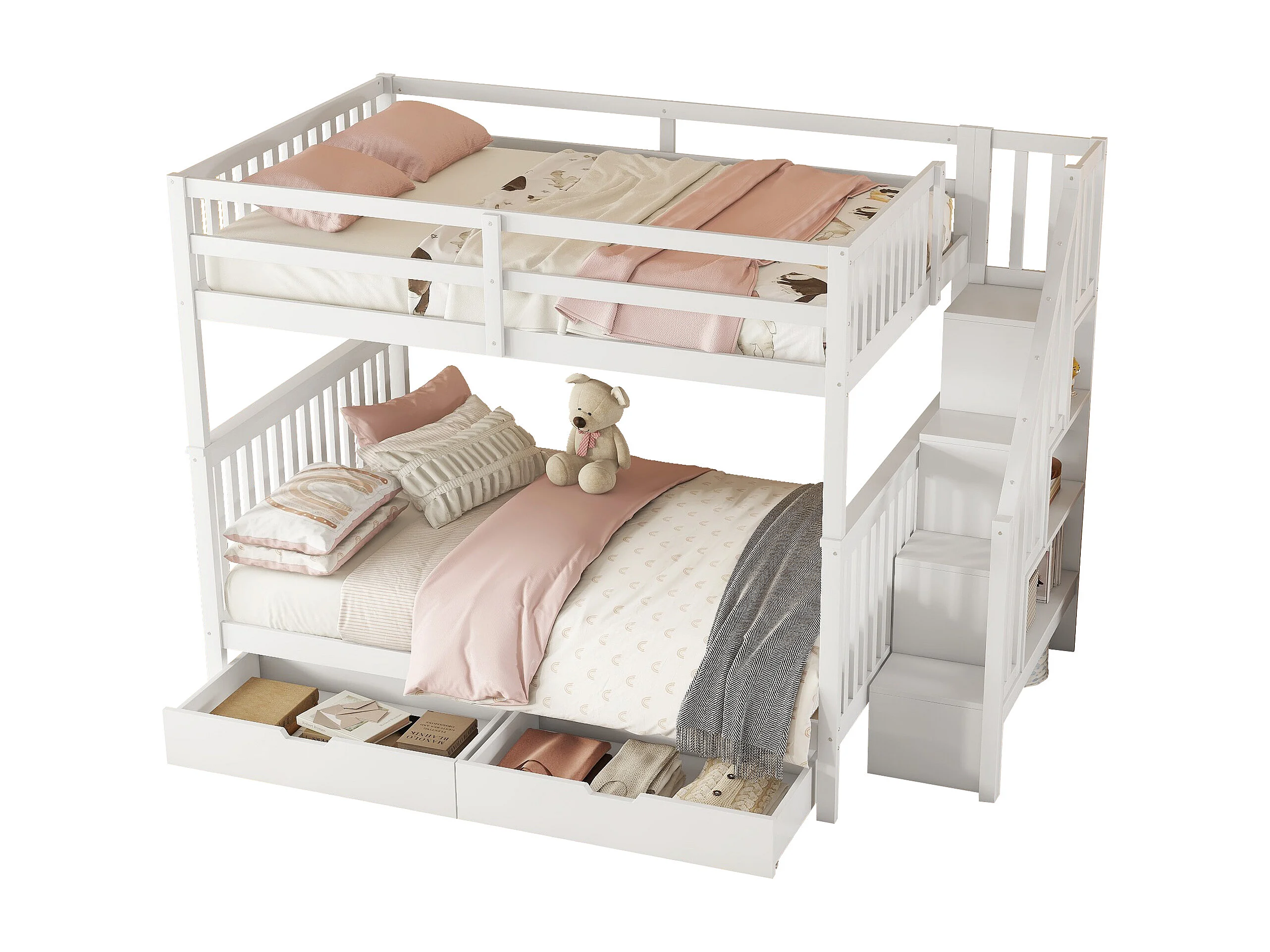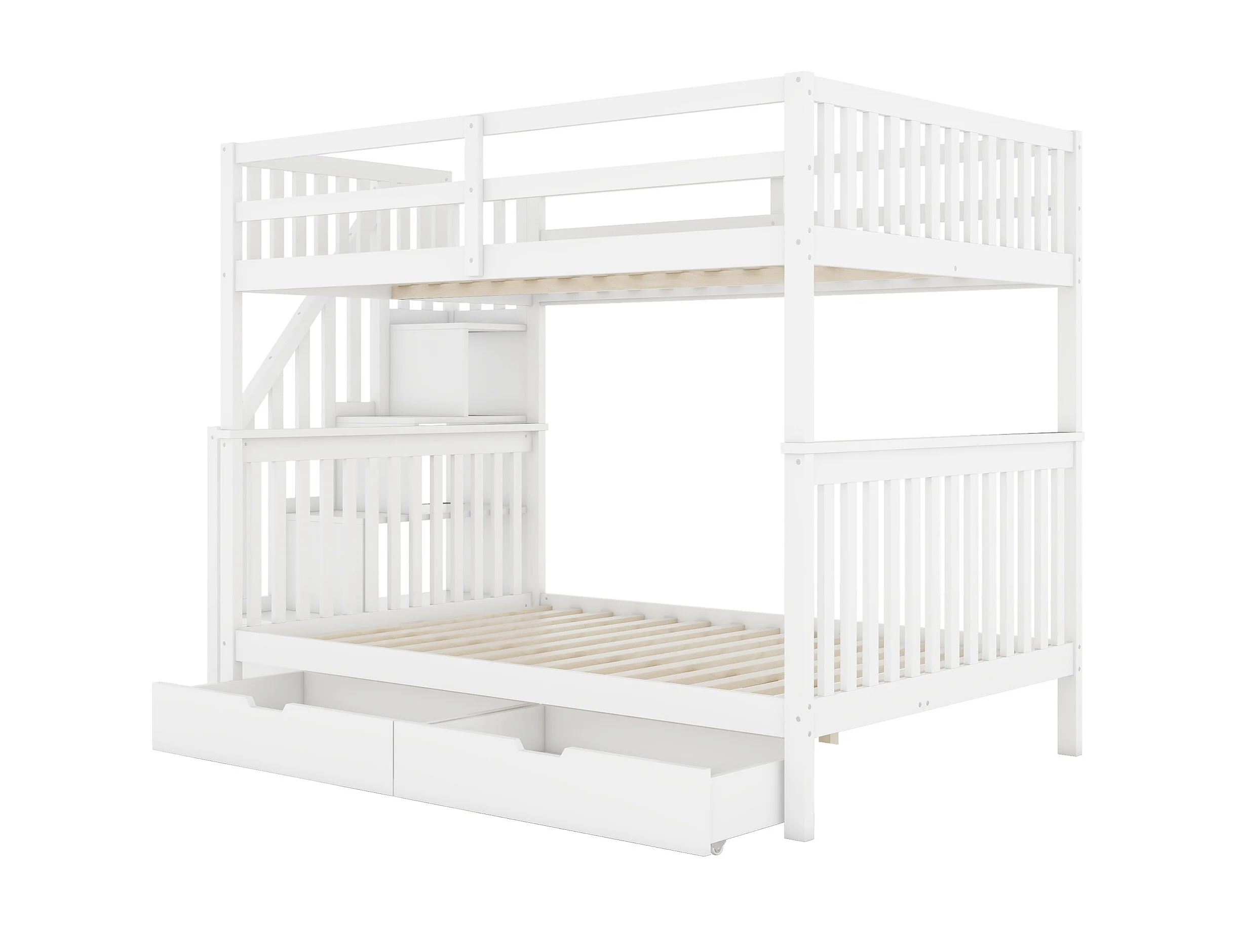 Lit superposé 140 x 200 cm - Structure avec escalier bibliothèque et 2 tiroirs - En pin+MDF - Barrières hautes EN747-1, Sans matelas - Blanc