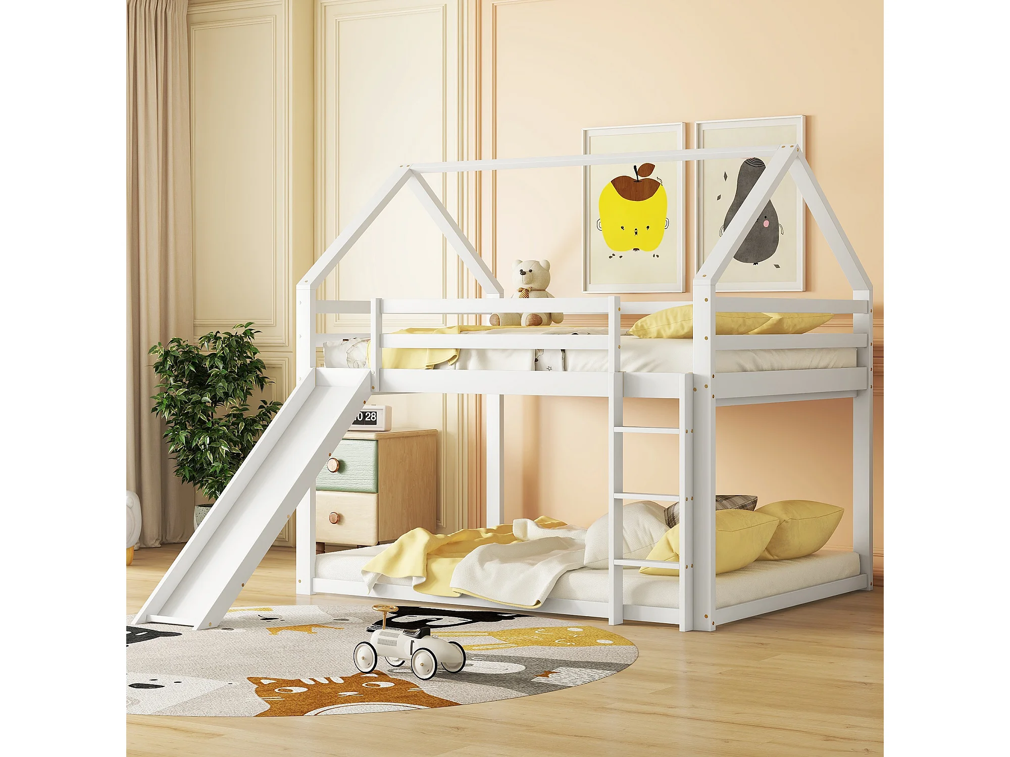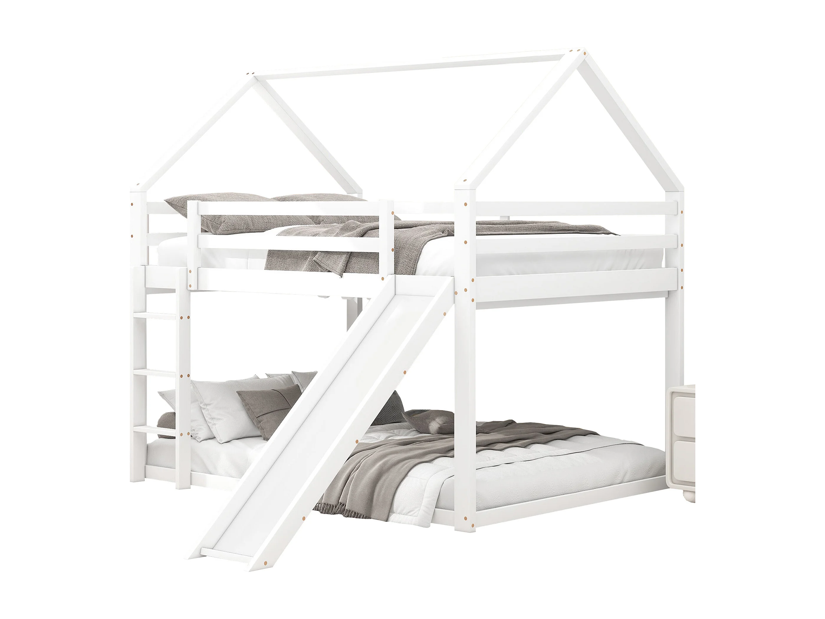 Lit superposé enfant 140x200cm avec toboggan et échelle, 1 sommier, lit cabane, Pin, MDF, blanc sans matelas