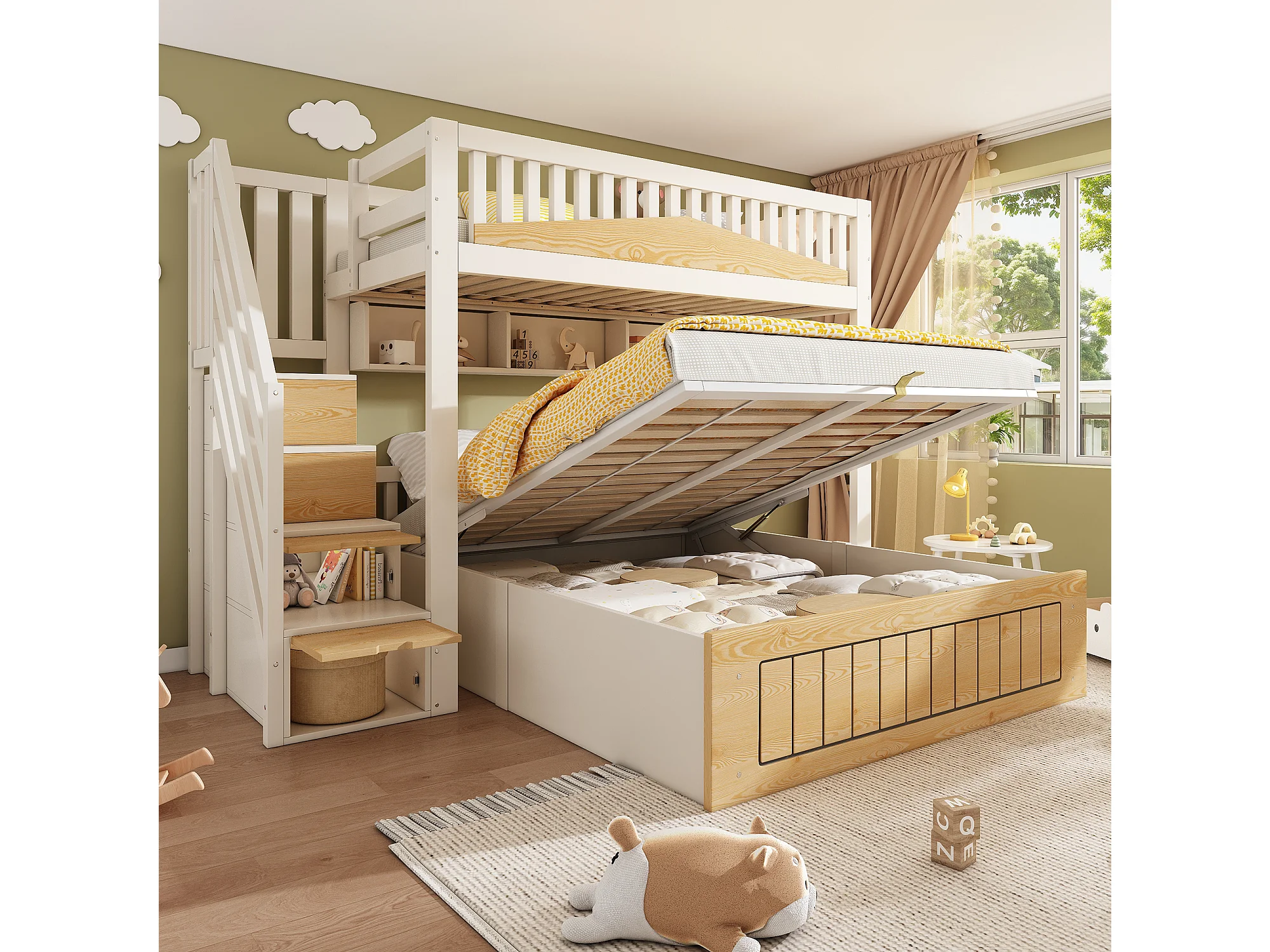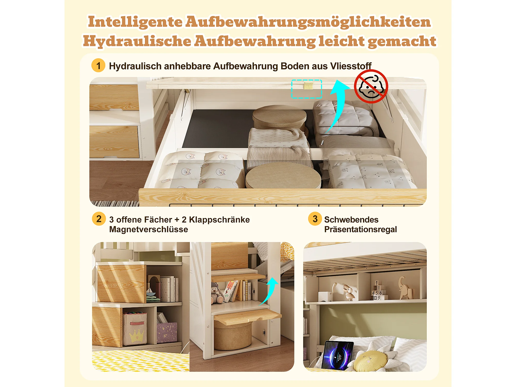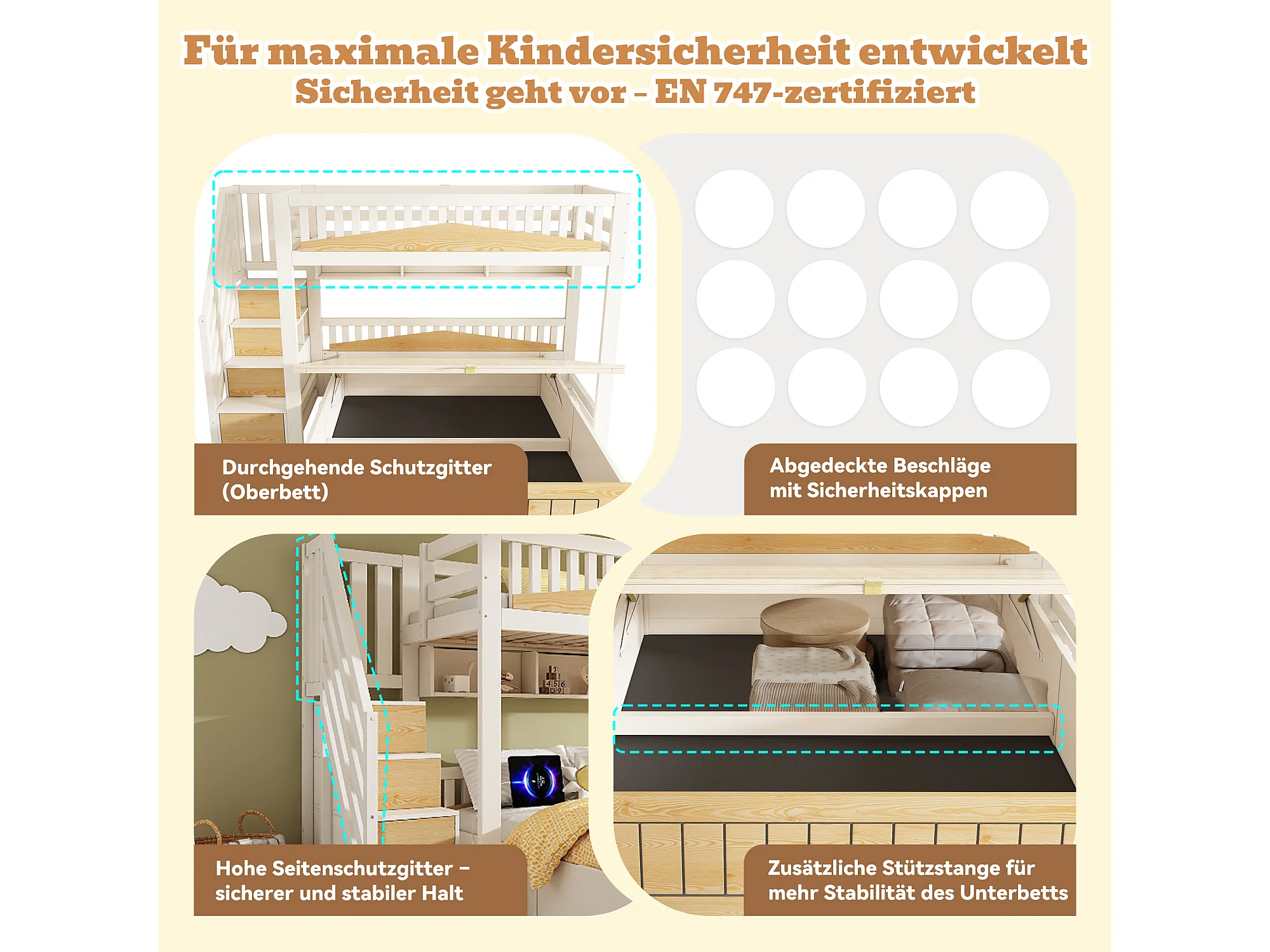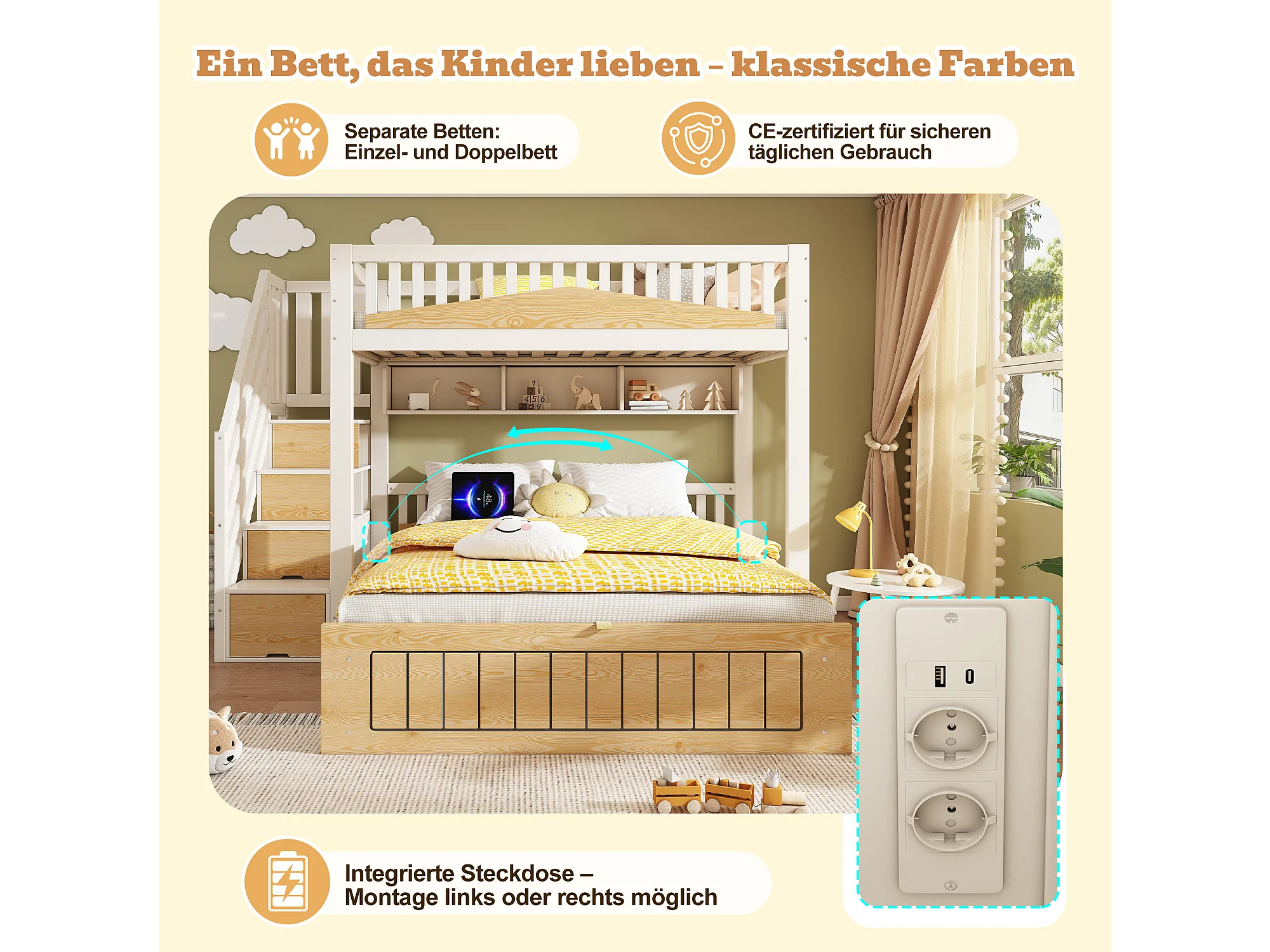 Lit superposé enfant - 90 x 200 + 140 x 200 cm - avec rangement hydraulique + escalier de rangement + USB - bois + métal - naturel