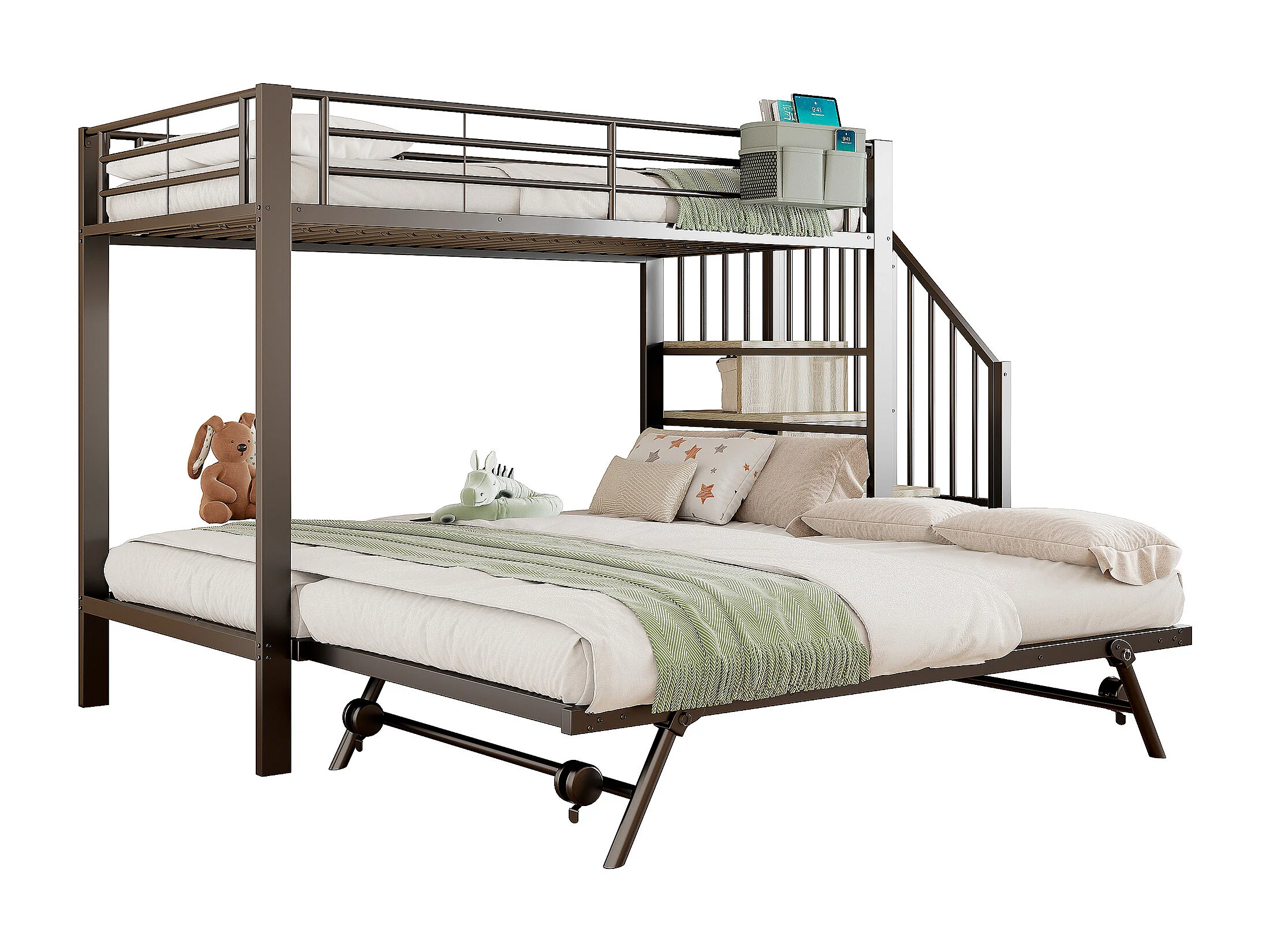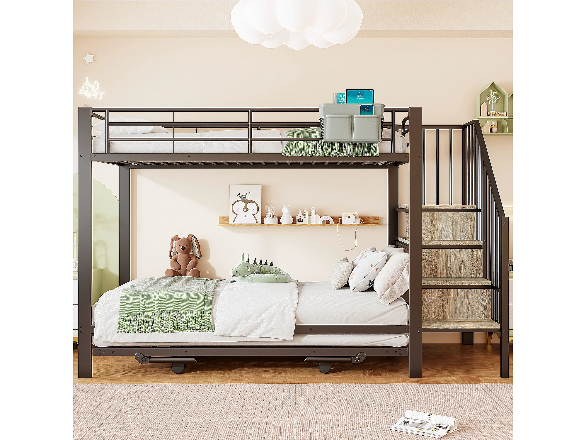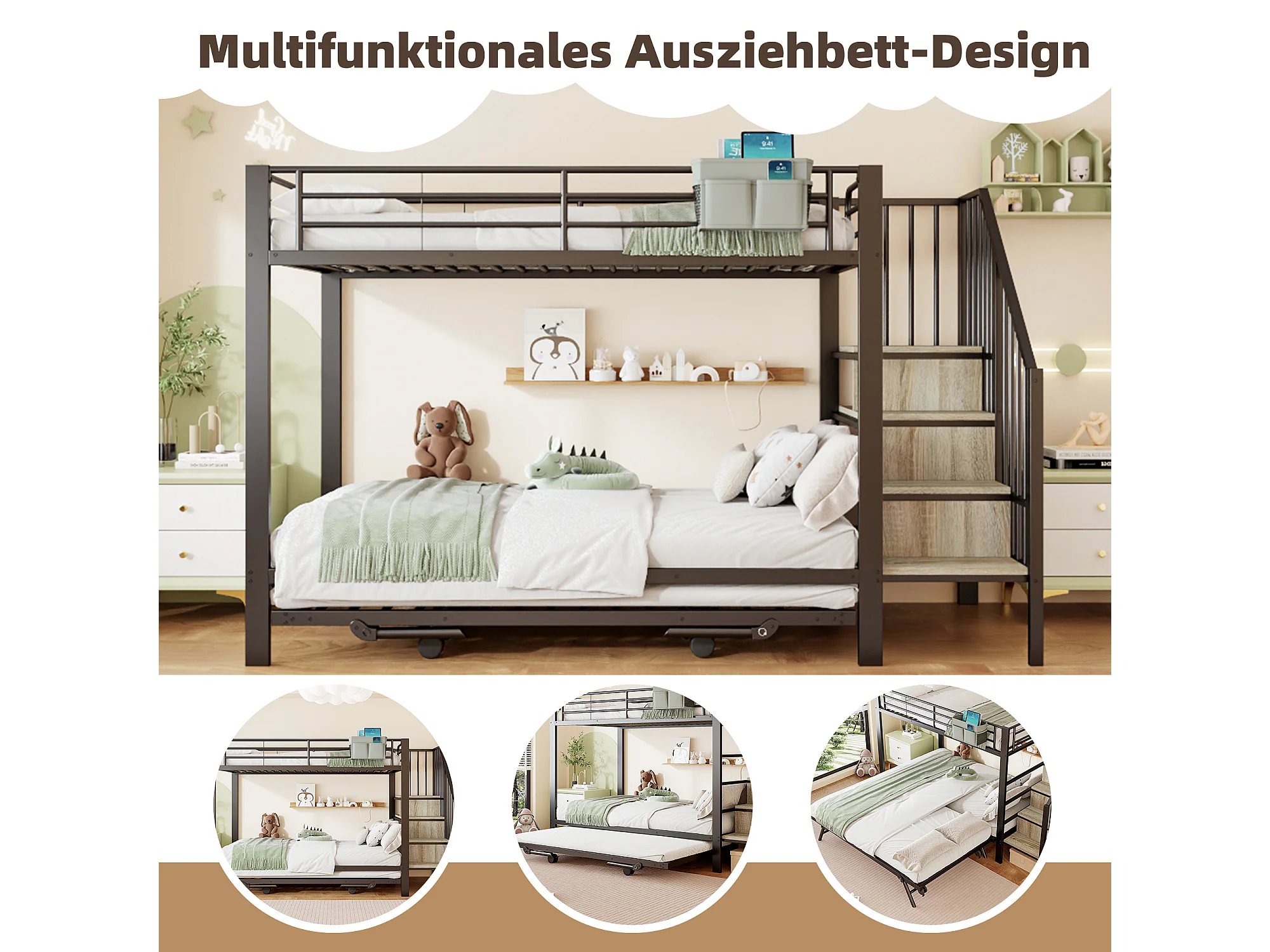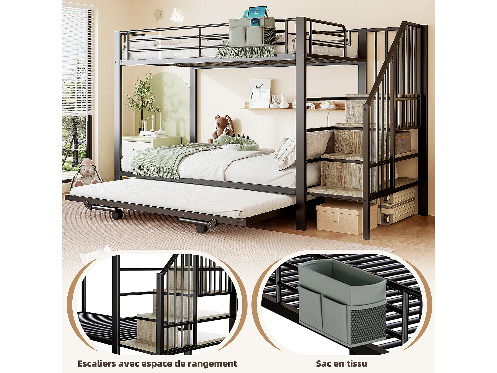Lit superposé enfant - 90 x 200 cm + 90(180) x 200 cm - structure en fer - lit gigogne - escalier de rangement - métal - noir