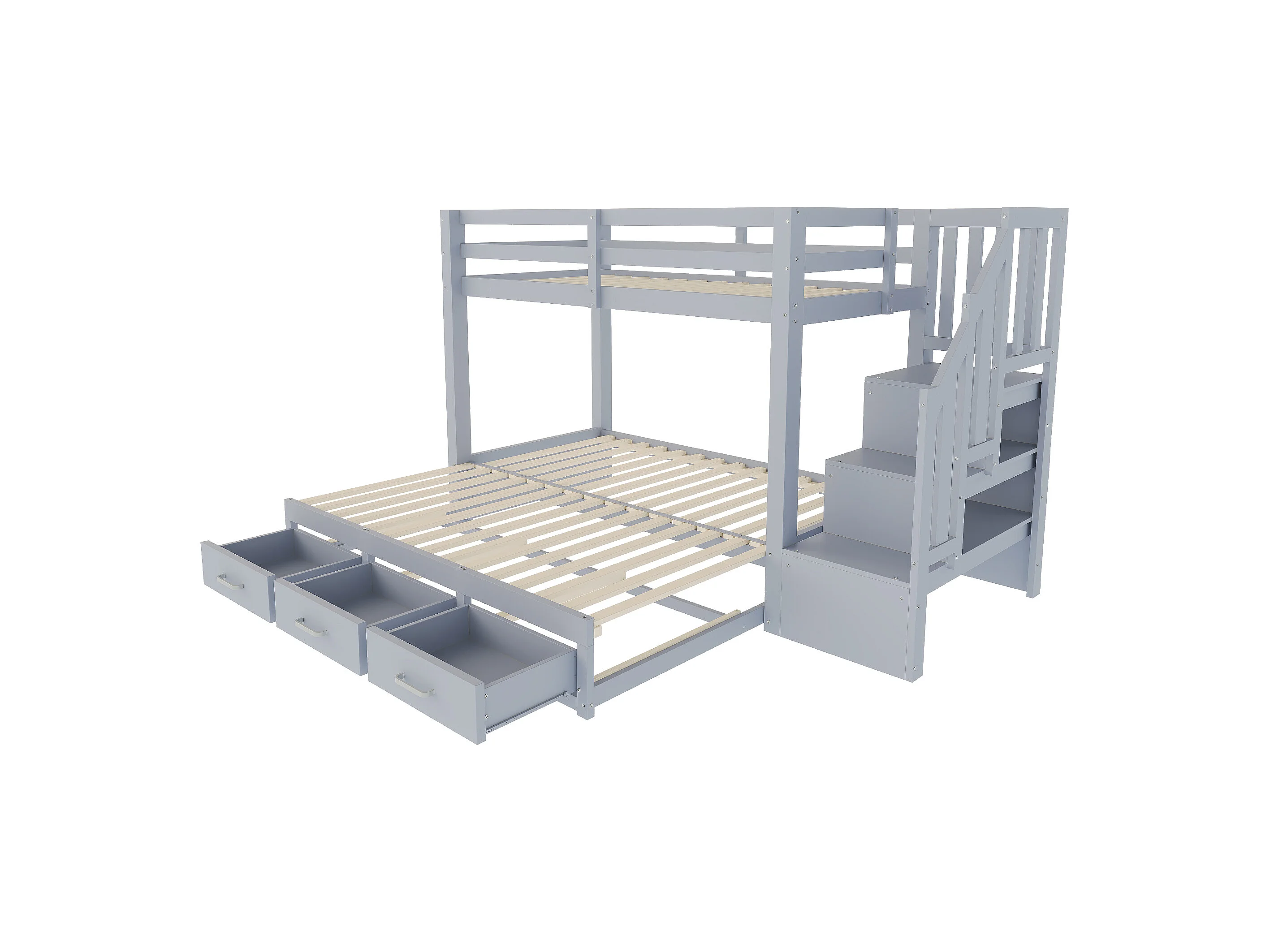 Lit superposé enfant - 90 x 200 cm - avec lit gigogne 90/180 x 190 cm + échelle de rangement + tiroirs - bois - gris