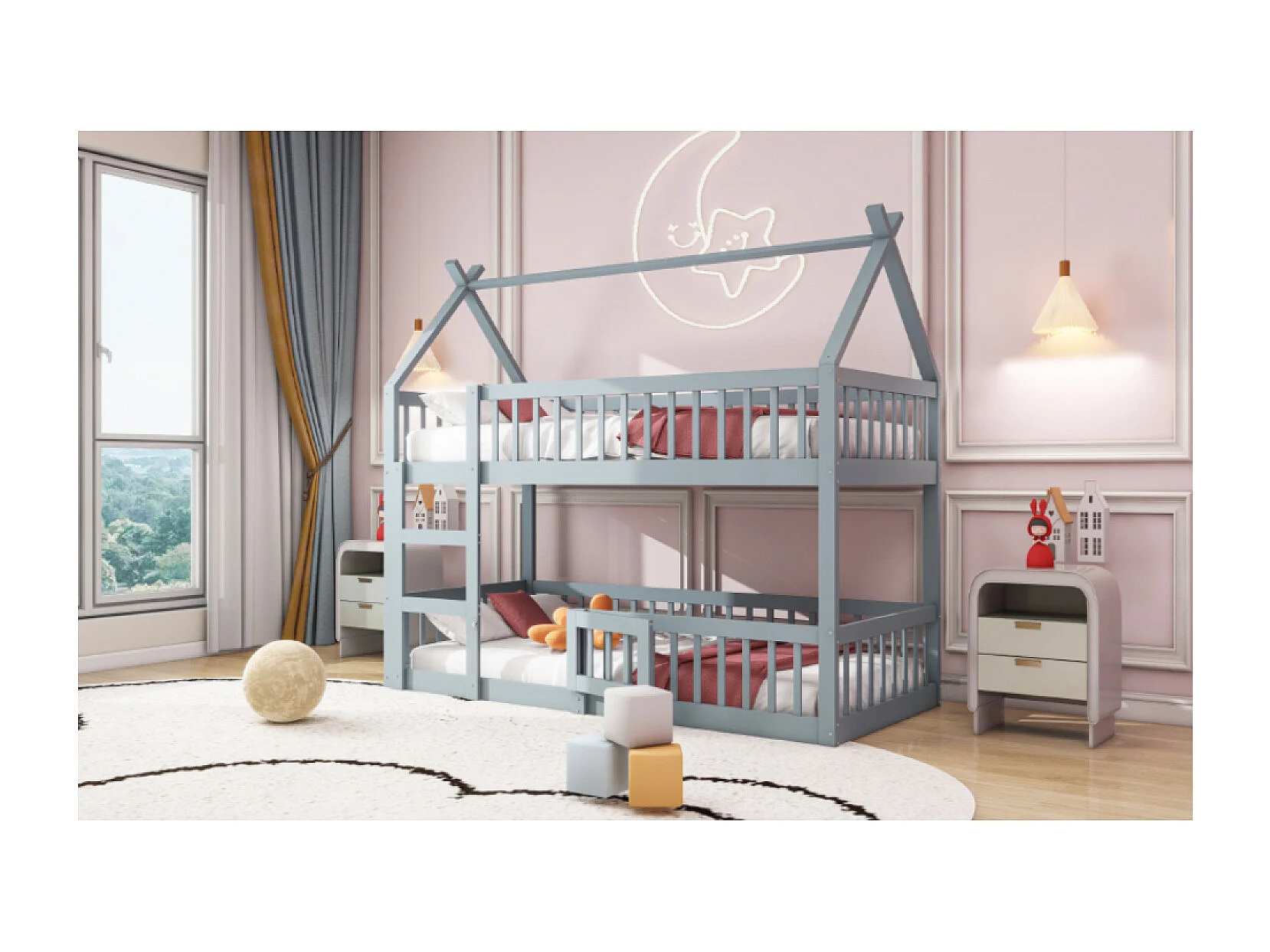 Lit superposé enfant 90x200 avec barrière de sécurité - Lit cabane en bois - Gris