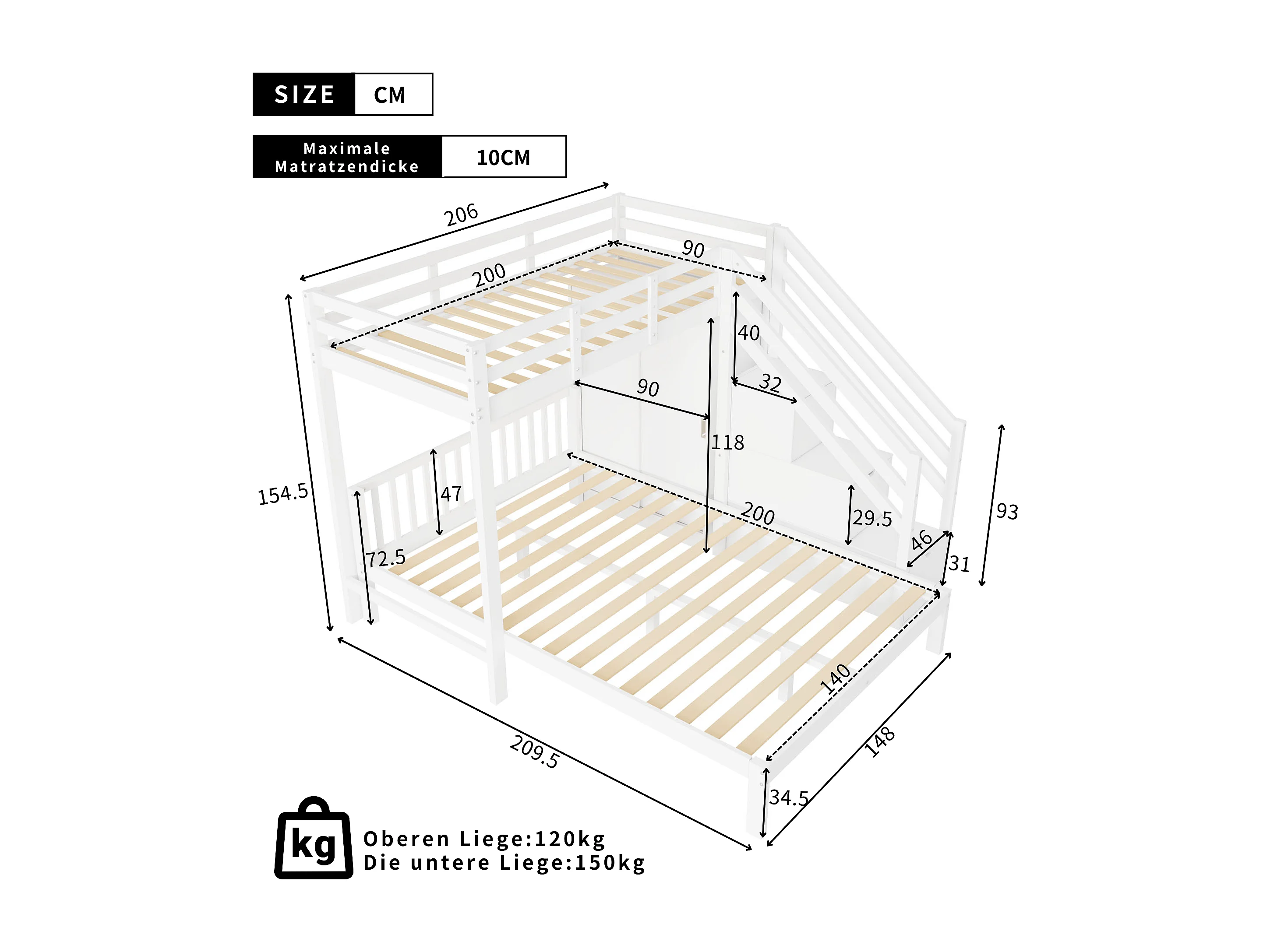 Lit superposé enfant 90x200 cm + 140x200 cm - avec armoire et escalier de rangement - en bois massif et MDF - Blanc