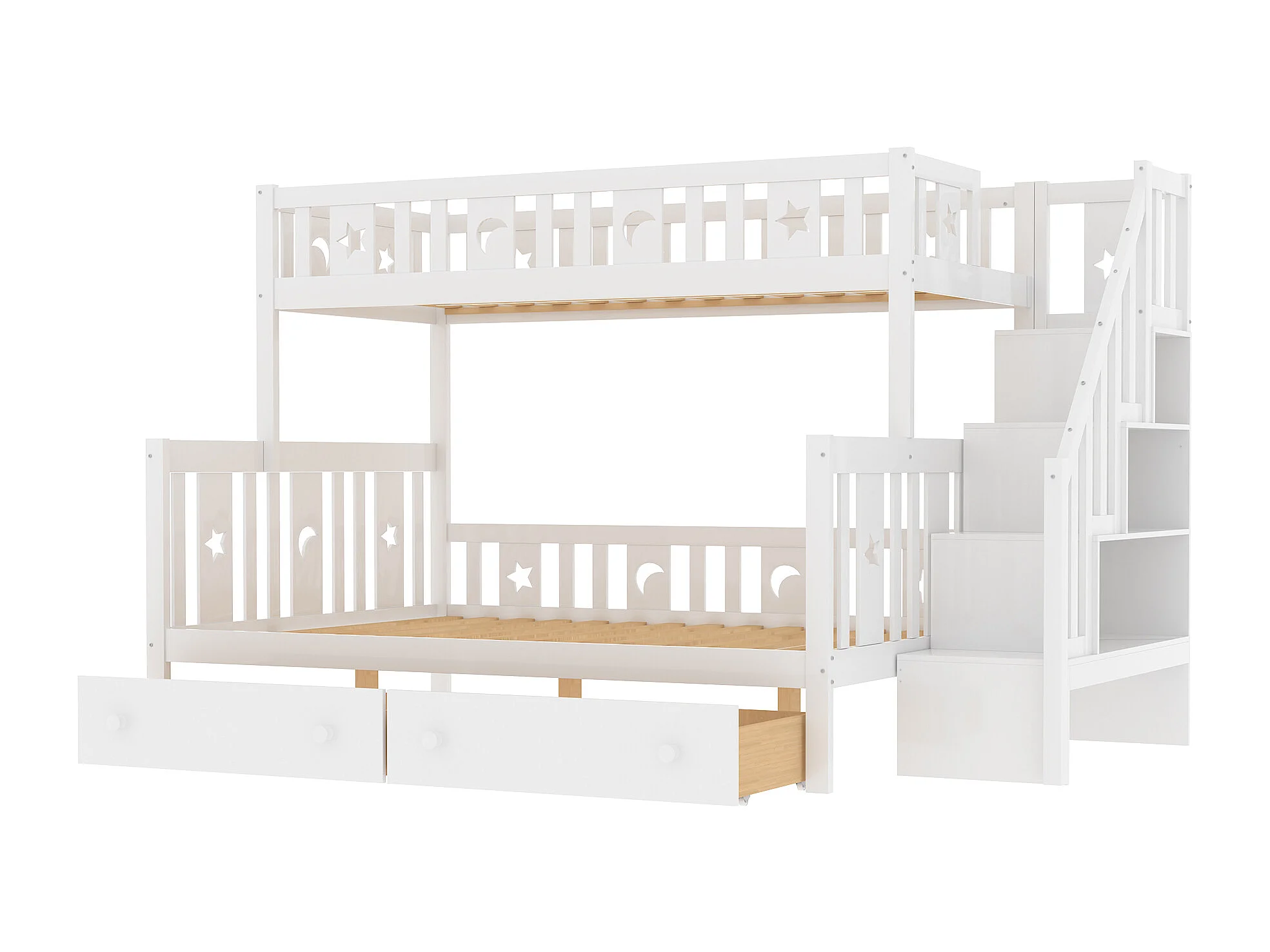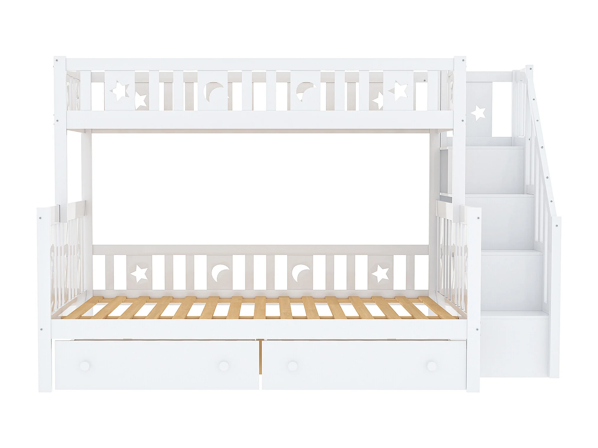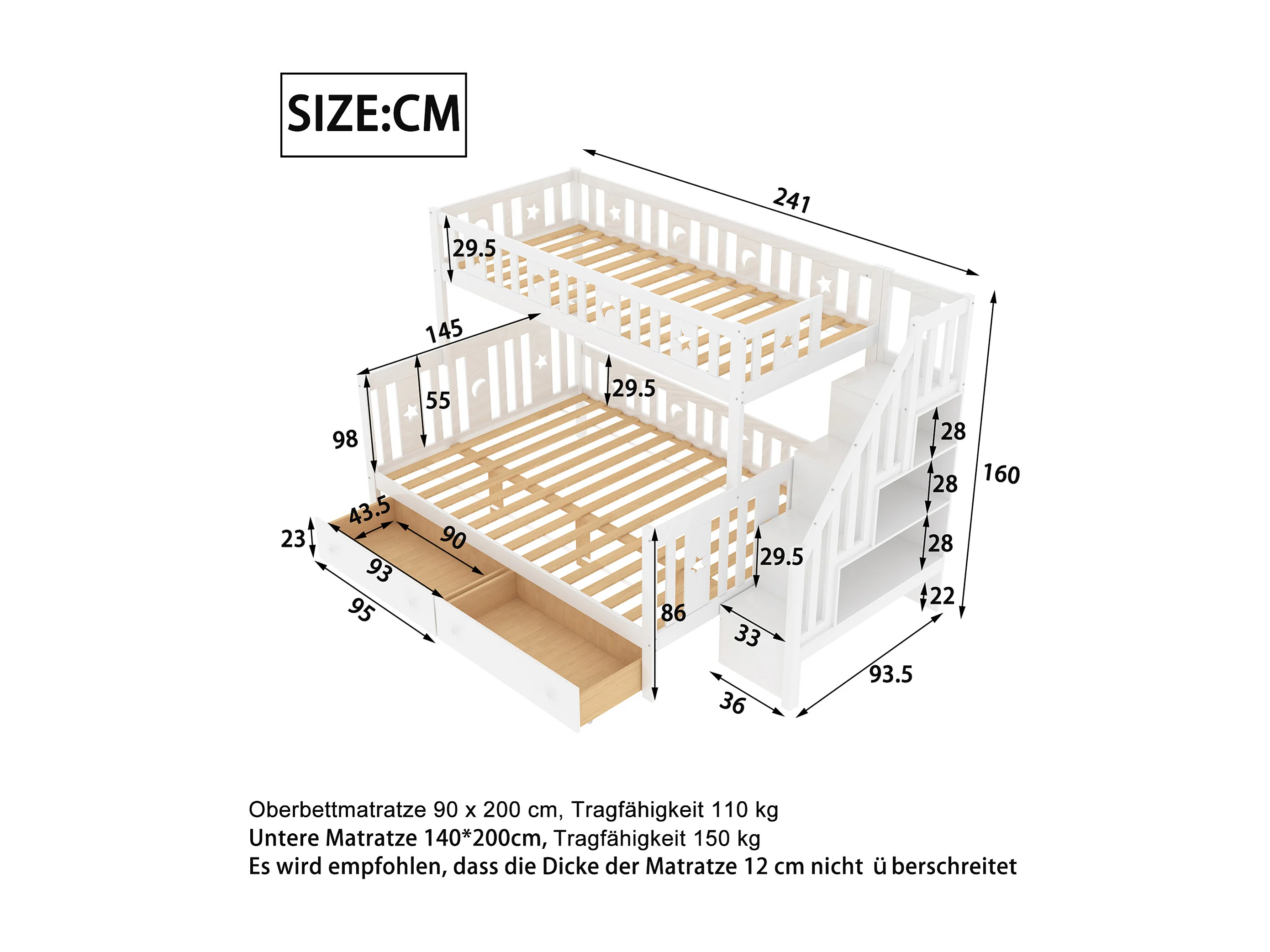 Lit superposé enfant 90x200 cm + 140x200 cm avec deux grands tiroirs et sommier à lattes - blanc