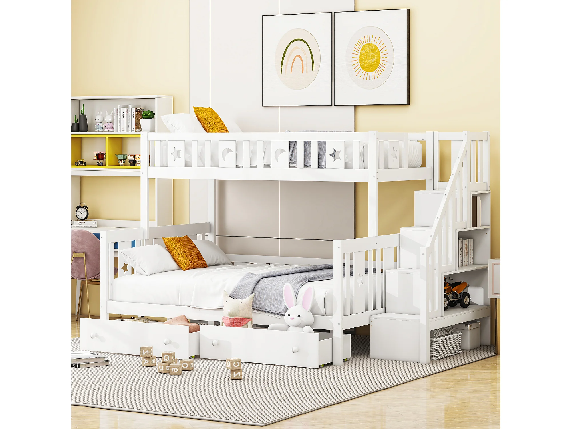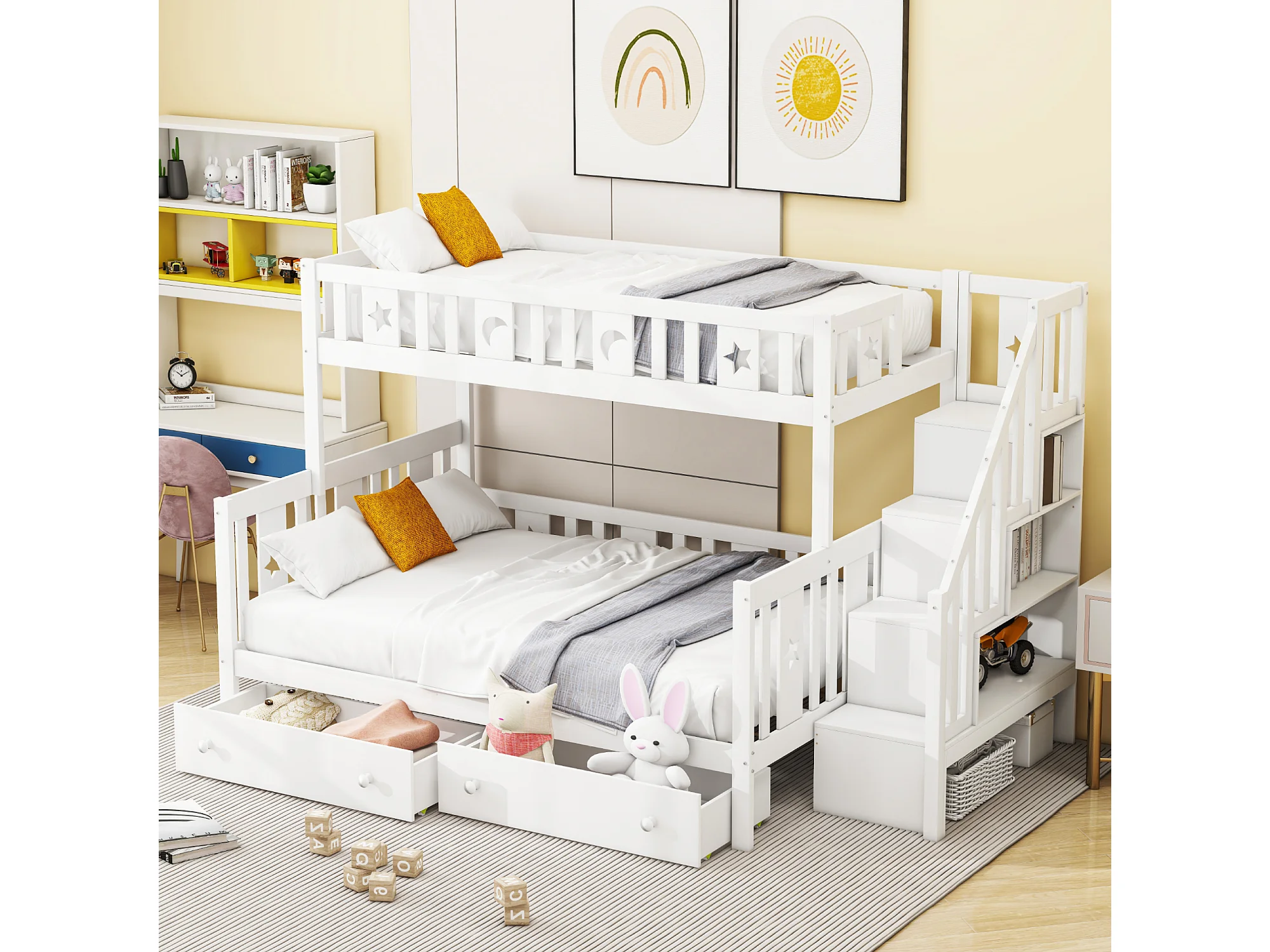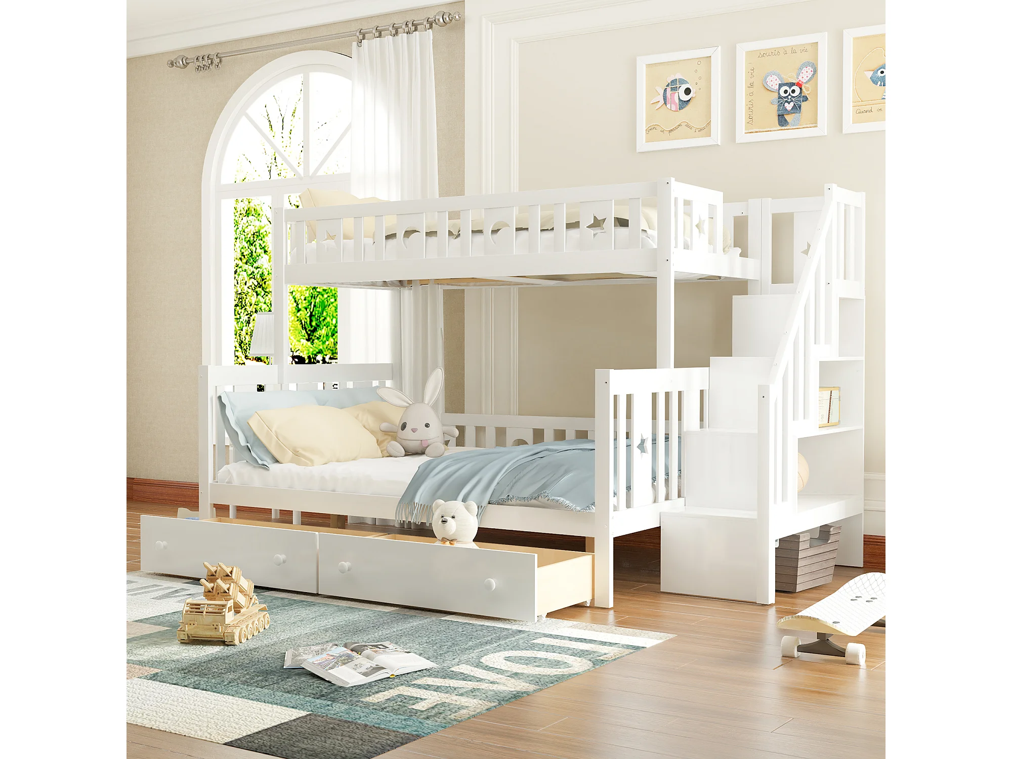 Lit superposé enfant 90x200 cm + 140x200 cm avec deux grands tiroirs et sommier à lattes - blanc