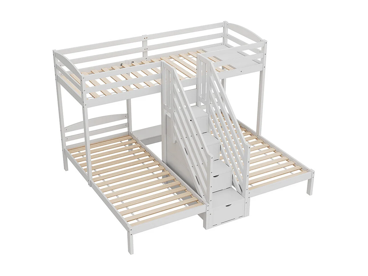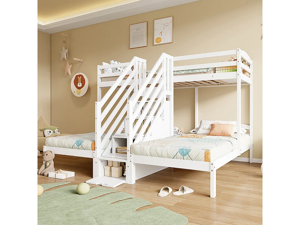 Lit superposé enfant 90x200 cm 3 lits bois de pin échelle escamotable avec tiroirs barrière de sécurité blanc