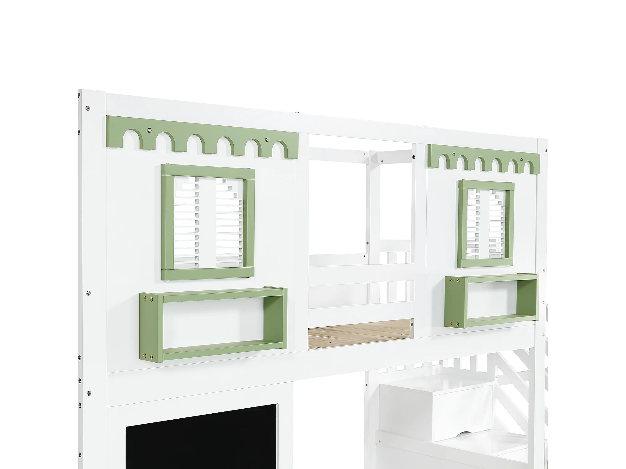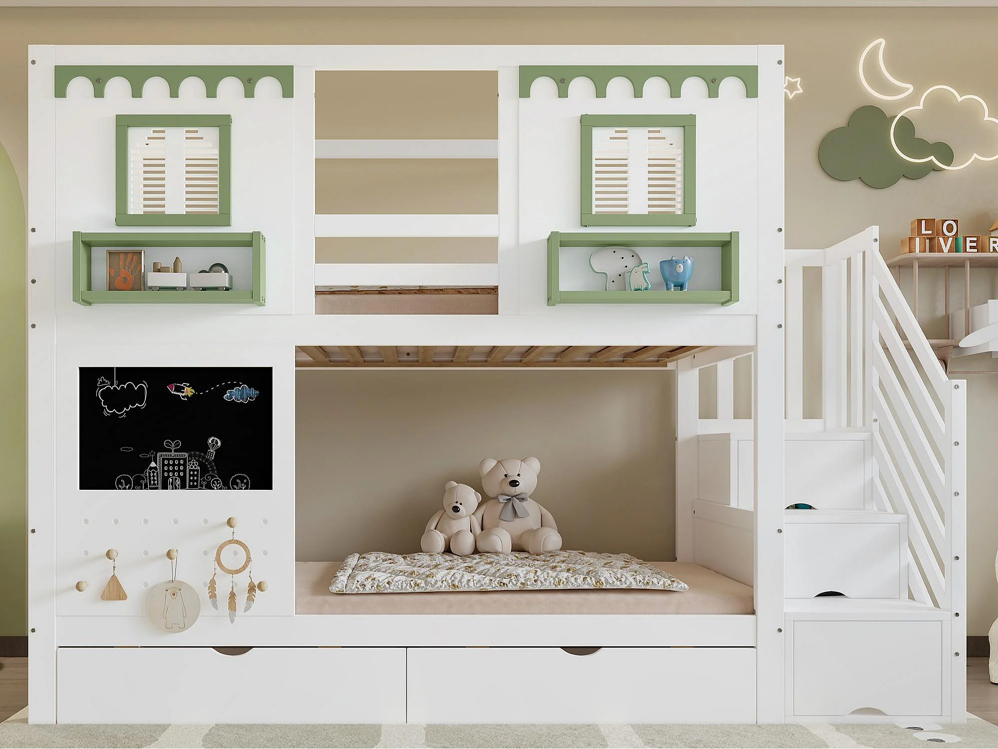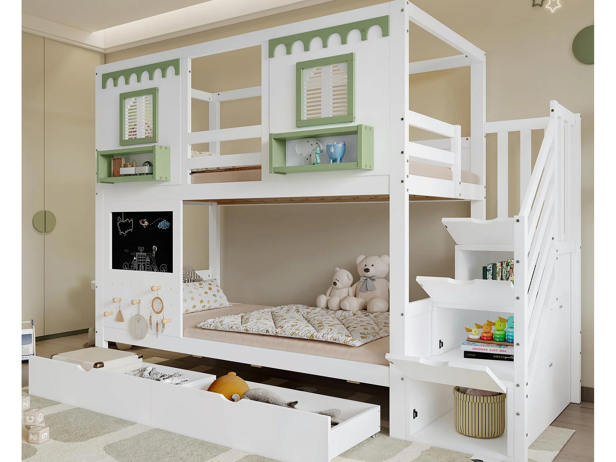 Lit superposé enfant 90x200 cm - avec escalier de rangement - avec tableau noir et panneau perforé - avec 2 tiroirs - blanc + vert (sans matelas)