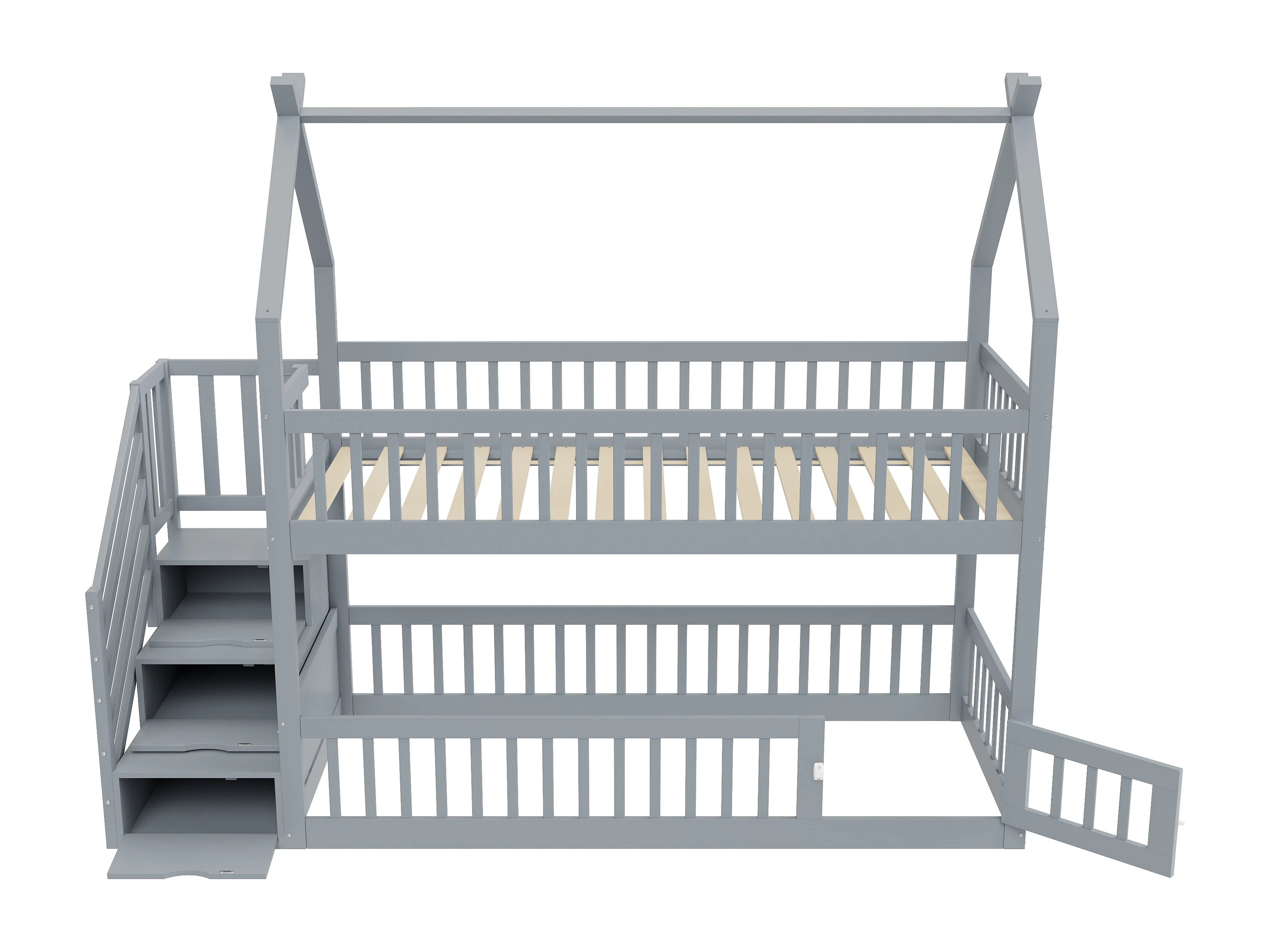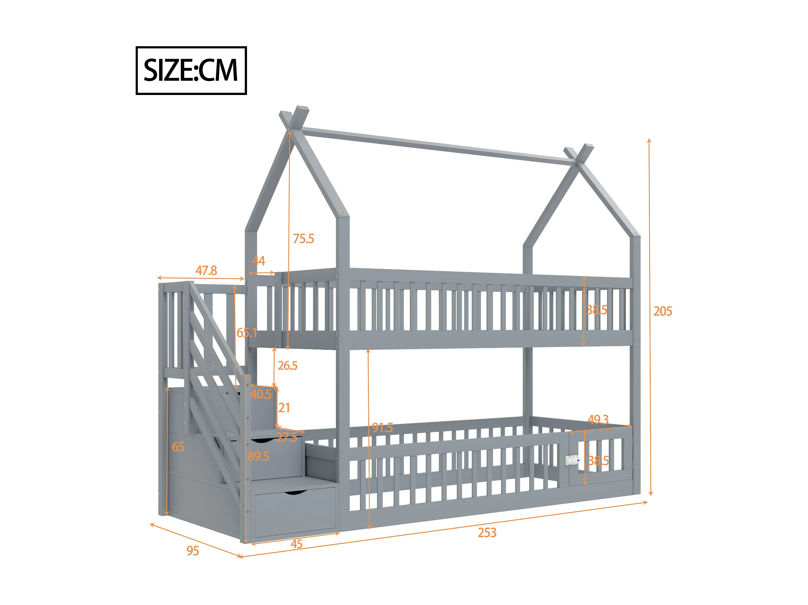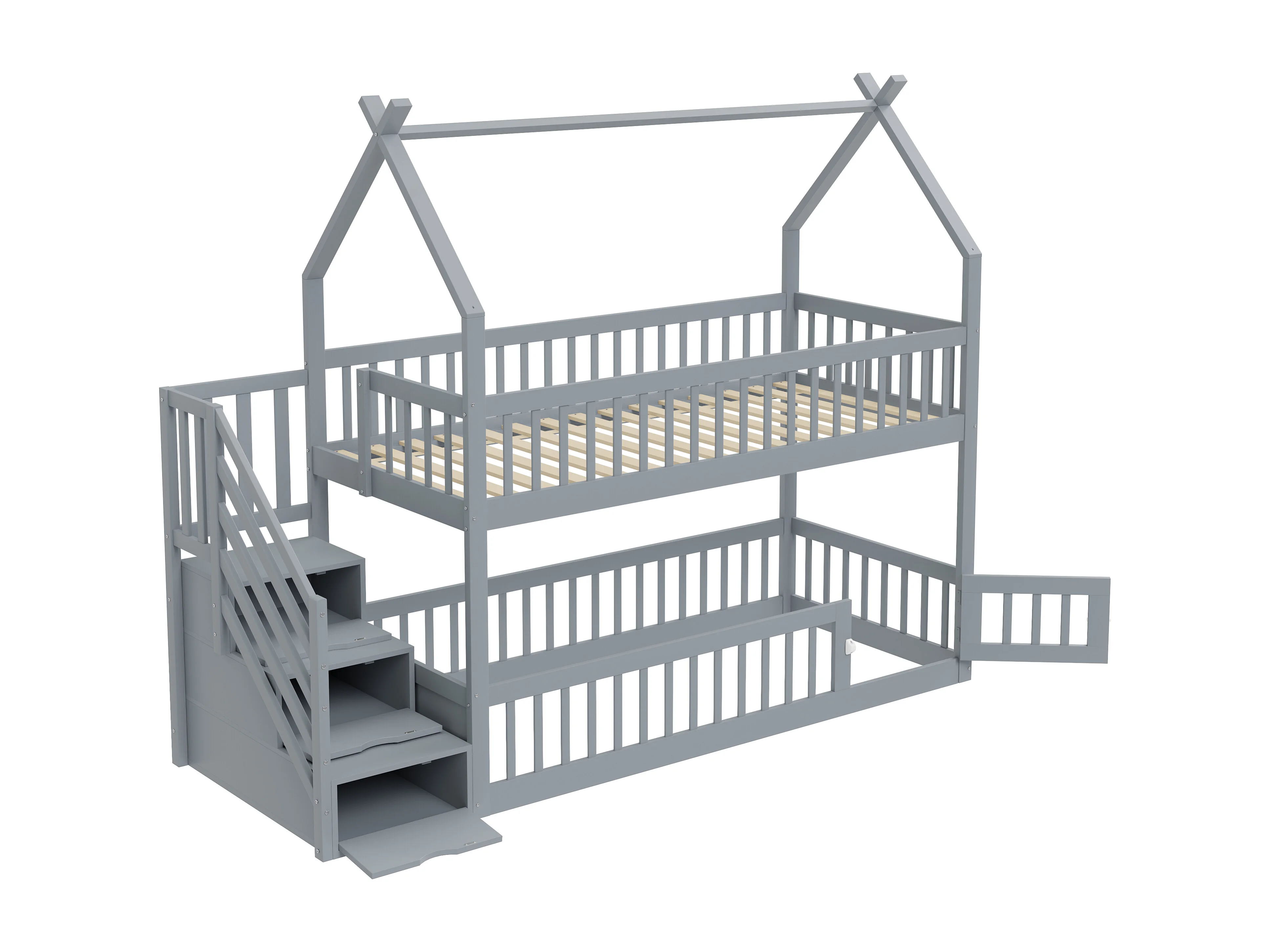 Lit superposé enfant 90x200 cm avec toit, échelle de sécurité et rangement, Bois et MDF, gris, sans matelas