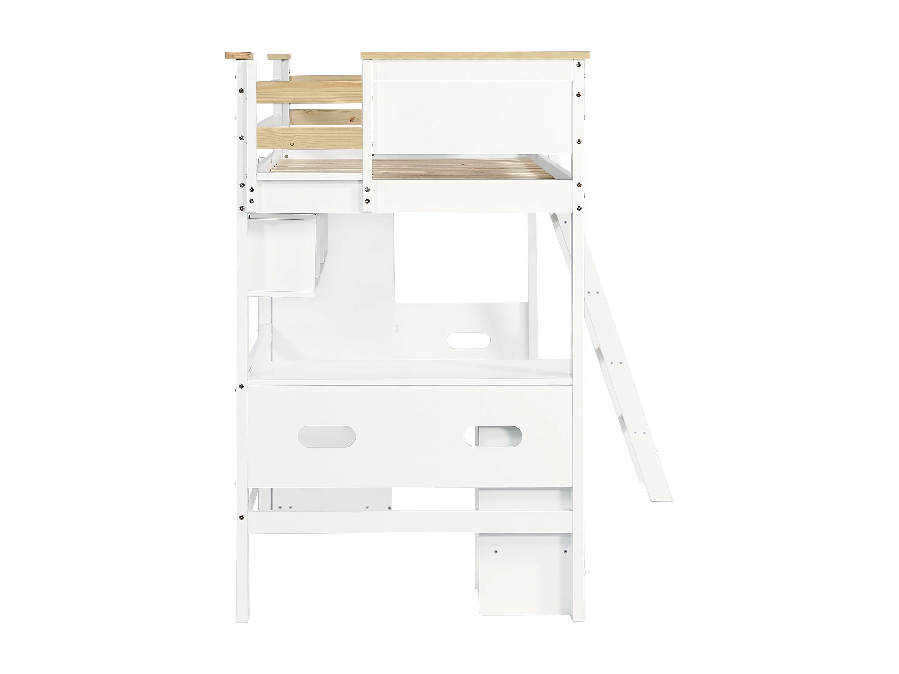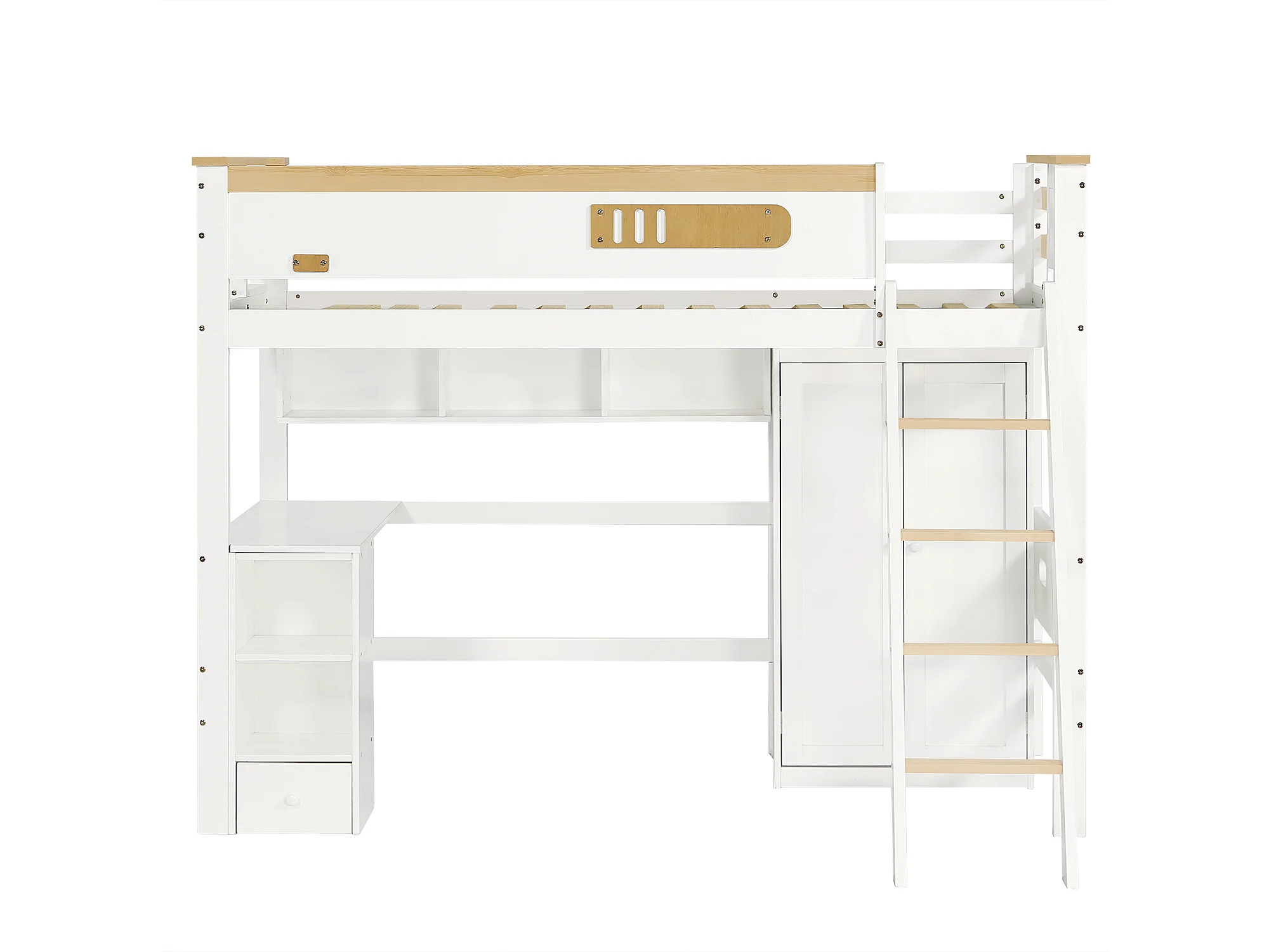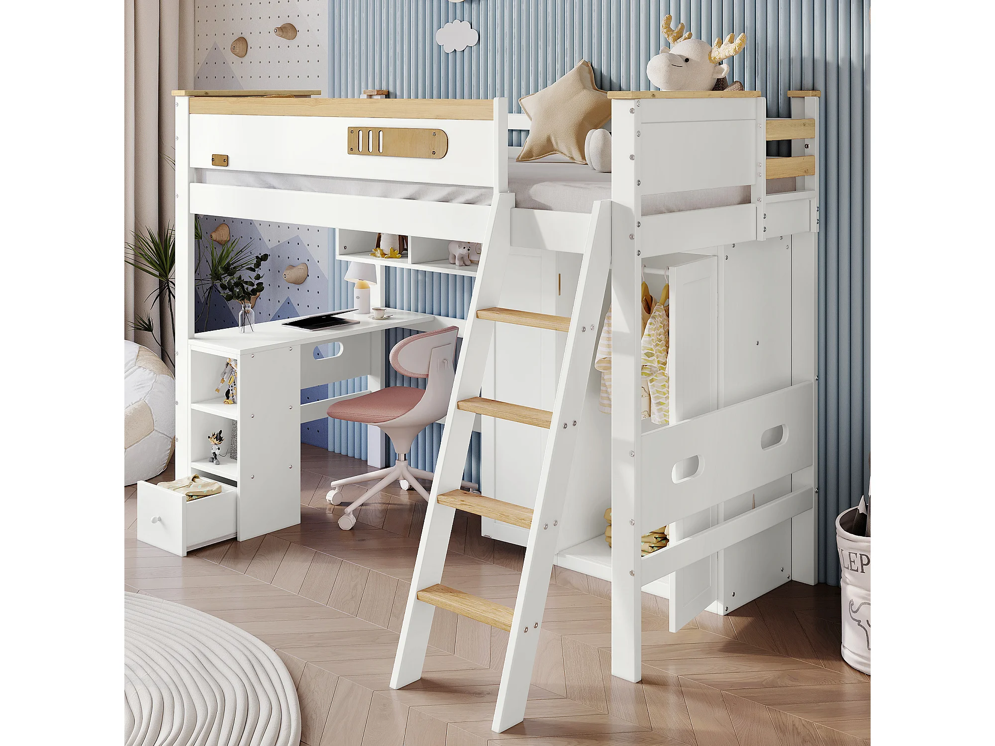 Lit superposé enfant 90x200 cm – Barrière sécurité, table, armoire, étagère, échelle 4 marches, pin + MDF + contreplaqué blanc/naturel