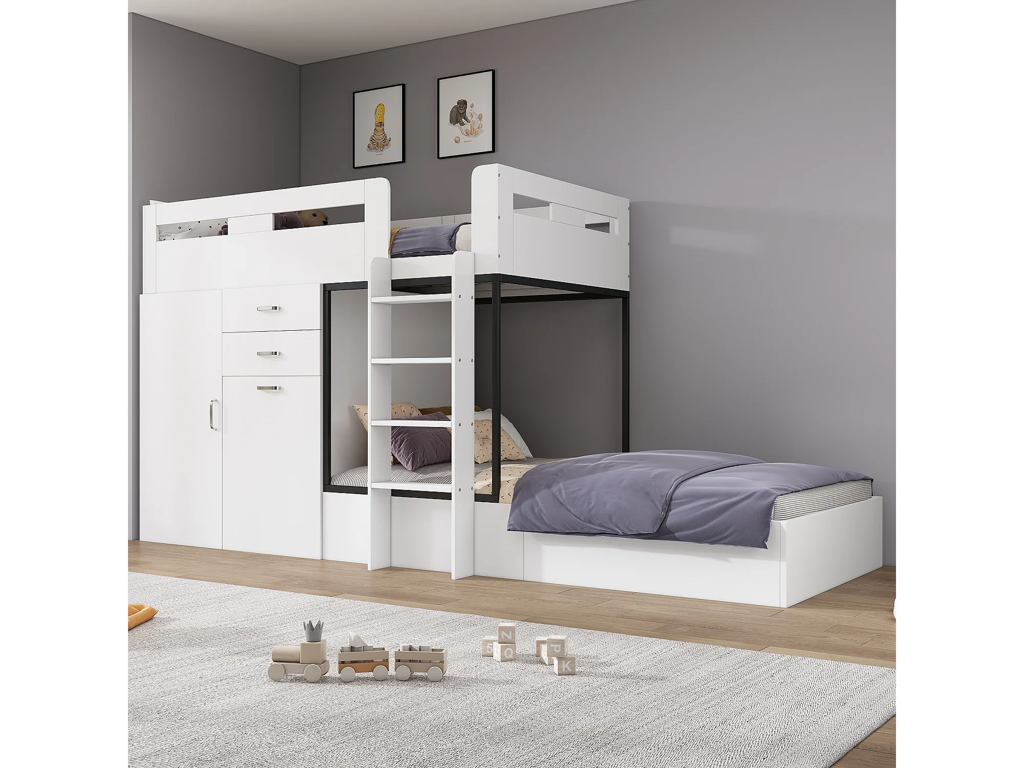 Lit superposé enfant 90×200 cm blanc, avec bureau coulissant, penderie, tiroirs et étagères, bois, sans matelas
