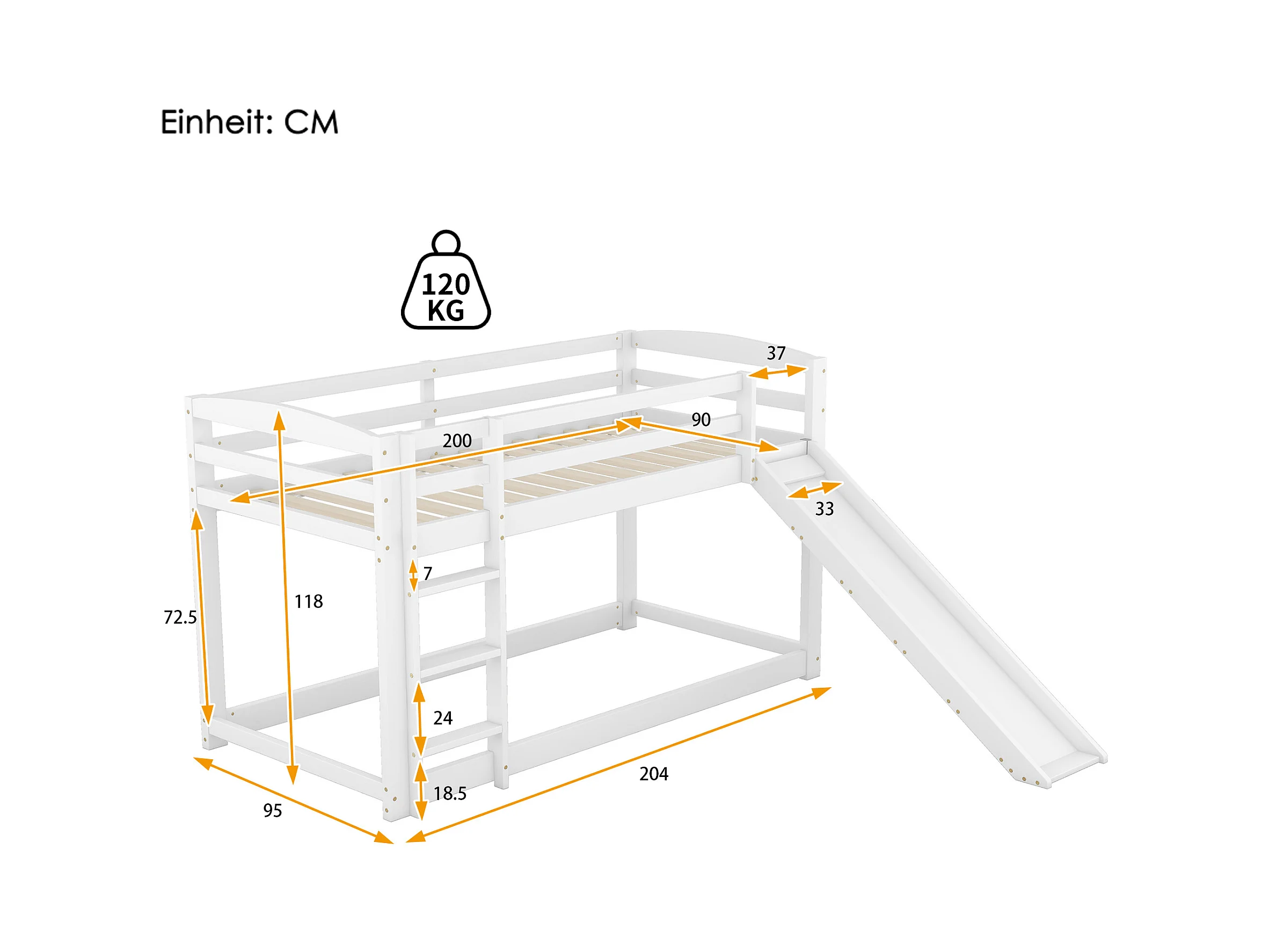 Lit superposé enfant 90x200 cm blanc avec toboggan, cadre en bois massif, montage facile et design ludique