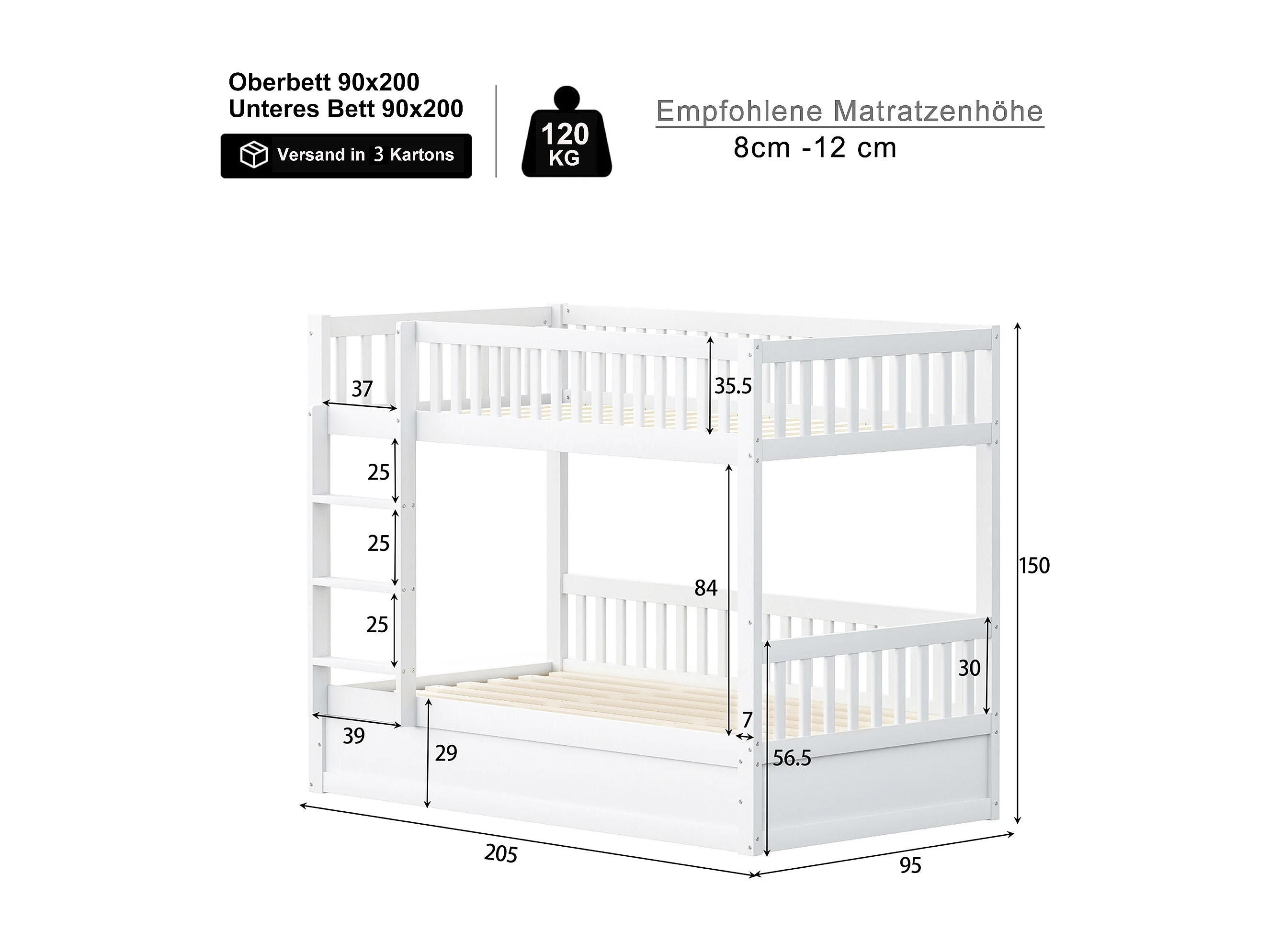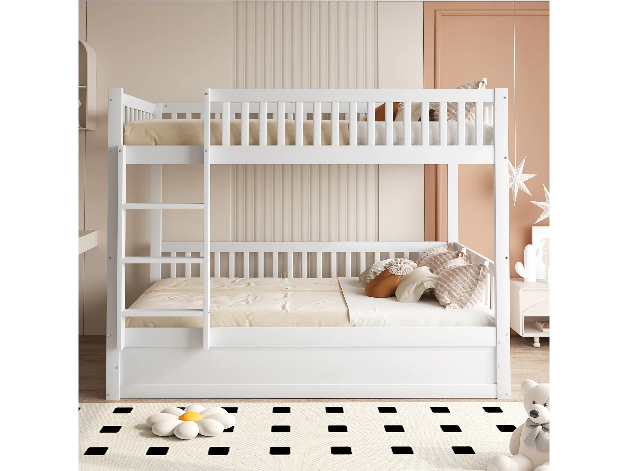 Lit superposé enfant 90x200 cm, bois massif, système de rangement hydraulique, lit robuste et durable pour enfants, blanc