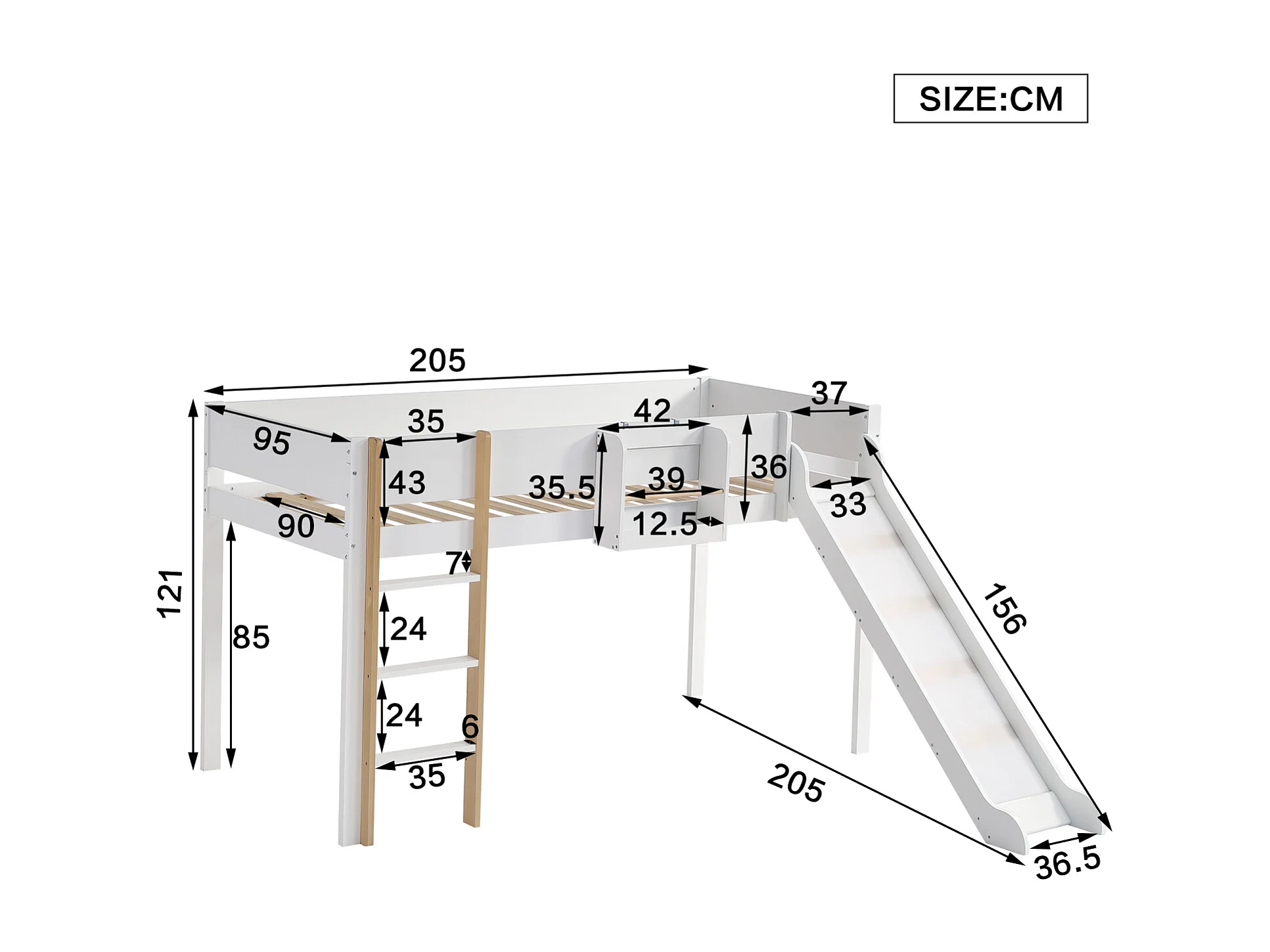 Lit superposé enfant 90x200 cm – Échelle droite 3 marches, toboggan, étagère coulissante, pin + MDF