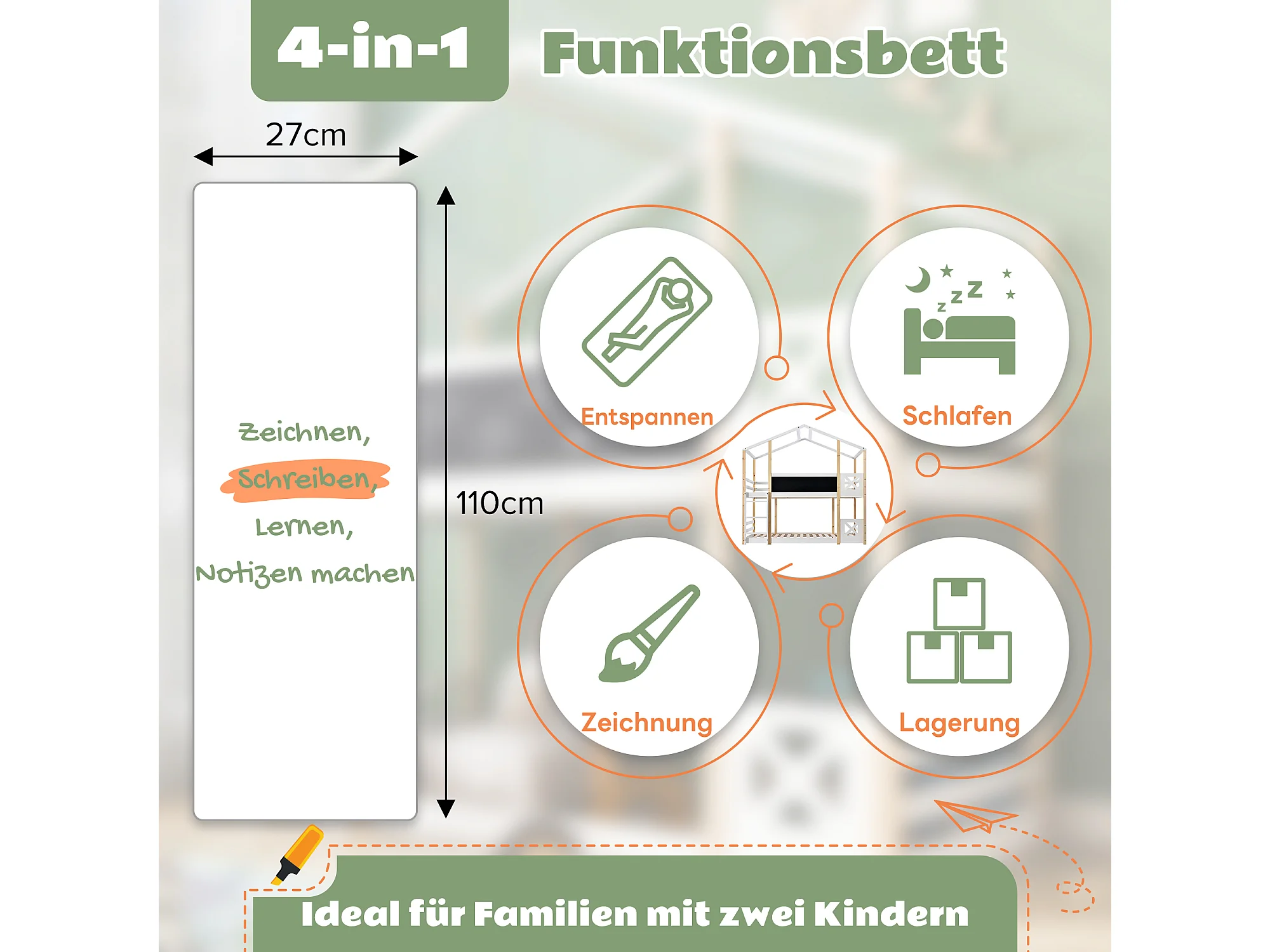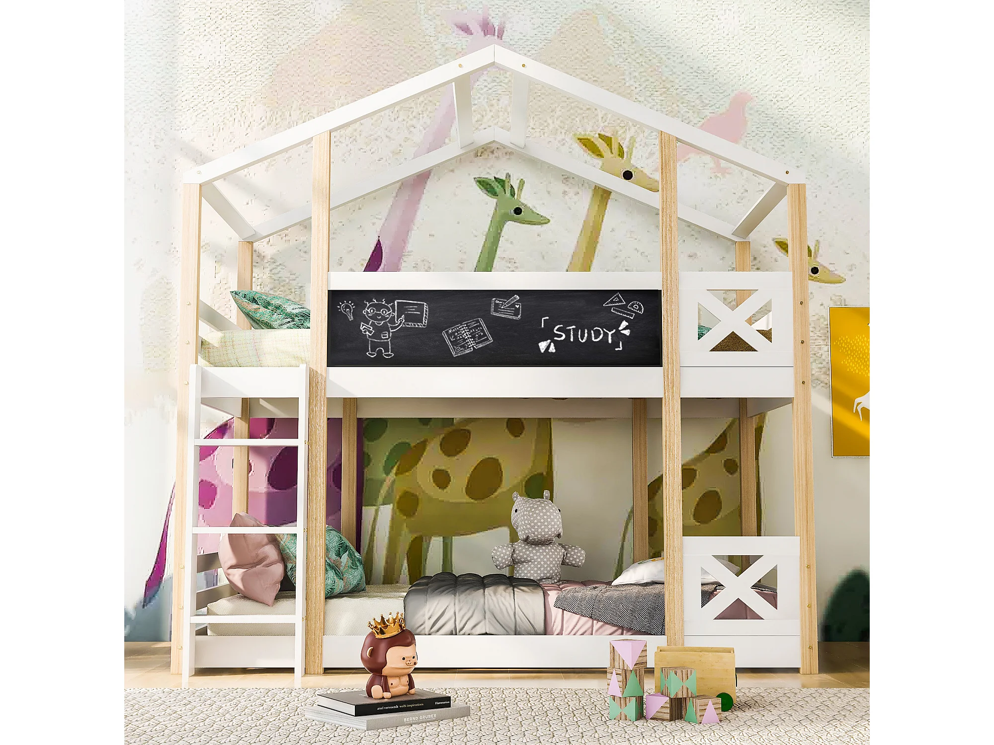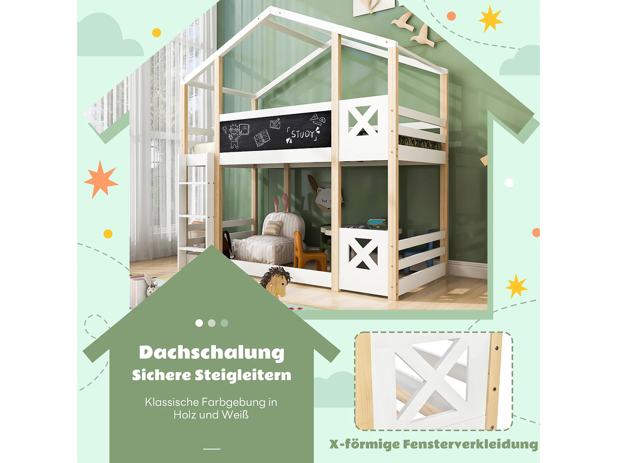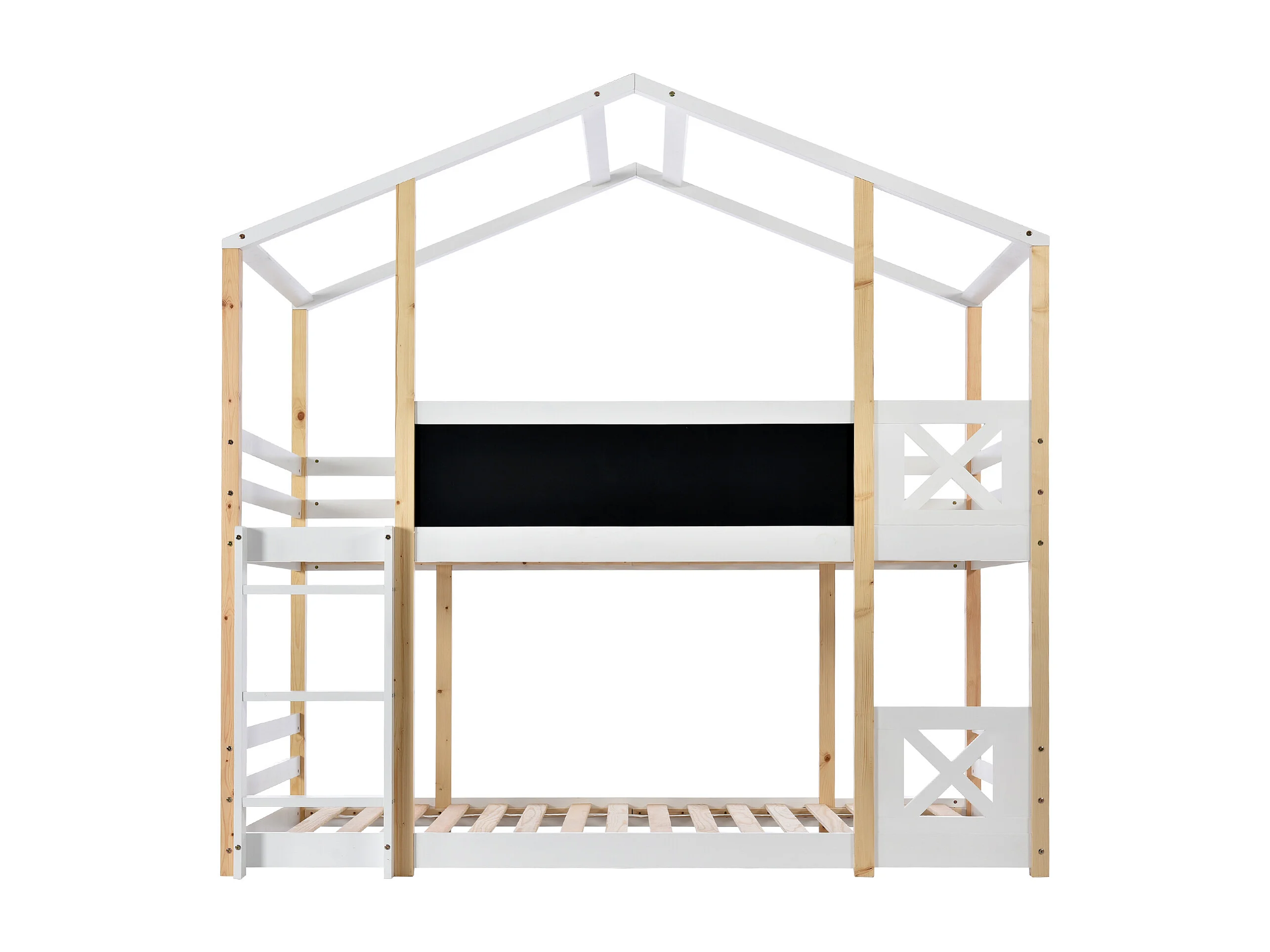 Lit enfants - Lit superposé Cabane 90 x 200 cm - Bois Massif Pin;MDF - Tableau 110 x 27 cm + 2 Sommiers - Garde-Corps - Sans Matelas - Blanc