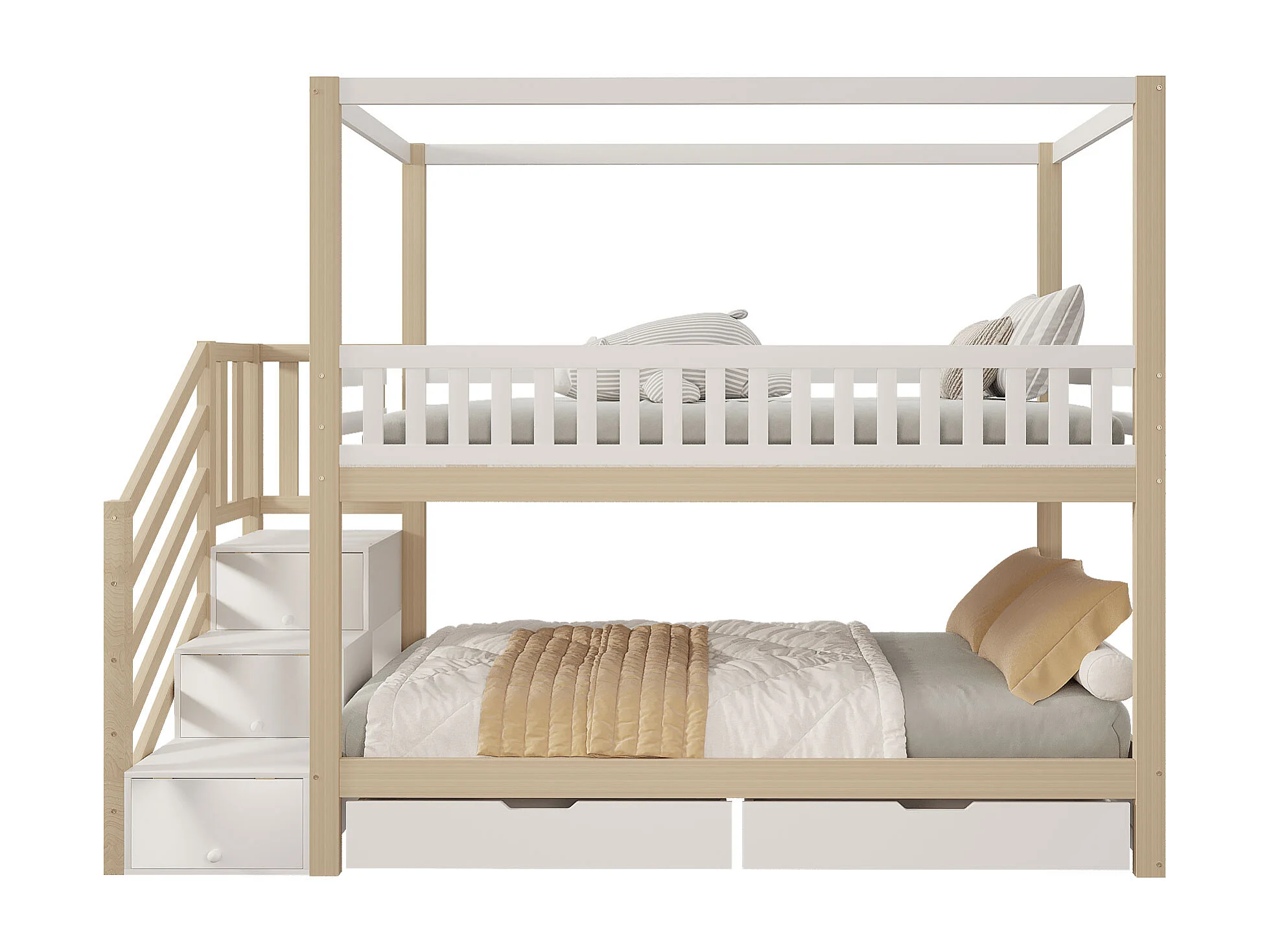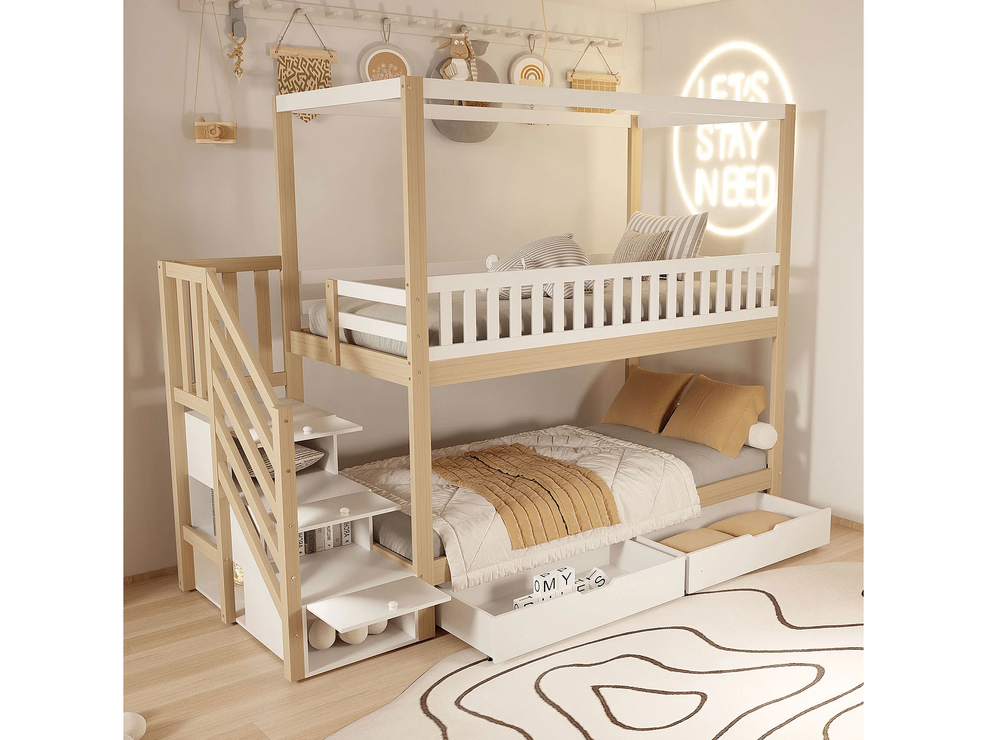 Lit superposé enfant 90x200 cm, lit double bois massif, forme maison, garde-corps sécurité, rangements et échelle, blanc et bois naturel, mixte