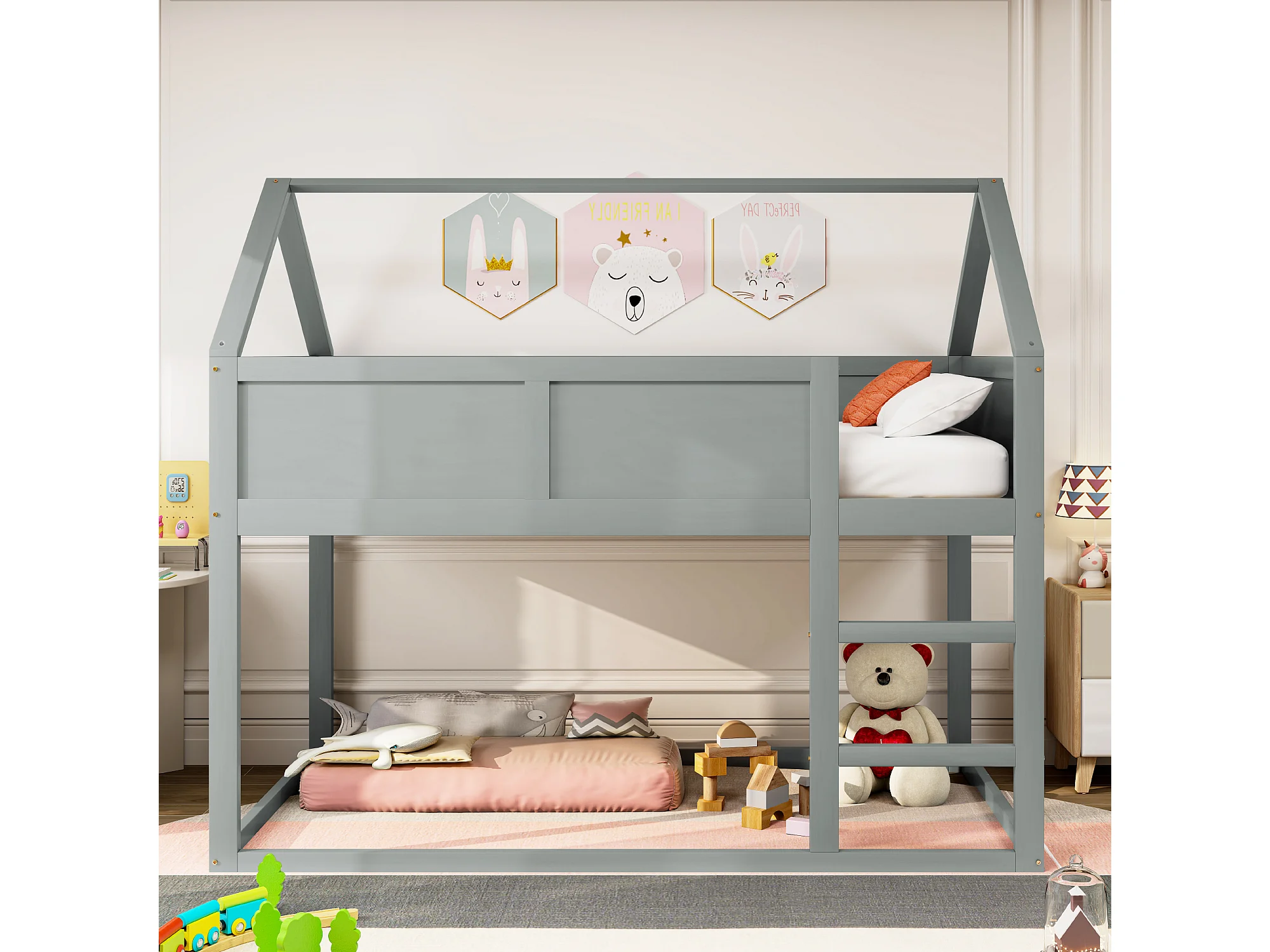 Lit superposé enfant 90x200 cm, lit simple bas, lit mezzanine avec échelle, bois massif, gris
