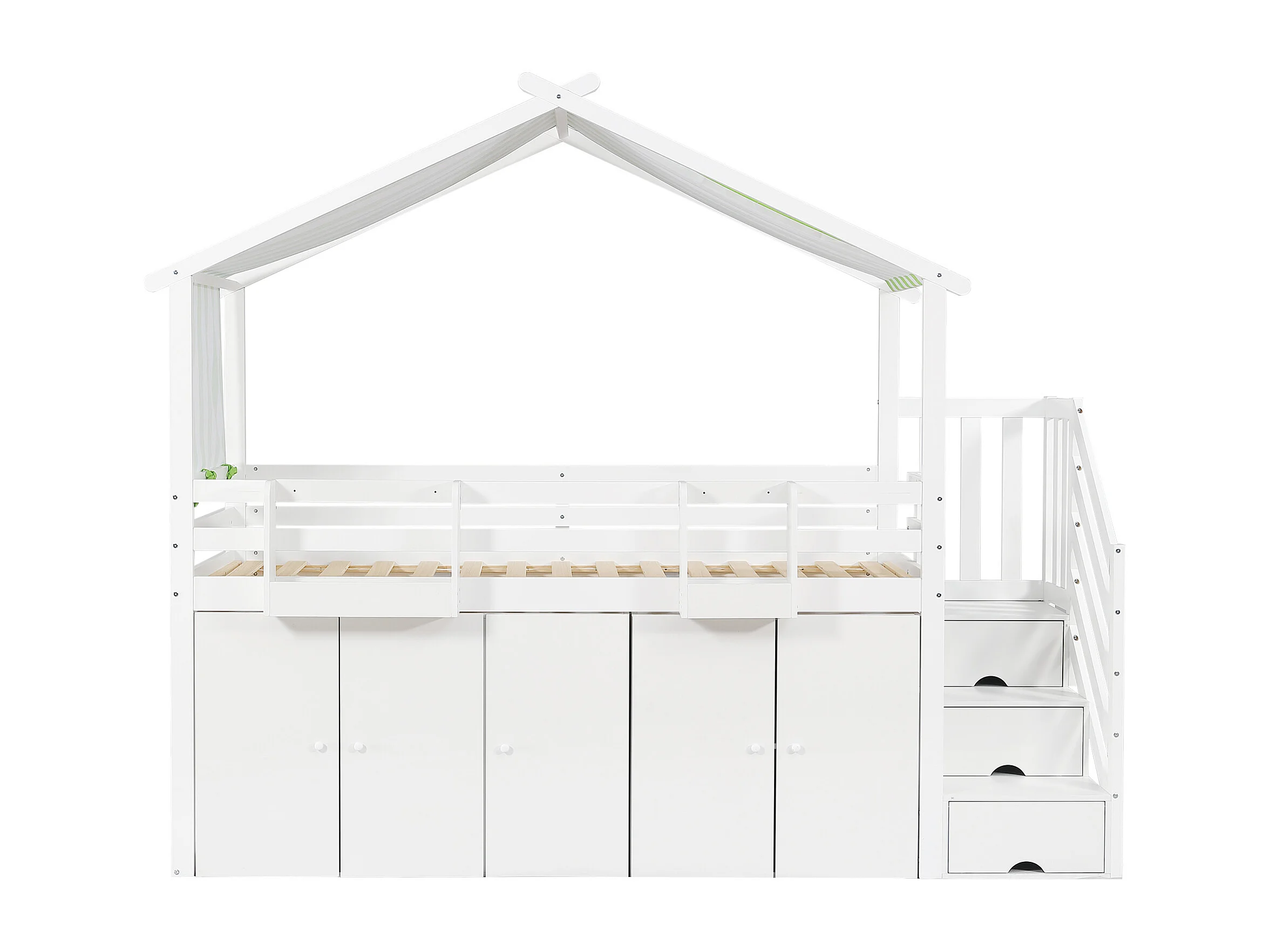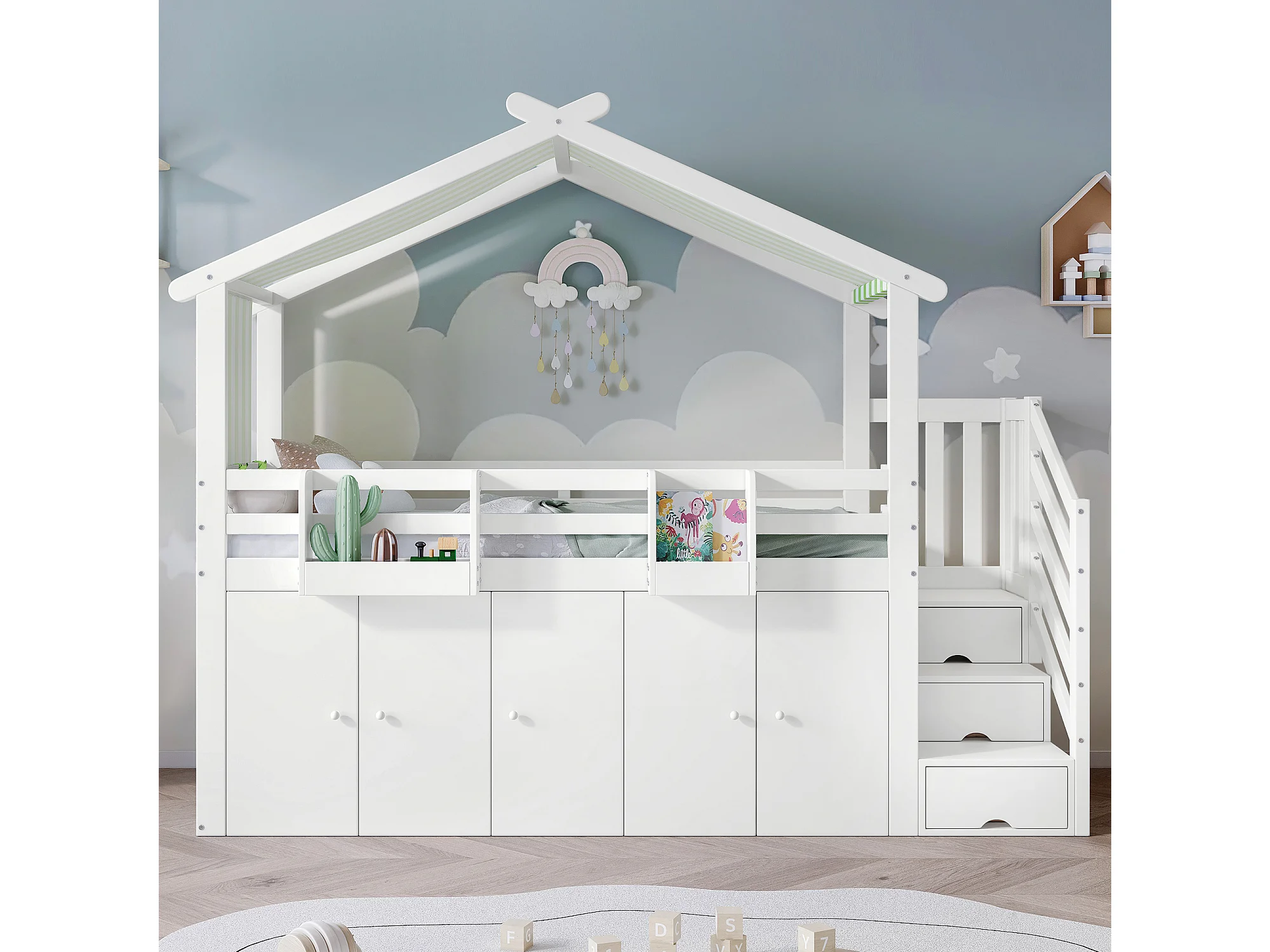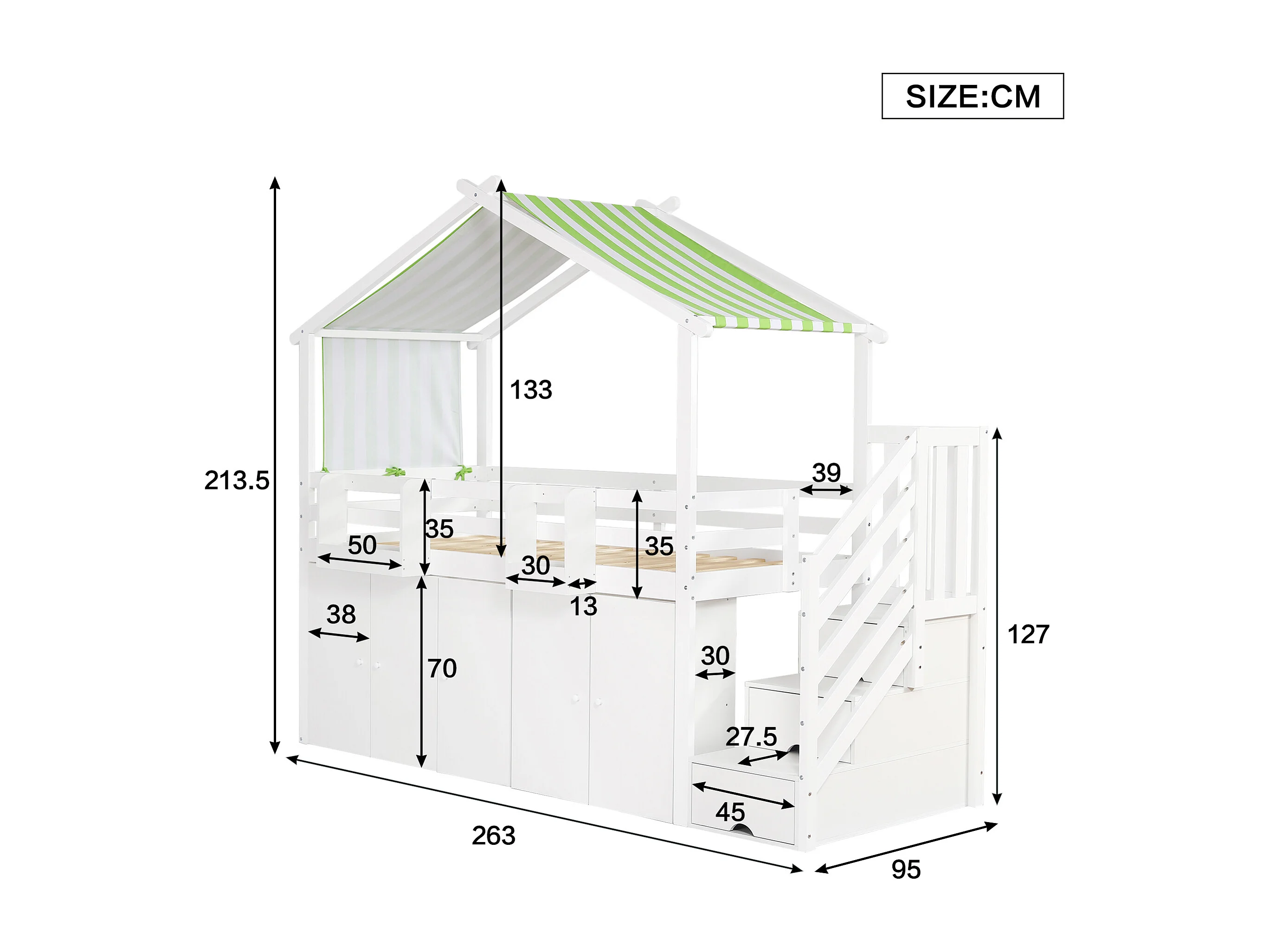 Lit Superposé Enfant 90x200 cm, Protection Anti-Chute, Armoire et Rangement, Tissu Rayé - Pin + MDF, Blanc + Vert
