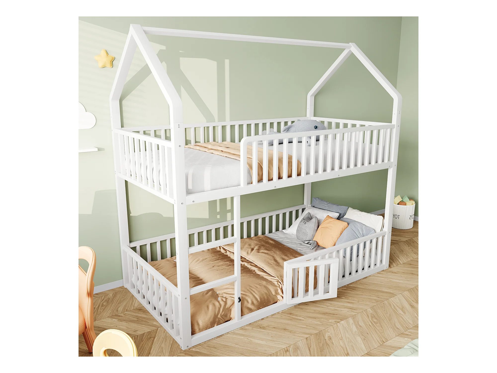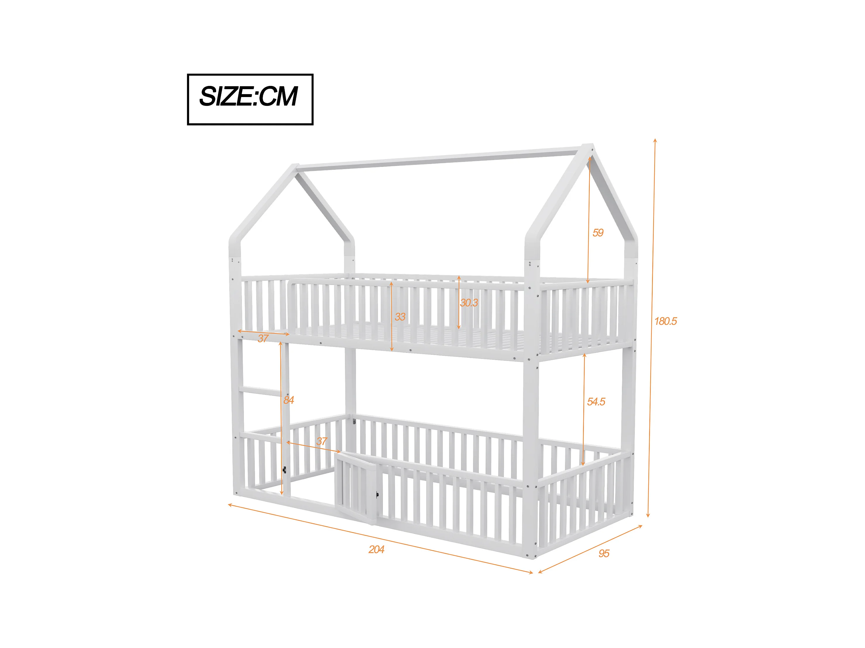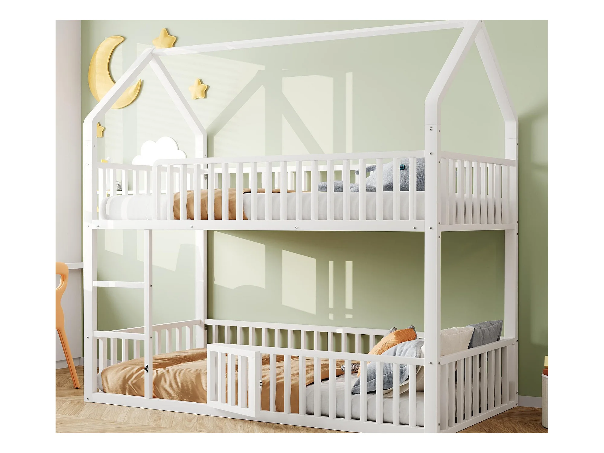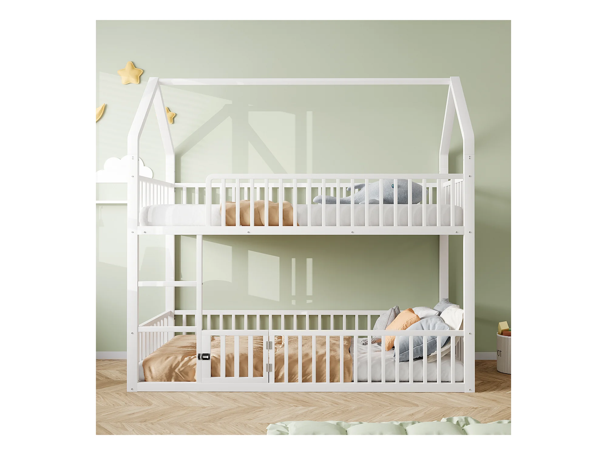 Lit superposé enfant 90x200cm - avec escalier - avec petite porte - Métal - blanc (matelas non inclus)