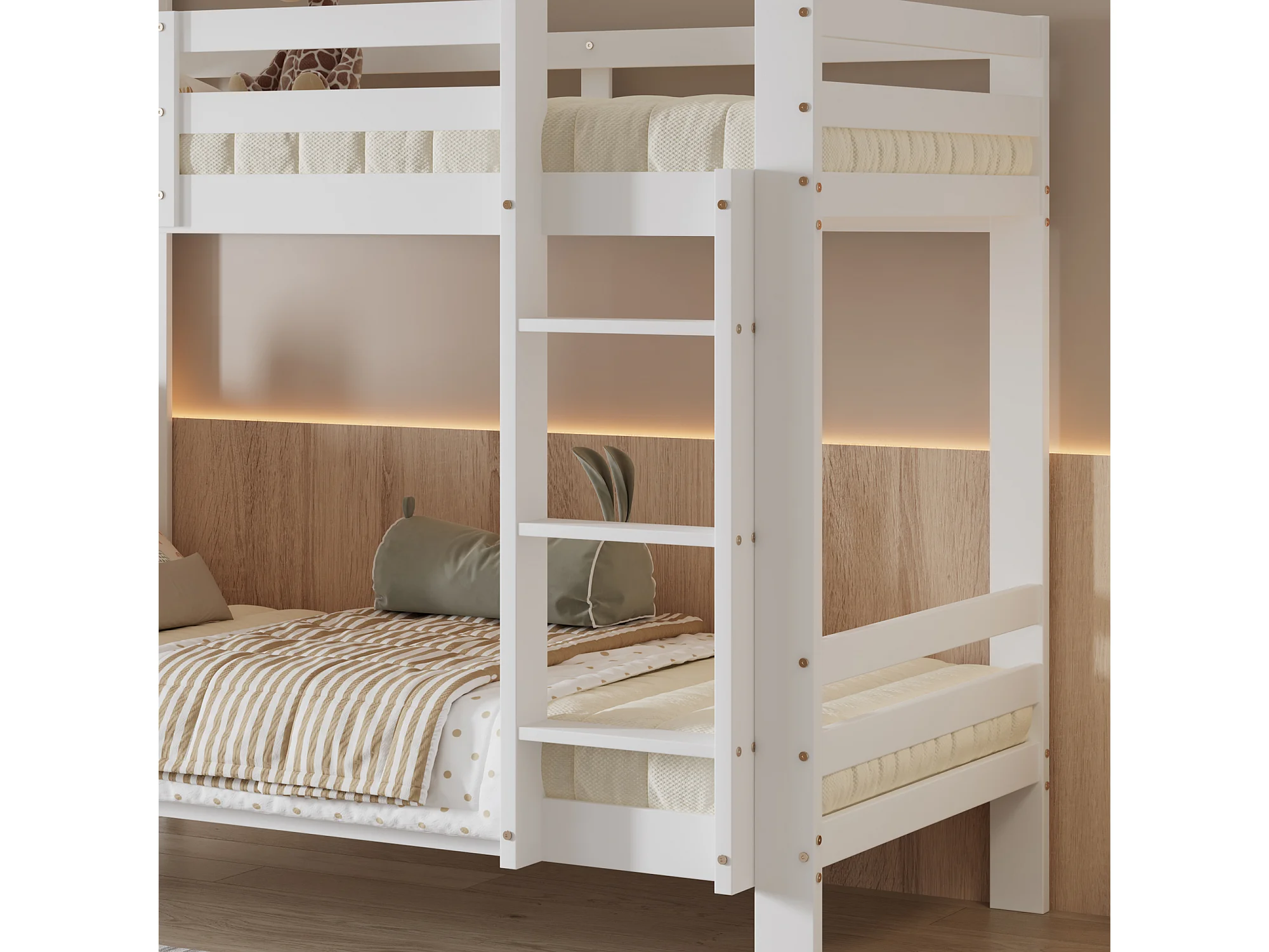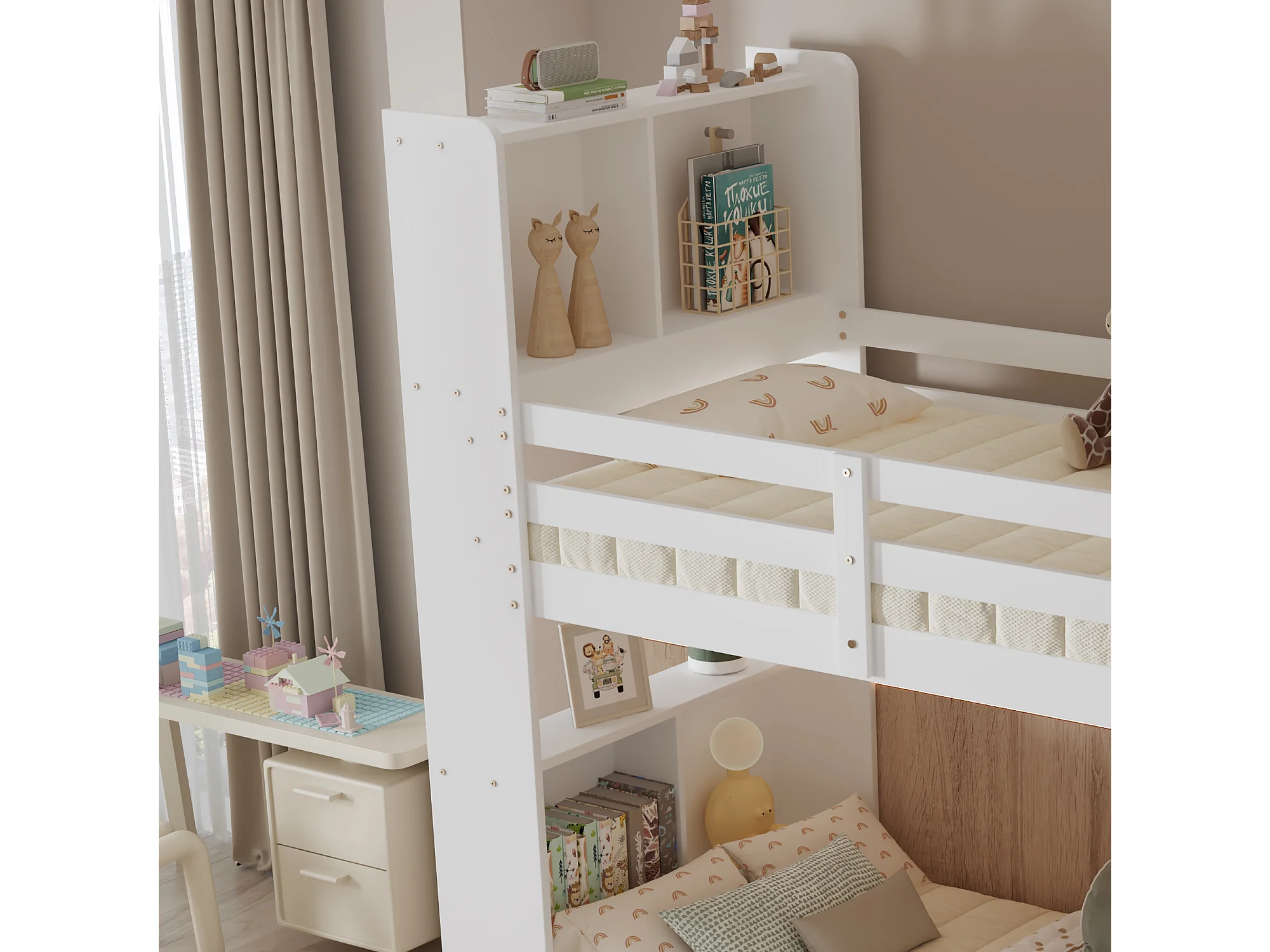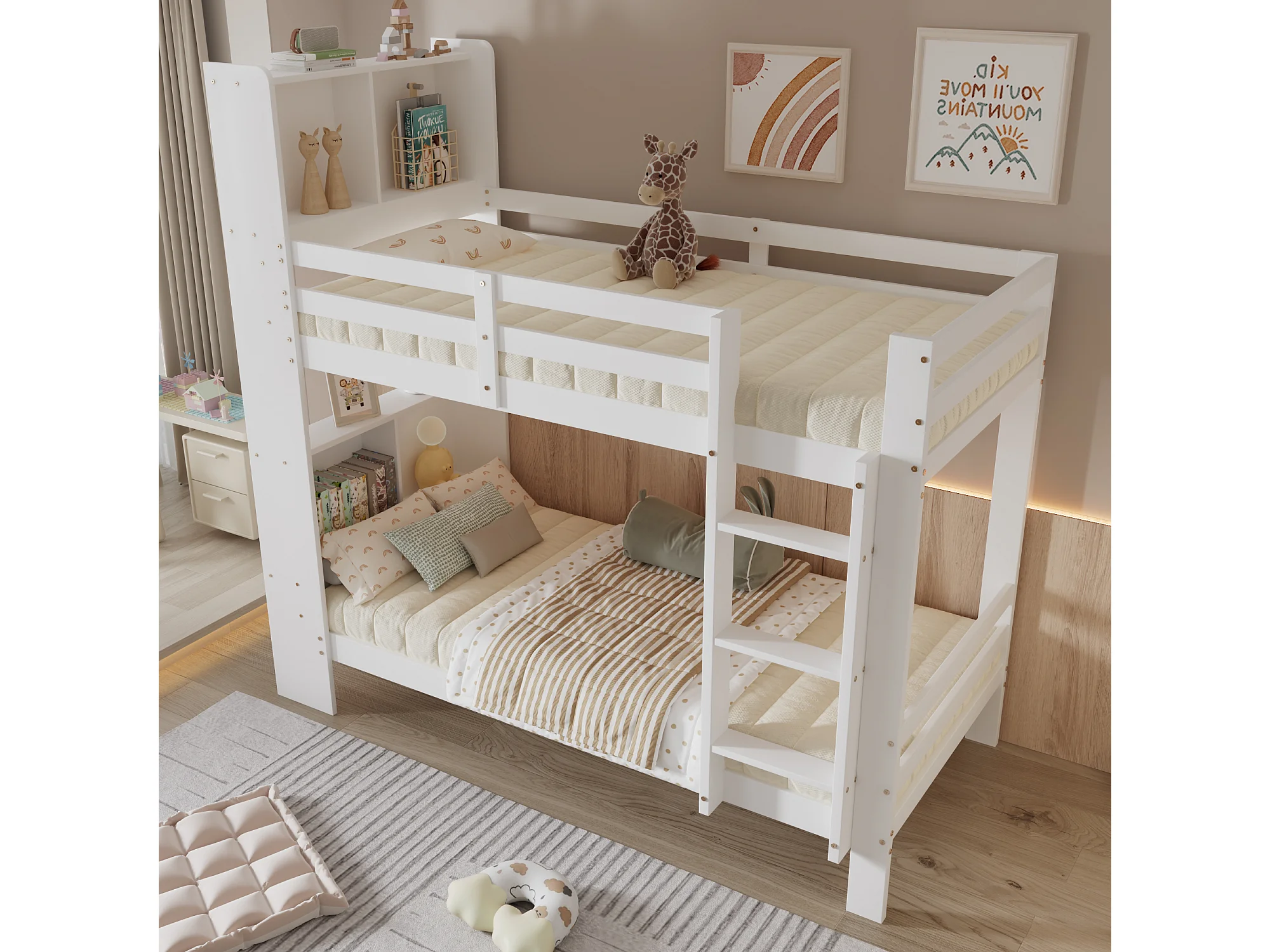 Lit superposé enfant 90x200cm avec escalier et étagères de rangement, sommier à lattes, sans matelas, blanc