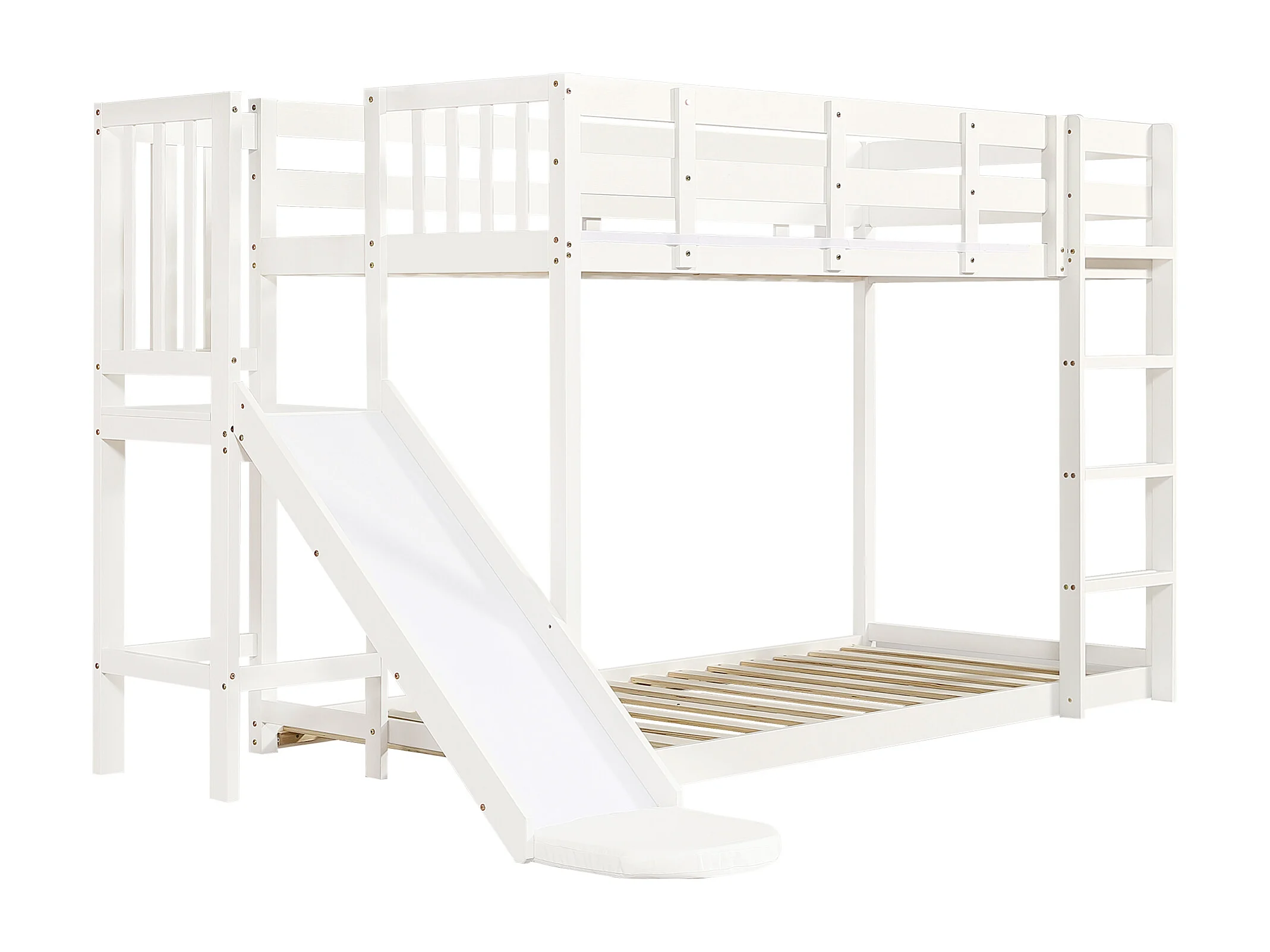 Lit superposé enfant 90x200cm avec escalier, rideaux et toboggan - Bois en pin et MDF - Blanc