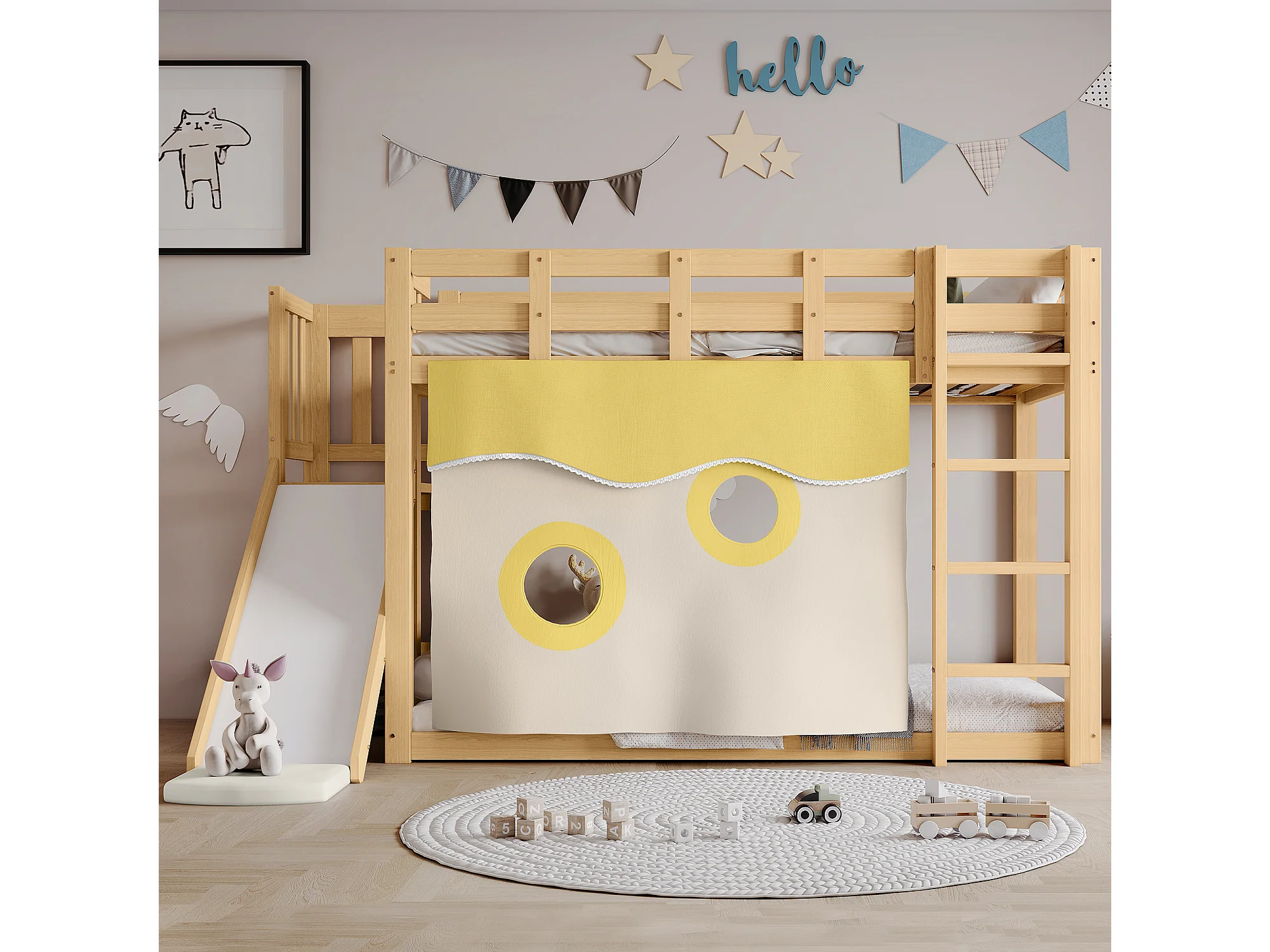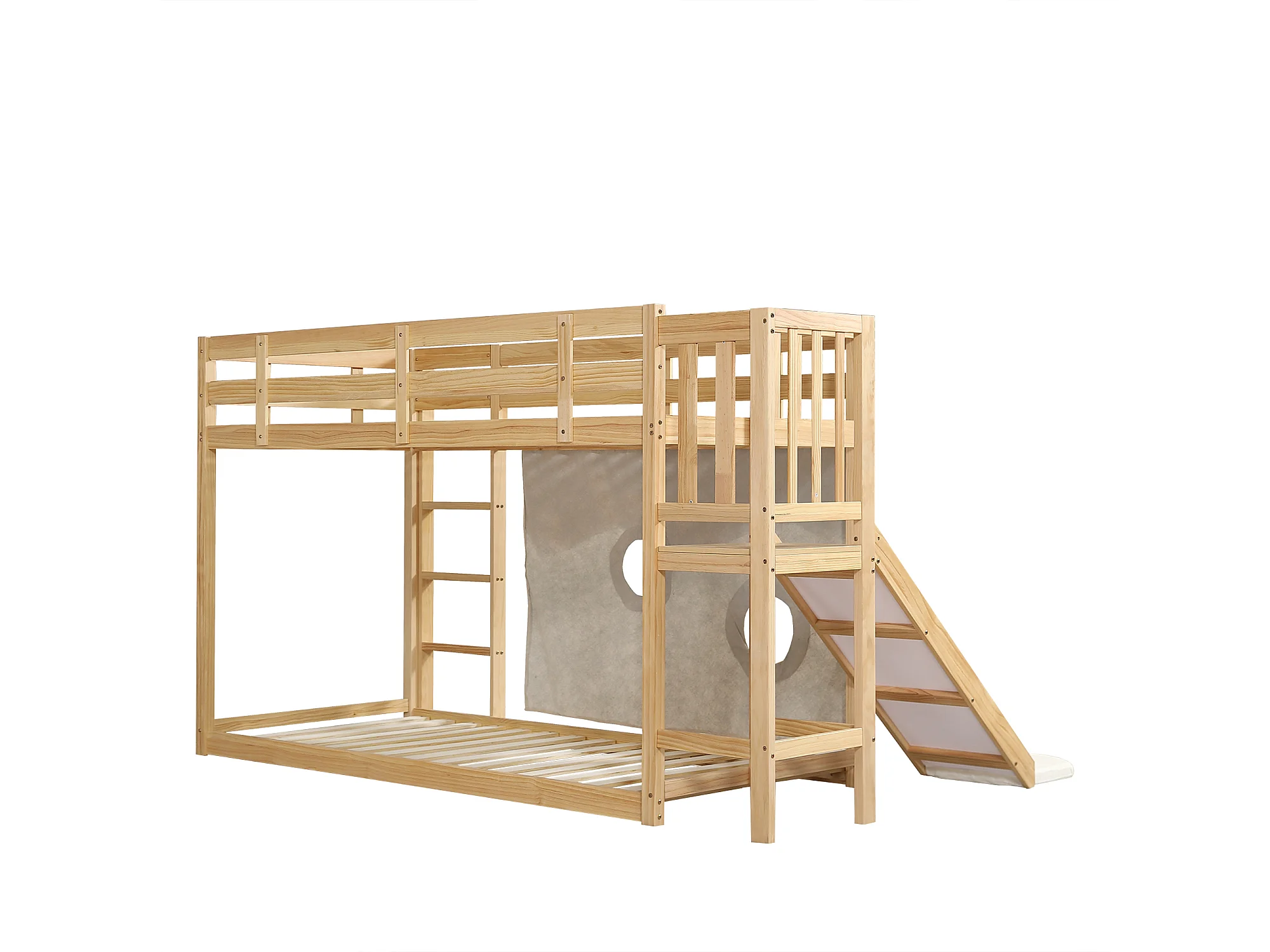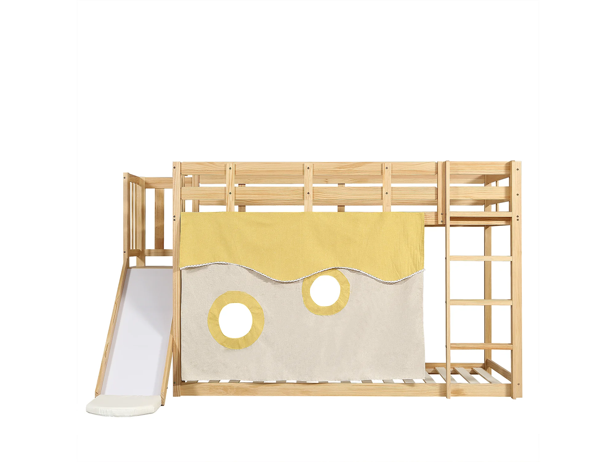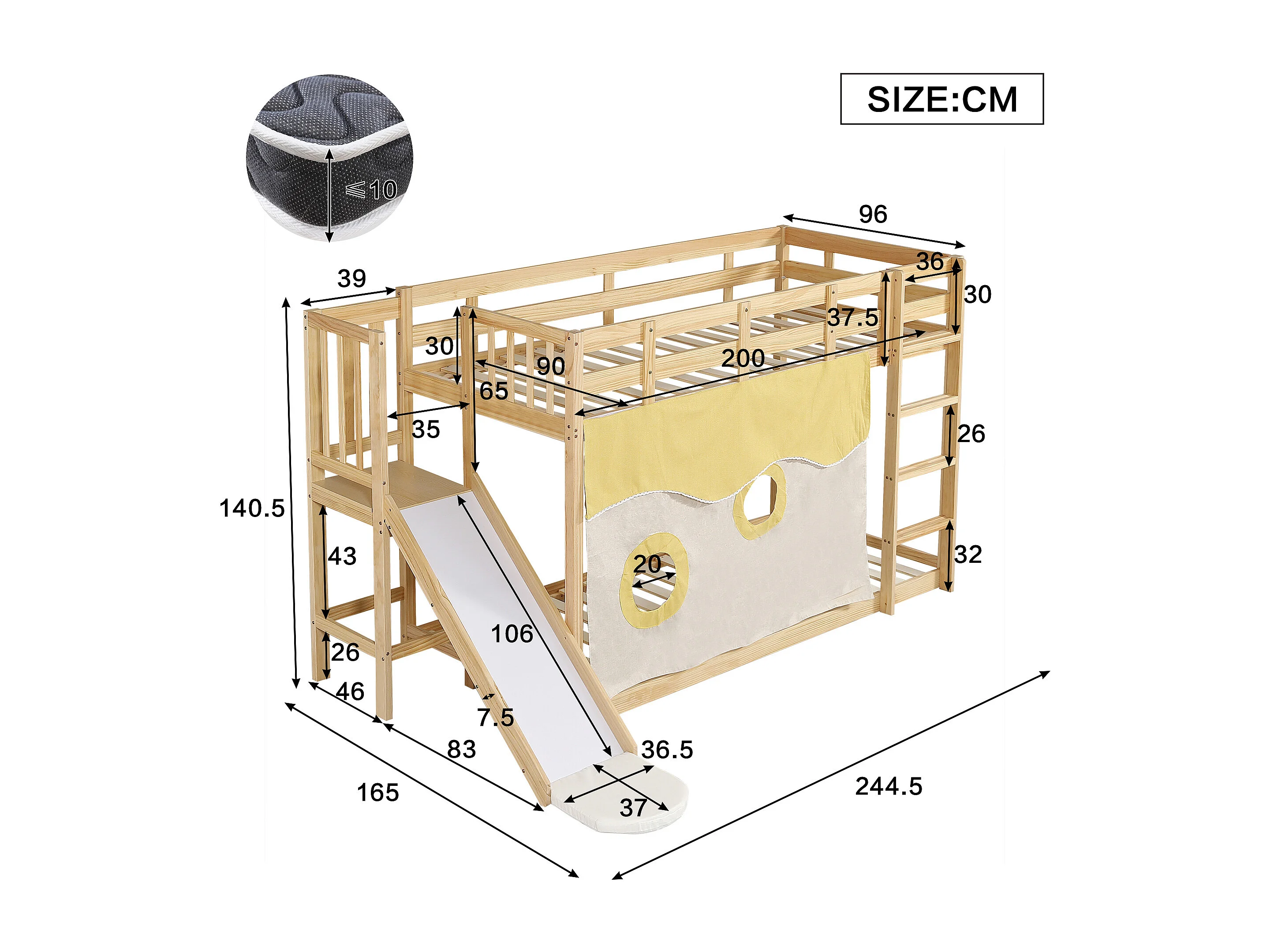 Lit superposé enfant 90x200cm avec escalier, rideaux et toboggan - Bois en pin et MDF - Couleur naturel