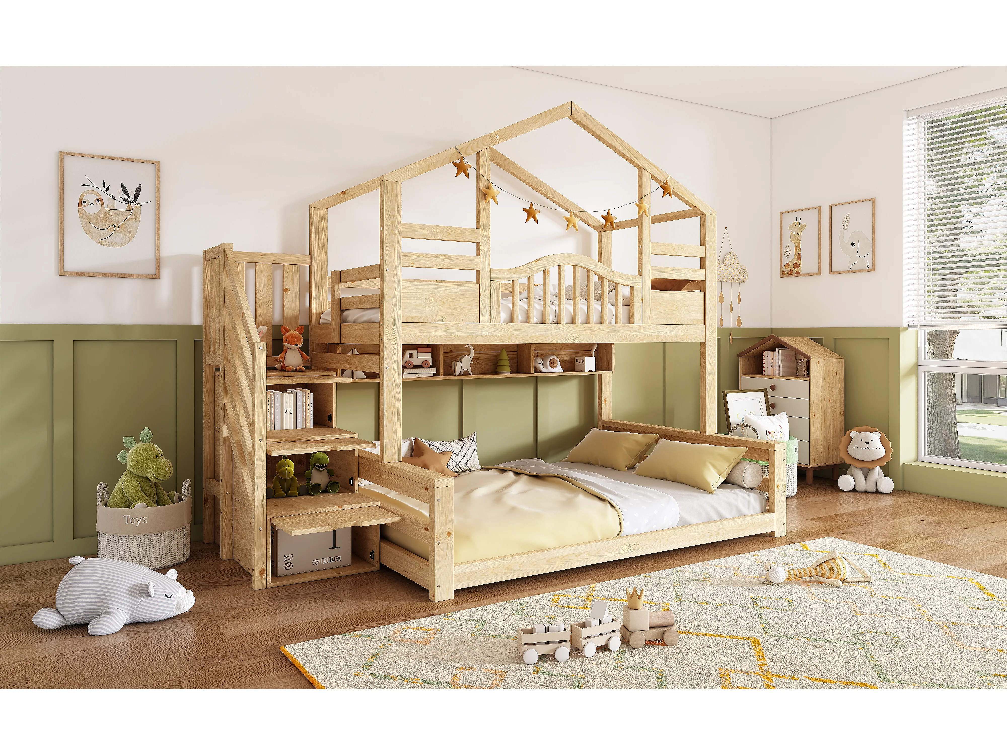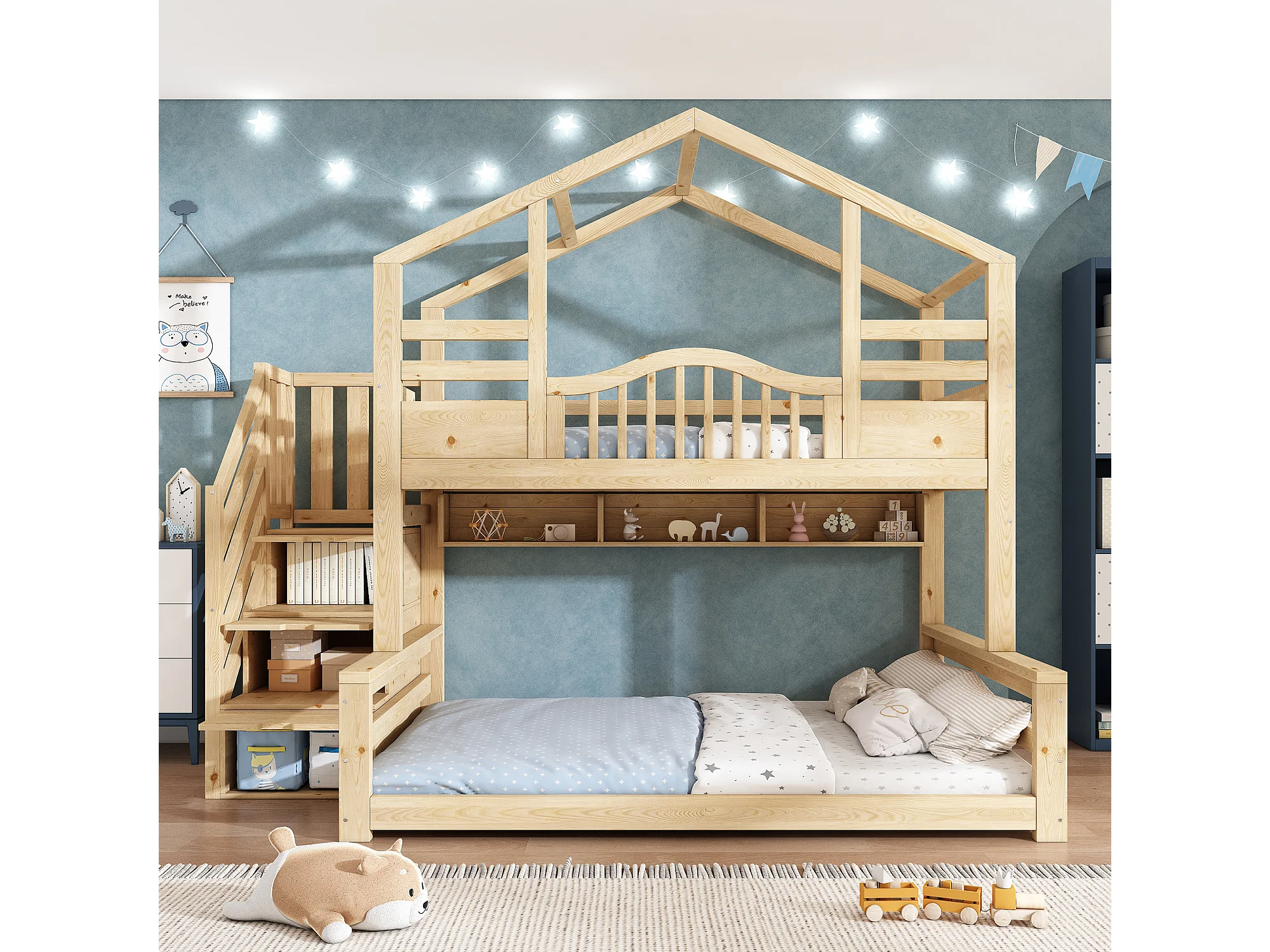 Lit superposé enfant 90x200cm et 140x200cm - Lit cabane avec rangemnet - Naturel clair
