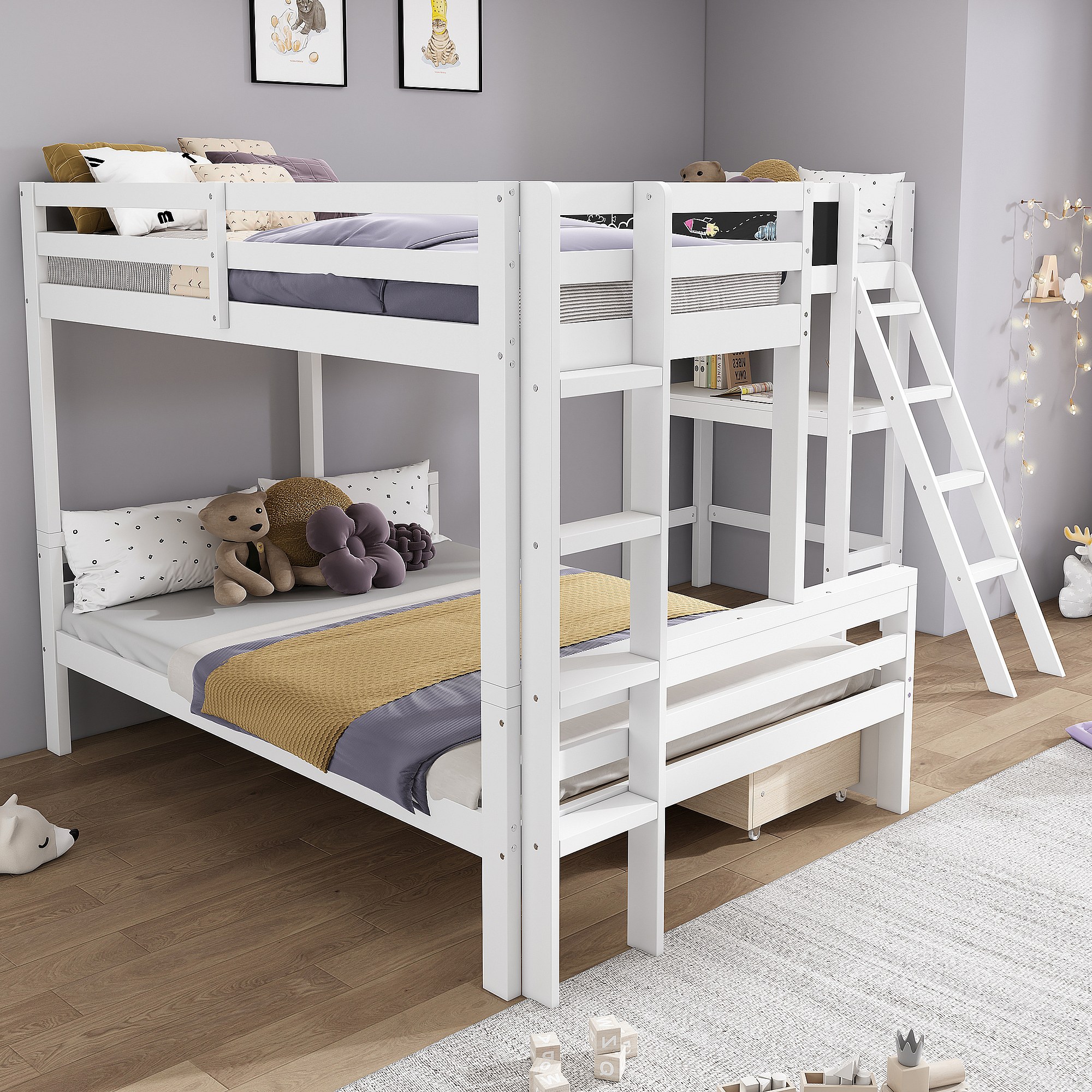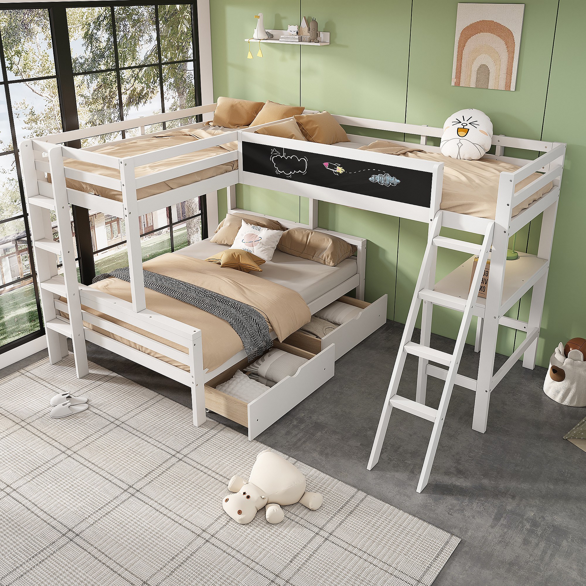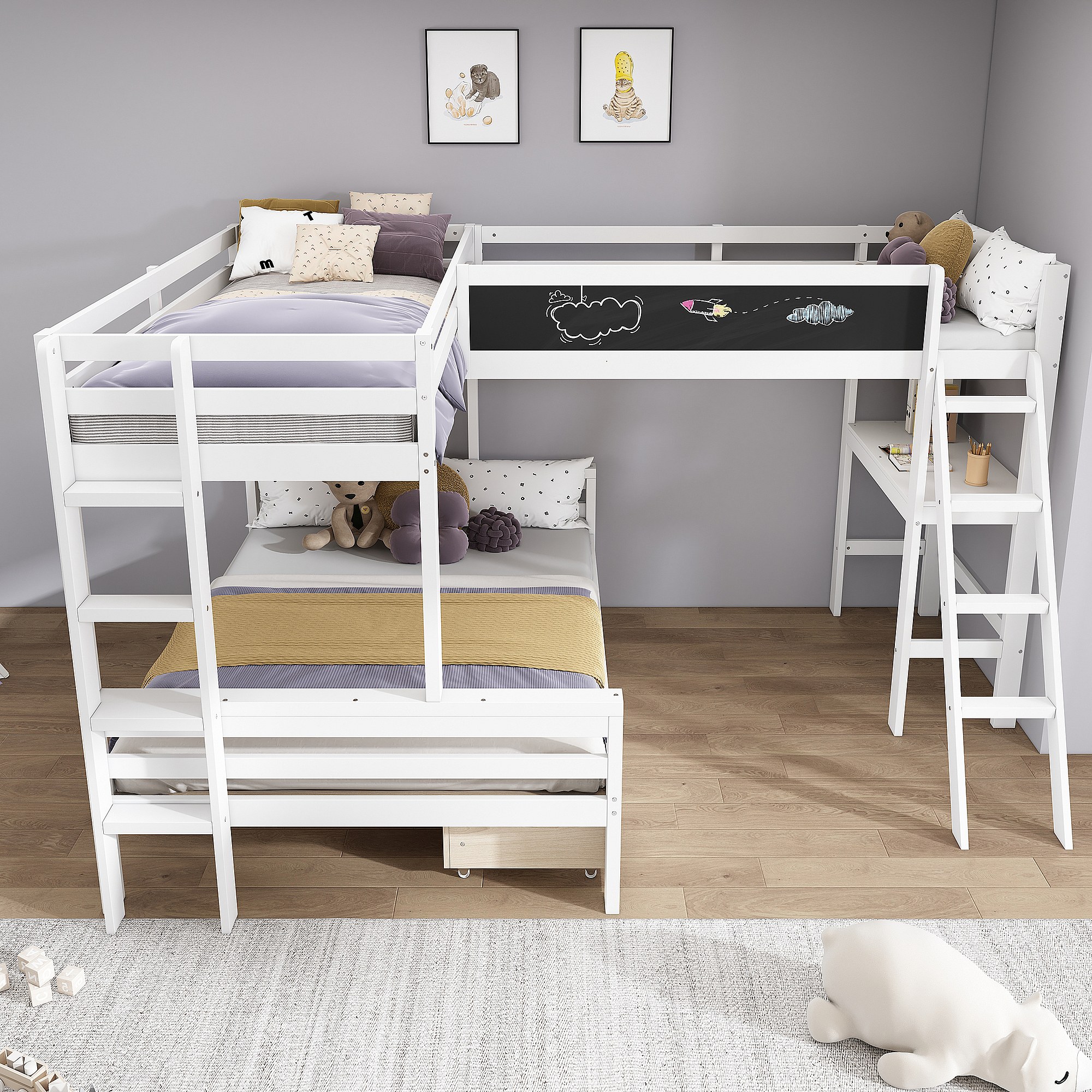 Lit superposé enfant avec bureau et rangement, en pin massif, blanc et chêne, 3 places (140x200 cm et 90x200 cm)