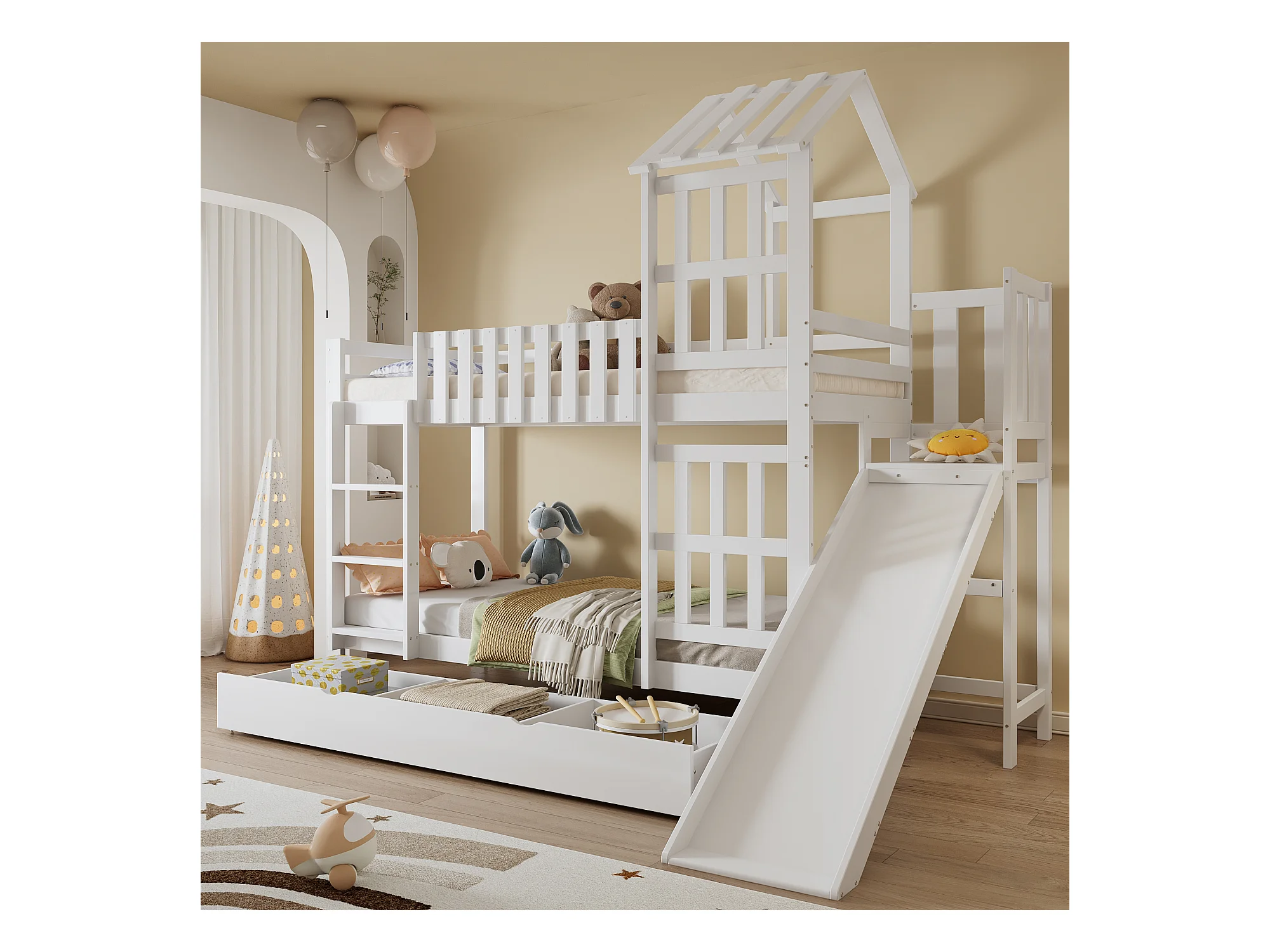 Lit superposé enfant avec tiroir roulant et toboggan, pin + MDF + contreplaqué, blanc (247.5x173.5x227cm)