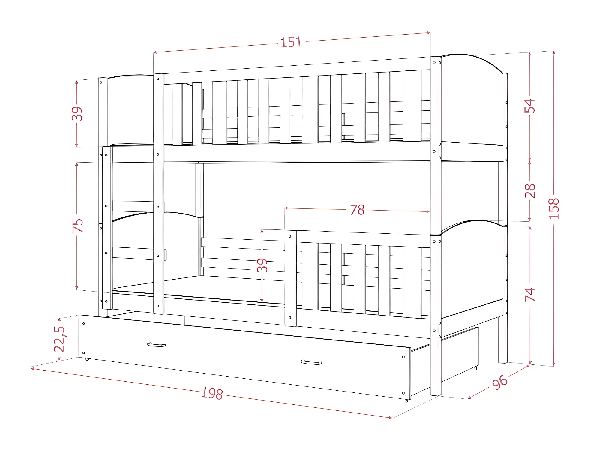 Lit superposé Tedy 90X190 cm - 2 Matelas , 2 Sommiers et Tiroir inclus Gris
