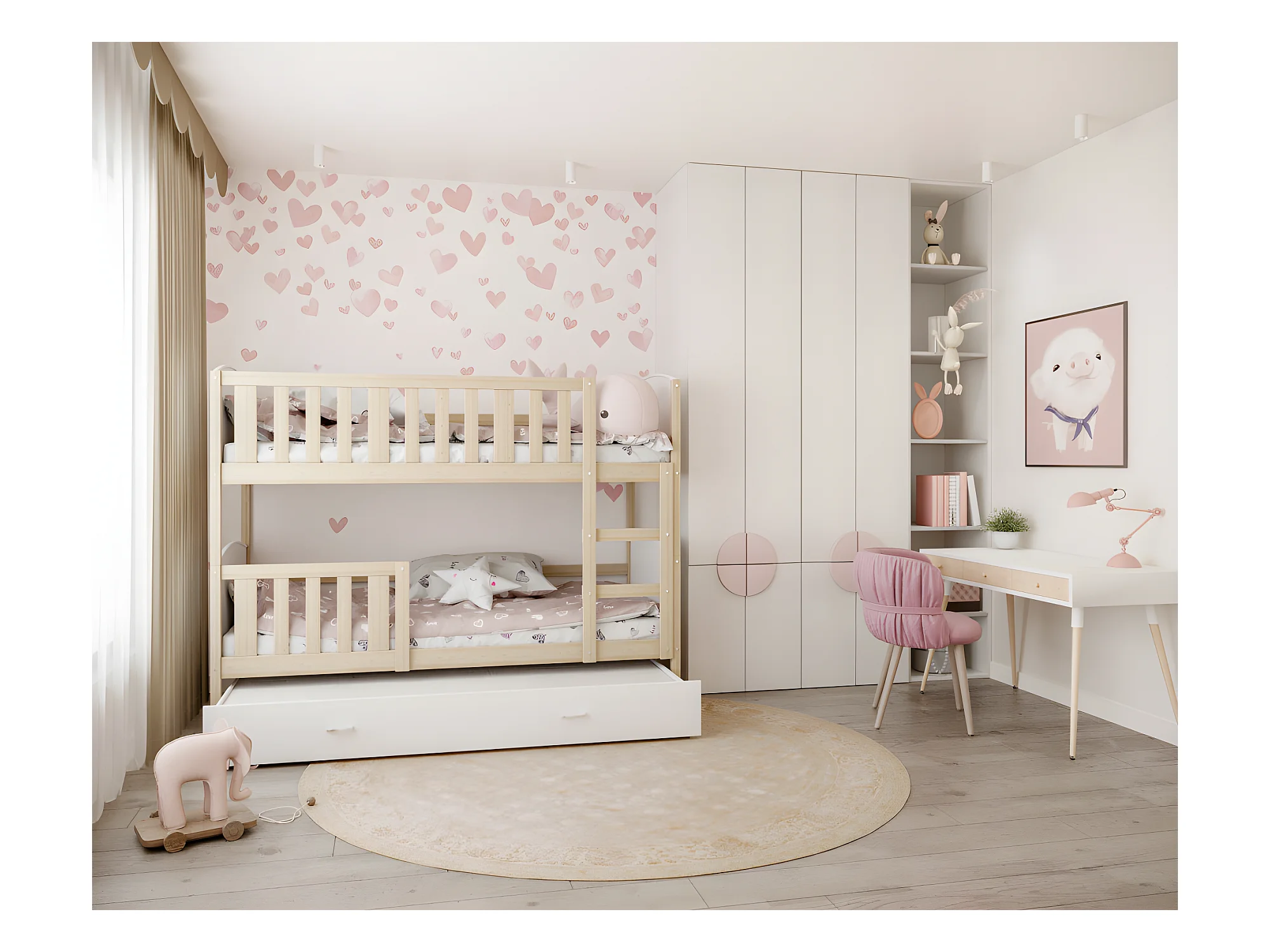 Lit superposé Tedy 90X190 cm - 2 Matelas , 2 Sommiers et Tiroir inclus Pin - Blanc